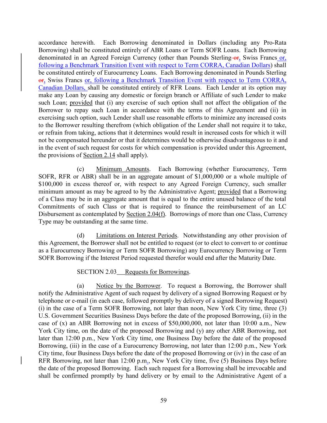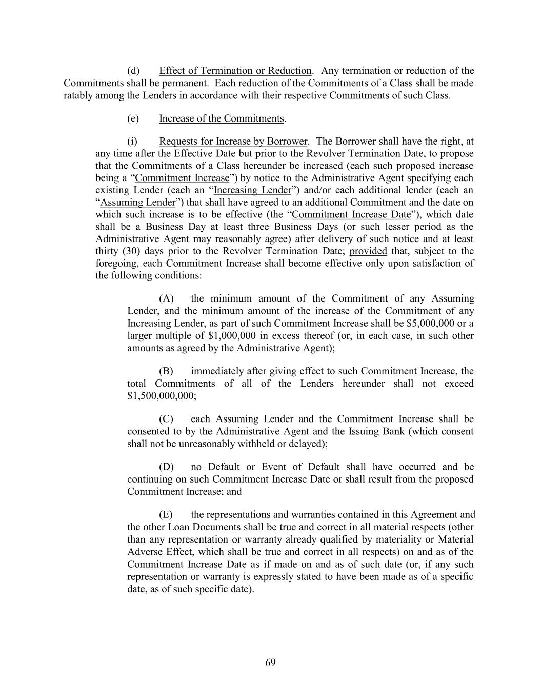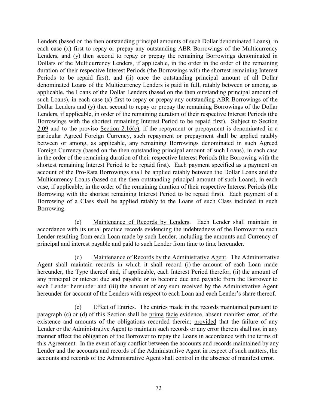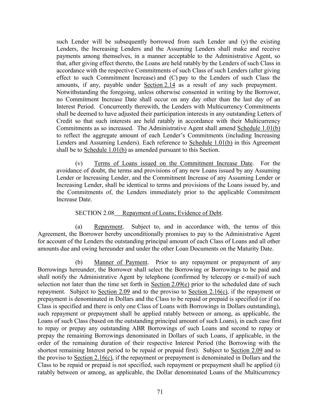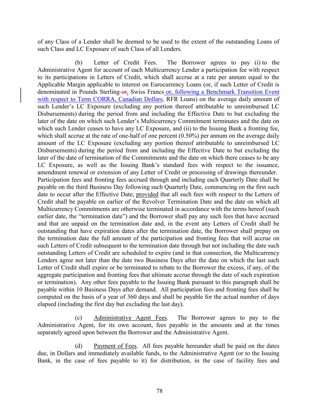subject to each such assignment (determined as of the date the Assignment and Assumption with respect to such assignment is delivered to the Administrative Agent) shall not be less than $1,000,000 unless each of the Borrower and the Administrative Agent otherwise consent; provided that no such consent of the Borrower shall be required if a Default or an Event of Default has occurred and is continuing; (B) each partial assignment of Commitments or Loans and LC Exposure of a Class shall be made as an assignment of a proportionate part of all the assigning Lender’s rights and obligations under this Agreement in respect of such Class of Commitments and Loans and LC Exposure; (C) the parties to each assignment shall execute and deliver to the Administrative Agent an Assignment and Assumption, together with a processing and recordation fee of $3,500 (which fee shall not be payable in connection with an assignment to a Lender or to an Affiliate of a Lender), for which the Borrower and the Guarantors shall not be obligated (except in the case of an assignment pursuant to Section 2.18(b)); and (D) the assignee, if it shall not already be a Lender of the applicable Class, shall deliver to the Administrative Agent an Administrative Questionnaire. (iii) Effectiveness of Assignments. Subject to acceptance and recording thereof pursuant to paragraph (c) of this Section, from and after the effective date specified in each Assignment and Assumption the assignee thereunder shall be a party hereto and, to the extent of the interest assigned by such Assignment and Assumption, have the rights and obligations of a Lender under this Agreement, and the assigning Lender thereunder shall, to the extent of the interest assigned by such Assignment and Assumption, be released from its obligations under this Agreement (and, in the case of an Assignment and Assumption covering all of the assigning Lender’s rights and obligations under this Agreement, such Lender shall cease to be a party hereto but shall continue to be entitled to the benefits of Sections 2.13, 2.14, 2.15 and 9.03 with respect to facts and circumstances occurring prior to the effective date of such assignment). Any assignment or transfer by a Lender of rights or obligations under this Agreement that does not comply with this Section 9.04 shall be treated for purposes of this Agreement as a sale by such Lender of a participation in such rights and obligations in accordance with paragraph (f) of this Section. (c) Maintenance of Registers by Administrative Agent. The Administrative Agent, acting solely for this purpose as a non-fiduciary agent of the Borrower, shall maintain at one of its offices in New York City a copy of each Assignment and Assumption delivered to it and a register for the recordation of the names and addresses of the Lenders, and the Commitments of, and principal amount and stated interest of the Loans and LC Disbursements owing to, each Lender pursuant to the terms hereof from time to time (the “Registers” and each individually, a “Register”). The entries in the Registers shall be conclusive absent manifest error, and the Borrower, the Administrative Agent, the Issuing Bank and the Lenders shall treat each Person whose name is recorded in the Registers pursuant to the terms hereof as a Lender 169