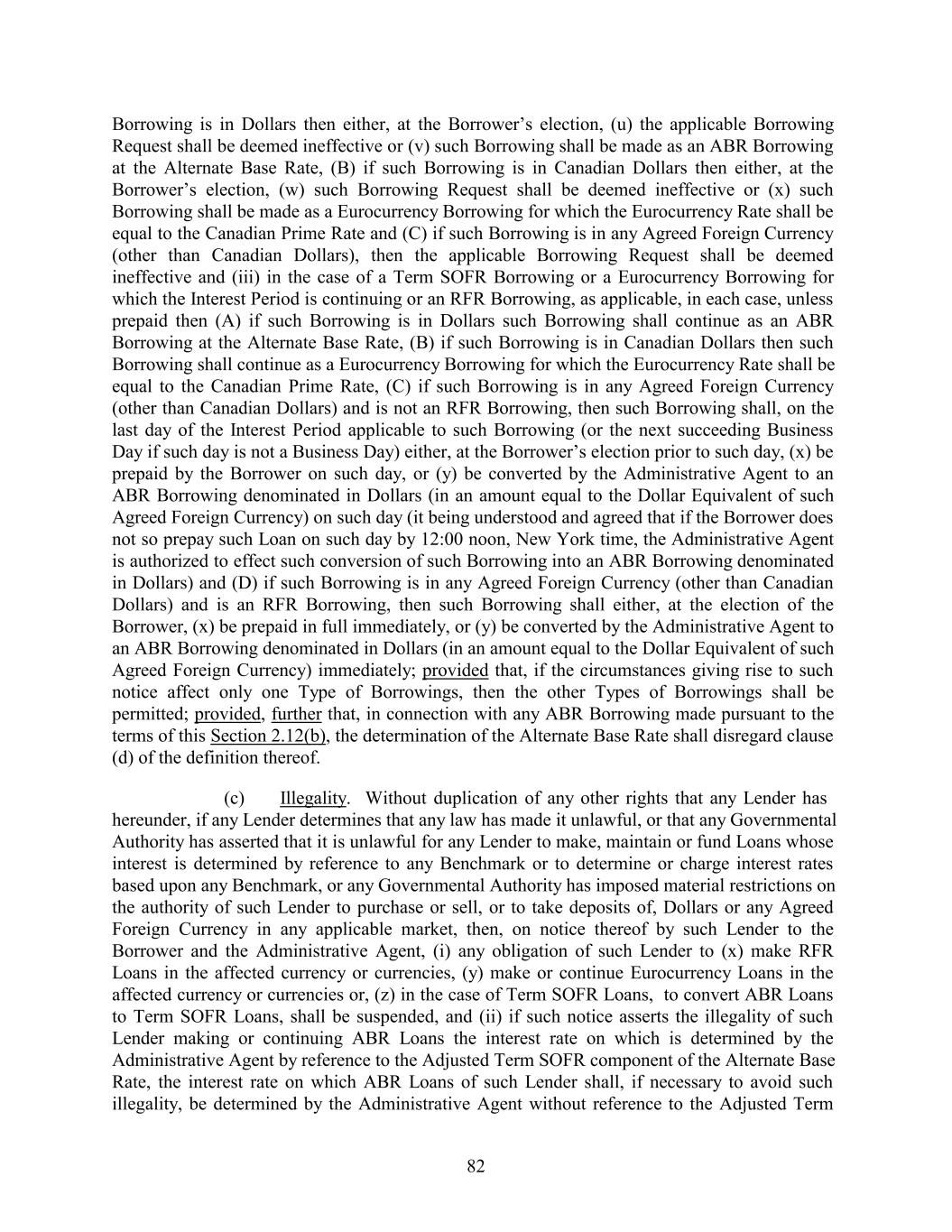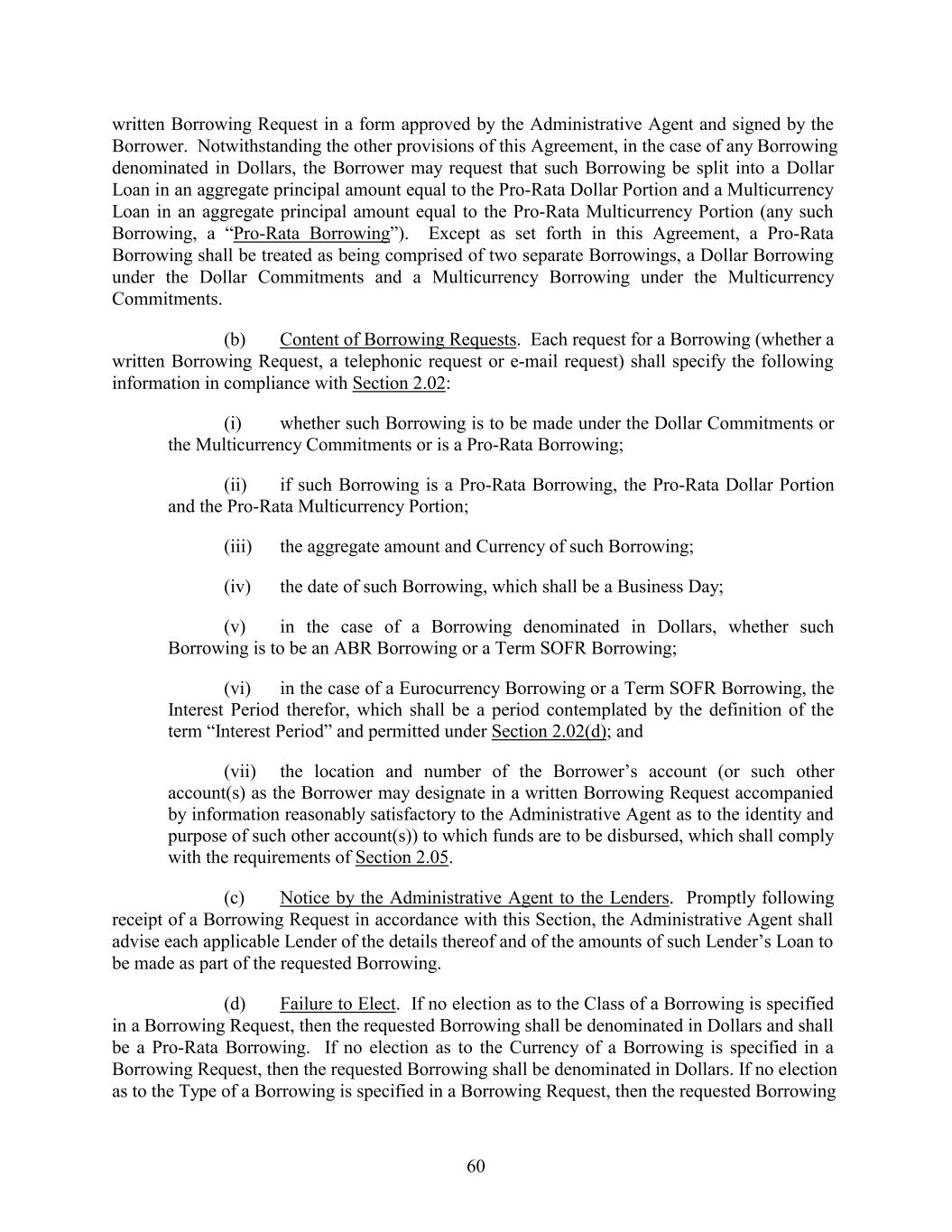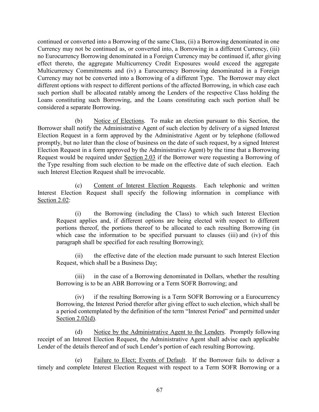 ADMINISTRATIVE AGENT’S TRANSMISSION OF COMMUNICATIONS THROUGH THE INTERNET OR THE APPROVED ELECTRONIC PLATFORM. (v) Each Lender and Issuing Bank agrees that notice to it (as provided in the next sentence) specifying that Communications have been posted to the Approved Electronic Platform shall constitute effective delivery of the Communications to such Lender or Issuing Bank for purposes of the Loan Documents; provided that the foregoing shall not apply to notices to any Lender or the Issuing Bank pursuant to Section 2.03 if such Lender or the Issuing Bank, as applicable, has notified the Administrative Agent that it is incapable of receiving notices under such Article by electronic communication. Each Lender and Issuing Bank agrees (A) to notify the Administrative Agent in writing (which could be in the form of electronic communication) from time to time of such Lender’s or Issuing Bank’s email address to which the foregoing notice may be sent by electronic transmission and (B) that the foregoing notice may be sent to such email address. (vi) Each of the Lenders, Issuing Bank and Obligors agrees that the Administrative Agent may, but (except as may be required by applicable law) shall not be obligated to, store the Communications on the Approved Electronic Platform in accordance with the Administrative Agent’s generally applicable document retention policies and procedures. (vii) Nothing herein shall prejudice the right of the Administrative Agent, any Lender or Issuing Bank to give any notice or other communication pursuant to any Loan Document in any other manner specified in such Loan Document. (viii) “Communications” means, collectively, any notice, demand, communication, information, document or other material provided by or on behalf of any Obligor pursuant to any Loan Document or the transactions contemplated therein which is distributed by the Administrative Agent, any Lender or Issuing Bank by means of electronic communications pursuant to this Section, including through an Approved Electronic Platform. SECTION 9.02 Waivers; Amendments. (a) No Deemed Waivers; Remedies Cumulative. No failure or delay by the Administrative Agent, the Issuing Bank or any Lender in exercising any right or power hereunder shall operate as a waiver thereof nor shall any single or partial exercise of any such right or power, or any abandonment or discontinuance of steps to enforce such a right or power, preclude any other or further exercise thereof or the exercise of any other right or power. The rights and remedies of the Administrative Agent, the Issuing Bank and the Lenders hereunder are cumulative and are not exclusive of any rights or remedies that they would otherwise have. No waiver of any provision of this Agreement or consent to any departure by the Borrower therefrom shall in any event be effective unless the same shall be permitted by paragraph (b) of this Section, and then such waiver or consent shall be effective only in the specific instance and for the purpose for which given. Without limiting the generality of the foregoing, the making of a Loan or issuance of a Letter of Credit shall not be construed as a waiver of any Default or 161