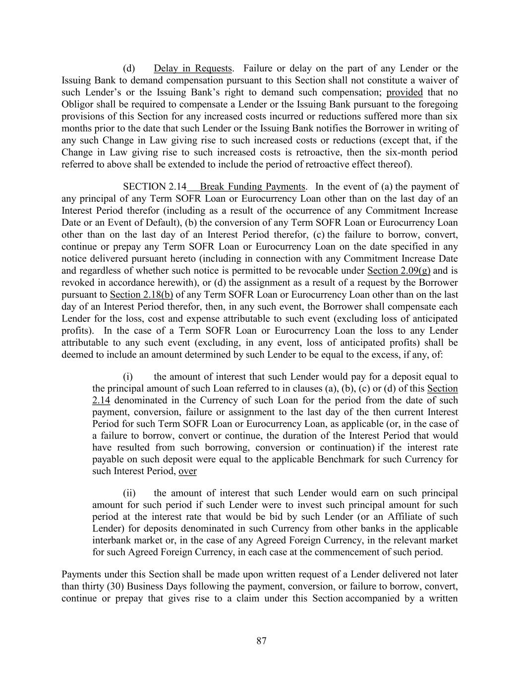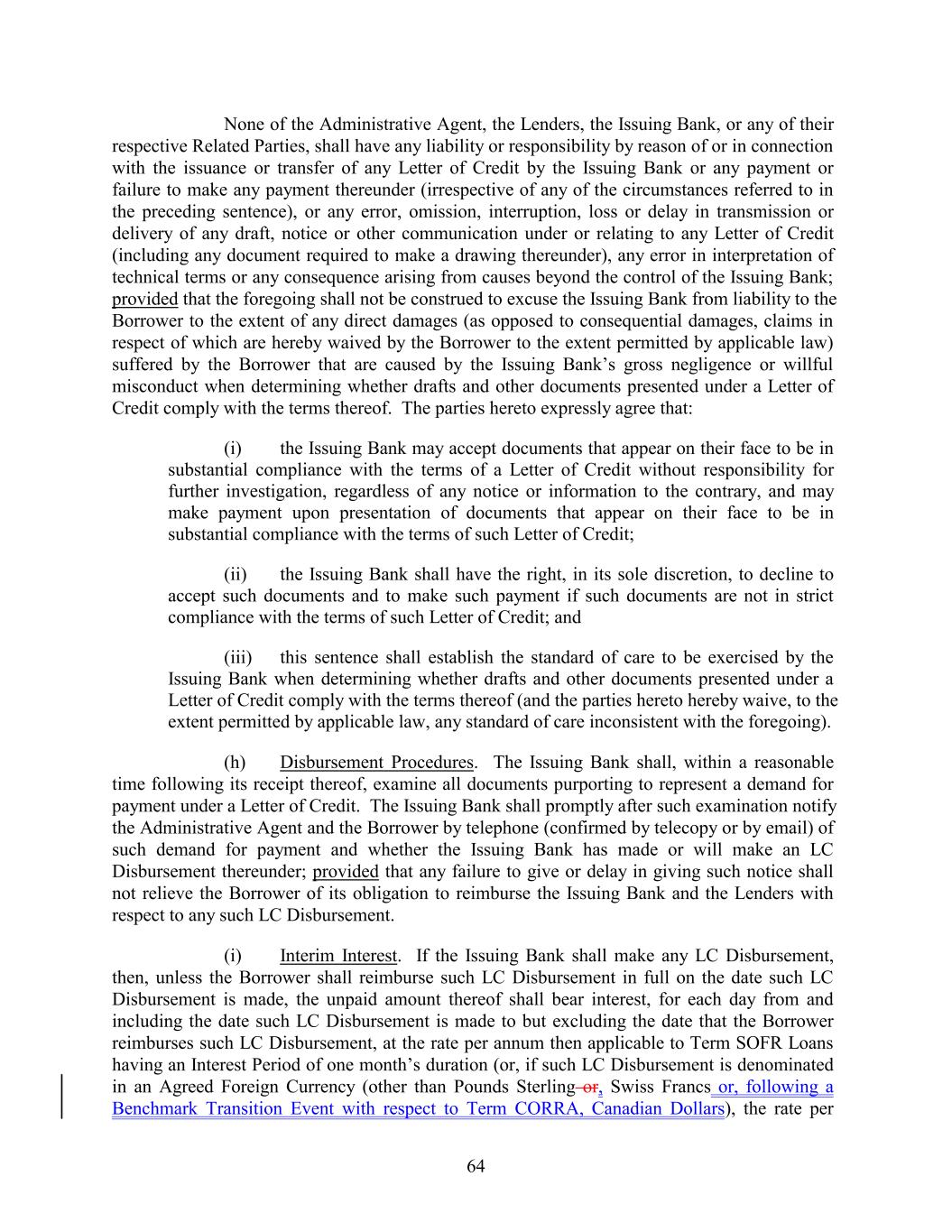 (d) Waiver of Consequential Damages, Etc. To the extent permitted by applicable law, the Borrower shall not assert, and hereby waives, any claim against any Indemnitee, on any theory of liability, for special, indirect, consequential or punitive damages (as opposed to direct or actual damages) arising out of, in connection with, or as a result of, this Agreement or any agreement or instrument contemplated hereby, the Transactions, any Loan or Letter of Credit or the use of the proceeds thereof. No Indemnitee shall be liable for any damages arising from the use by unauthorized Persons of any information or other materials distributed by it through telecommunications, electronic or other information transmission systems in connection with this Agreement or the other Loan Documents or the transactions contemplated hereby or thereby, except to the extent caused by the willful misconduct or gross negligence of such Indemnitee, as determined by a final, non-appealable judgment of a court of competent jurisdiction. (e) Payments. All amounts due under this Section shall be payable promptly after written demand therefor. (f) No Fiduciary Relationship. The Administrative Agent, each Lender and their Affiliates (collectively, solely for purposes of this paragraph, the “Lenders”), may have economic interests that conflict with those of the Borrower or any of its Subsidiaries, their stockholders and/or their affiliates. The Borrower, on behalf of itself and each of its Subsidiaries, agrees that nothing in the Loan Documents or otherwise will be deemed to create an advisory, fiduciary or agency relationship or fiduciary or other implied duty between the Lender, on the one hand, and the Borrower or any of its Subsidiaries, its stockholders or its Affiliates, on the other. The Borrower and each of its Subsidiaries each acknowledge and agree that (i) the transactions contemplated by the Loan Documents (including the exercise of rights and remedies hereunder and thereunder) are arm’s-length commercial transactions between the Lenders, on the one hand, and the Borrower and its Subsidiaries, on the other, and (ii) in connection therewith and with the process leading thereto, (x) except as otherwise provided in any of the Loan Documents, no Lender has assumed an advisory or fiduciary responsibility in favor of the Borrower or any of its Subsidiaries, any of their stockholders or affiliates (irrespective of whether any Lender has advised, is currently advising or will advise the Borrower or any of its Subsidiaries, their stockholders or their affiliates on other matters) and (y) each Lender is acting hereunder solely as principal and not as the agent or fiduciary of the Borrower or any of its Subsidiaries, their management or stockholders. The Borrower and each Obligor each acknowledge and agree that it has consulted legal and financial advisors to the extent it deemed appropriate and that it is responsible for making its own independent judgment with respect to such transactions and the process leading thereto. The Borrower and each Obligor each agree that it will not claim that any Lender has rendered advisory services hereunder of any nature or respect, or owes a fiduciary duty to the Borrower or any of its Subsidiaries, in each case, in connection with such transactions contemplated hereby or the process leading thereto. SECTION 9.04 Successors and Assigns. (a) Assignments Generally. The provisions of this Agreement shall be binding upon and inure to the benefit of the parties hereto and their respective successors and assigns permitted hereby (including any Affiliate of the Issuing Bank that issues any Letter of 167