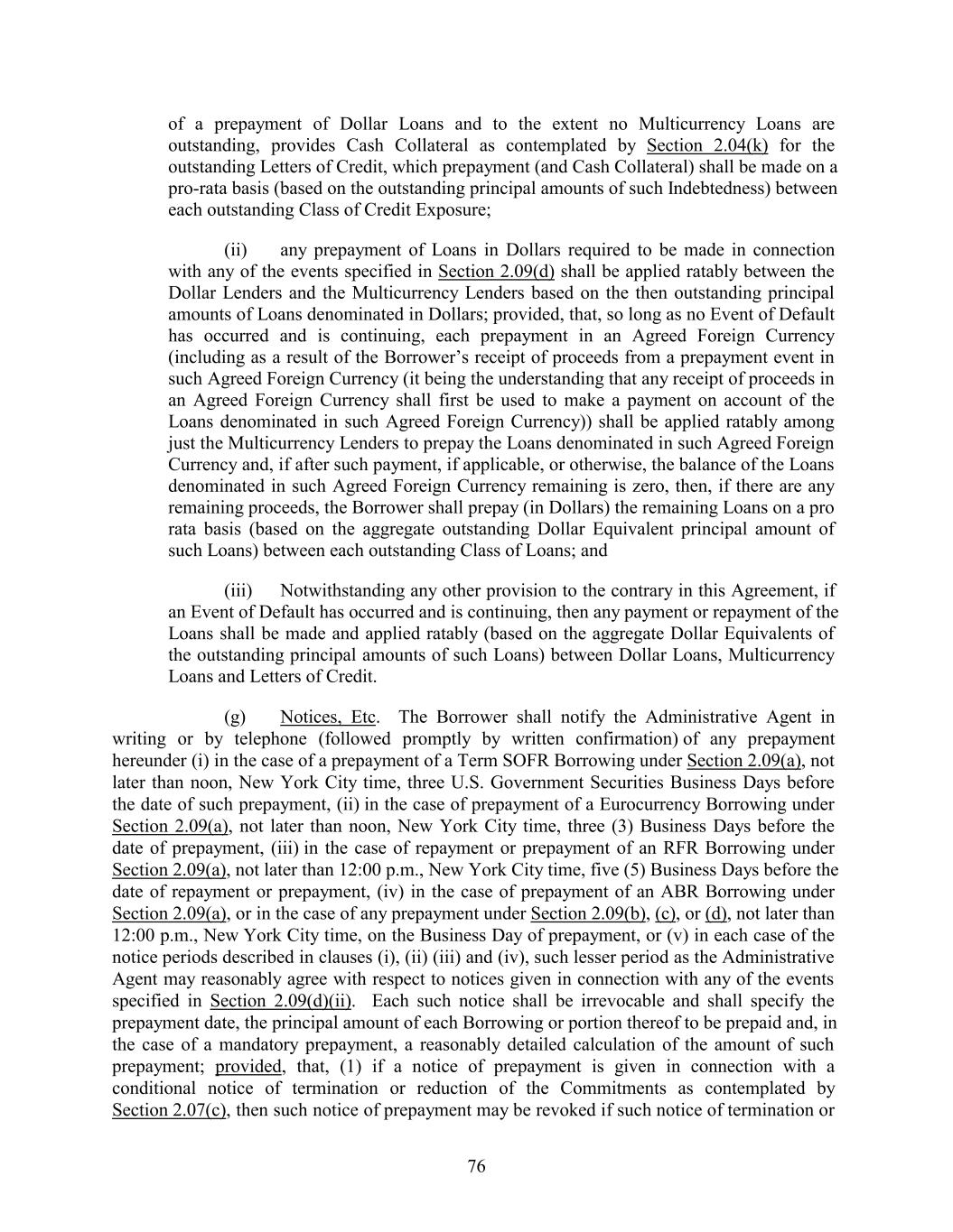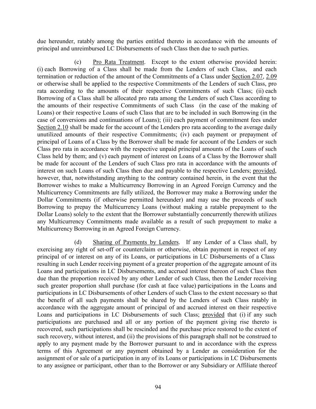 Event of Default, regardless of whether the Administrative Agent, any Lender or the Issuing Bank may have had notice or knowledge of such Default or Event of Default at the time. (b) Amendments to this Agreement. Except as set forth in the definition of Secured Longer-Term Indebtedness and Unsecured Longer-Term Indebtedness as in effect on the date hereof, neither this Agreement nor any provision hereof may be waived, amended or modified except pursuant to an agreement or agreements in writing entered into by the Borrower and the Required Lenders or by the Borrower and the Administrative Agent with the consent of the Required Lenders; provided that, subject to Section 2.17(b), no such agreement shall (i) increase the Commitment of any Lender without the written consent of such Lender, (ii) reduce the principal amount of any Loan or LC Disbursement or reduce the rate of interest thereon, or reduce any fees payable hereunder, without the written consent of each Lender directly affected thereby, (iii) postpone the scheduled date of payment of the principal amount of any Loan or LC Disbursement, or any interest thereon, or any fees or other amounts payable to a Lender hereunder, or reduce the amount or waive or excuse any such payment, or postpone the scheduled date of expiration of any Commitment, without the written consent of each Lender directly affected thereby, (iv) change Section 2.16(b), (c) or (d) or Section 2.09(f) (or other sections referred to therein to the extent relating to pro rata payments) in a manner that would alter the pro rata reduction of commitments, sharing of payments, or making of disbursements, required thereby without the written consent of each Lender directly affected thereby, (v) change any of the provisions of this Section, the definition of the term “Required Lenders” (including the percentage therein) or any other provision hereof specifying the number or percentage of Lenders required to waive, amend or modify any rights hereunder or make any determination or grant any consent hereunder, without the written consent of each Lender, (vi) other than as permitted by this Agreement, the Guarantee and Security Agreement or any other applicable Loan Document, release all or substantially all of the Collateral from the Lien created under the Guarantee and Security Agreement or release all or substantially all the Obligors from their obligations as Subsidiary Guarantors hereunder, without the written consent of each Lender, (vii) amend the definition of “Applicable Percentage”, “Applicable Dollar Percentage” or “Applicable Multicurrency Percentage” without the written consent of each Lender directly affected thereby, (viii) permit the assignment or transfer by any Obligor of any of its rights or obligations under any Loan Document without the consent of each Lender; or 162