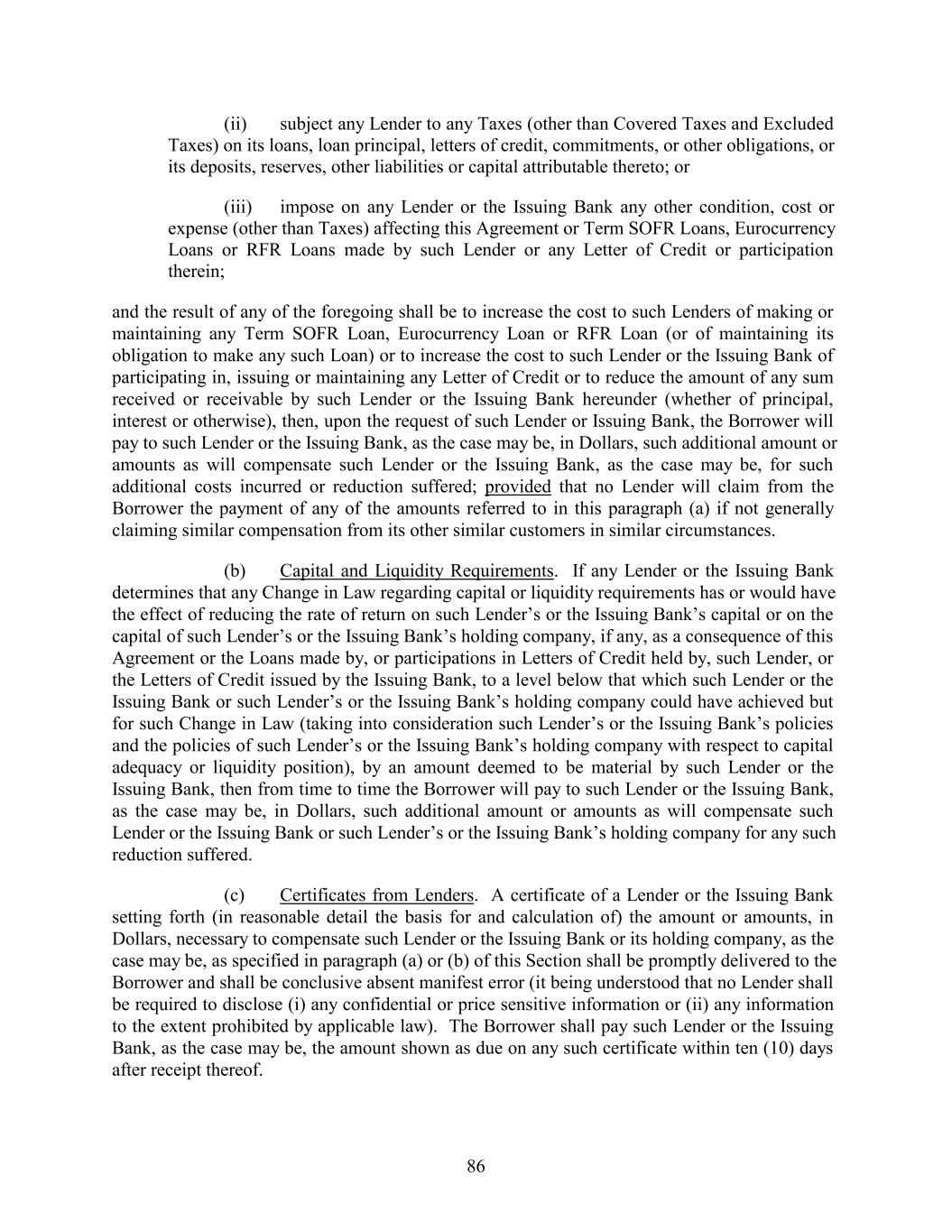 of such replacement, each such replacement Lender consents to the proposed change, waiver, discharge or termination. (e) Ambiguity, Omission, Mistake or Typographical Error. Notwithstanding the foregoing, if the Administrative Agent and the Borrower acting together identify any ambiguity, omission, mistake, typographical error or other defect in any provision of this Agreement or any other Loan Document, then the Administrative Agent and the Borrower shall be permitted to amend, modify or supplement such provision to cure such ambiguity, omission, mistake, typographical error or other defect, and such amendment shall become effective without any further action or consent of any other party to this Agreement. SECTION 9.03 Expenses; Indemnity; Damage Waiver. (a) Costs and Expenses. The Borrower shall pay (i) all reasonable and documented out-of-pocket fees, costs and expenses incurred by the Administrative Agent, the Collateral Agent and their Affiliates (including the reasonable fees, charges and disbursements of one outside counsel and of any necessary special and/or local counsel for the Administrative Agent and the Collateral Agent collectively (other than the allocated costs of internal counsel)), in connection with the syndication of the credit facilities provided for herein, the preparation and administration (other than internal overhead charges) of this Agreement and the other Loan Documents and any amendments, modifications or waivers of the provisions hereof or thereof (whether or not the transactions contemplated hereby or thereby shall be consummated) including all costs and expenses of the Independent Valuation Provider, (ii) all reasonable and documented out-of-pocket fees, costs and expenses incurred by the Issuing Bank in connection with the issuance, amendment, renewal or extension of any Letter of Credit or any demand for payment thereunder, (iii) all out-of-pocket fees, costs and expenses incurred by the Administrative Agent, the Collateral Agent, the Issuing Bank or any Lender, (including fees, charges and disbursements of counsel for the Administrative Agent, the Collateral Agent, the Issuing Bank or any Lender), in connection with the enforcement or protection of its rights in connection with this Agreement and the other Loan Documents, including its rights under this Section, or in connection with the Loans made or Letters of Credit issued hereunder, including all such out-of-pocket expenses incurred during any workout, restructuring or negotiations in respect thereof and (iv) all reasonable out-of-pocket costs, expenses, taxes, assessments and other charges incurred in connection with any filing, registration, recording or perfection of any security interest contemplated by any Security Document or any other document referred to therein. Unless an Event of Default has occurred and is continuing, the Borrower shall not be responsible for the reimbursement of any fees, costs and expenses of the Independent Valuation Provider incurred pursuant to 5.12(b)(iii) in excess of the greater of (x) $200,000 and (y) 0.05% of the total Commitments, in each case in the aggregate incurred for all such fees, costs and expenses in any 12-month period (the “IVP Supplemental Cap”). (b) Indemnification by the Borrower. The Borrower shall indemnify the Administrative Agent, the Issuing Bank and each Lender, and each Related Party of any of the foregoing Persons (each such Person being called an “Indemnitee”) against, and hold each Indemnitee harmless from, any and all losses, claims, damages, liabilities and related expenses (other than Taxes or Other Taxes which shall only be indemnified by the Borrower to the extent 165