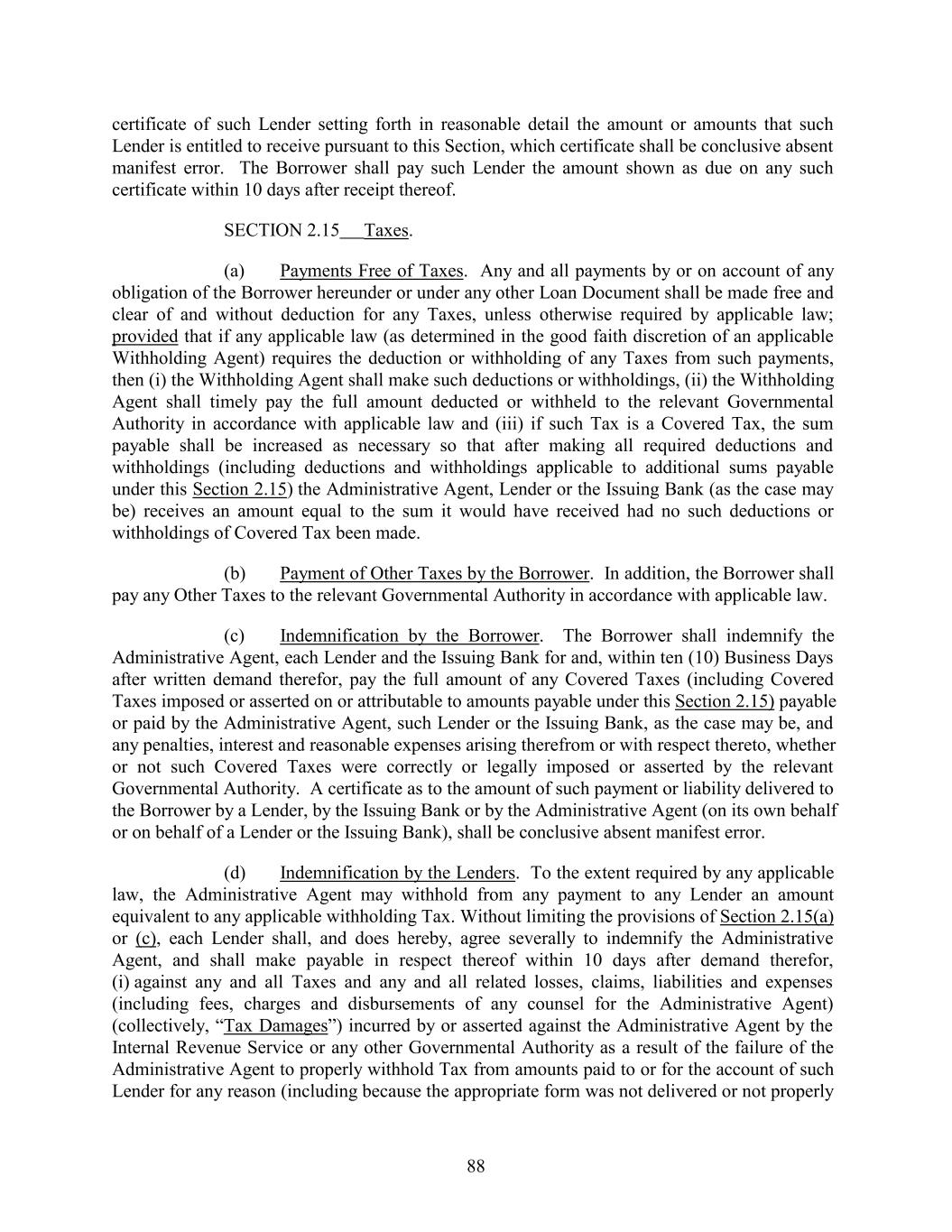 provided in Section 2.15), including the reasonable and documented out-of-pocket fees, charges and disbursements of any counsel for any Indemnitee (other than the allocated costs of internal counsel), incurred by or asserted against any Indemnitee arising out of, in connection with, or as a result of (i) the execution or delivery of this Agreement or any agreement or instrument contemplated hereby, the performance by the parties hereto of their respective obligations hereunder or the consummation of the Transactions or any other transactions contemplated hereby (including any arrangement entered into with an Independent Valuation Provider), (ii) any Loan or Letter of Credit or the use of the proceeds therefrom (including any refusal by the Issuing Bank to honor a demand for payment under a Letter of Credit if the documents presented in connection with such demand do not strictly comply with the terms of such Letter of Credit) or (iii) any direct, indirect, actual or prospective claim, litigation, investigation or proceeding (including any investigation or inquiry) relating to any of the foregoing, whether based on contract, tort or any other theory and whether brought by the Borrower, any Indemnitee or a third party and regardless of whether any Indemnitee is a party thereto; provided that such indemnity shall not as to any Indemnitee, be available to the extent that such losses, claims, damages, liabilities or related expenses are determined by a court of competent jurisdiction by final and nonappealable judgment to have resulted from (x) the willful misconduct or gross negligence of such Indemnitee, (y) a material breach in bad faith of such Indemnitee’s obligations hereunder or under any other Loan Document or (z) a claim between any Indemnitee or Indemnitees, on the one hand, and any other Indemnitee or Indemnitees, on the other hand (other than (1) any dispute involving claims against the Administrative Agent or the Issuing Bank, in each case in their respective capacities as such, and (2) claims arising out of any act or omission by the Borrower and/or its Related Parties). The Borrower shall not be liable to any Indemnitee for any special, indirect, consequential or punitive damages (as opposed to direct or actual damages (other than in respect of any such damages incurred or paid by an Indemnitee to a third party)) arising out of, in connection with, or as a result of the Transactions asserted by an Indemnitee against the Borrower or any other Obligor; provided that the foregoing limitation shall not be deemed to impair or affect the obligations of the Borrower under the preceding provisions of this subsection (including reimbursement of such amounts required to be paid by an Indemnity to a third party). (c) Reimbursement by Lenders. To the extent that the Borrower fails to pay any amount required to be paid by it to the Administrative Agent or the Issuing Bank under paragraph (a) or (b) of this Section (and without limiting its obligation to do so) or to the extent that the fees, costs and expenses of the Independent Valuation Provider incurred pursuant to Section 5.12(b)(iii) exceed the IVP Supplemental Cap for any 12-month period (provided that prior to incurring expenses in excess of the IVP Supplemental Cap, the Administrative Agent shall have afforded the Lenders an opportunity to consult with the Administrative Agent regarding such expenses), each Lender severally agrees to pay to the Administrative Agent or the Issuing Bank, as the case may be, such Lender’s Applicable Percentage (determined as of the time that the applicable unreimbursed expense or indemnity payment is sought) of such unpaid amount; provided that the unreimbursed expense or indemnified loss, claim, damage, liability or related expense, as the case may be, was incurred by or asserted against the Administrative Agent or the Issuing Bank in its capacity as such. 166
