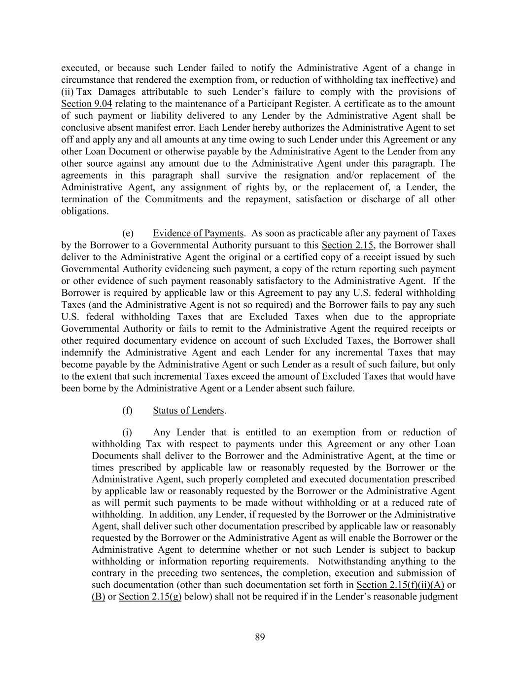 securities (if any) issued by such SPC to fund such Loans (but nothing contained herein shall be construed in derogation of the obligation of the Granting Lender to make Loans hereunder); provided that neither the consent of the SPC or of any such assignee shall be required for amendments or waivers hereunder except for those amendments or waivers for which the consent of participants is required under paragraph (f) below, and (ii) disclose on a confidential basis (in the same manner described in Section 9.13(b)) any non-public information relating to its Loans to any rating agency, commercial paper dealer or provider of a surety, guarantee or credit or liquidity enhancement to such SPC. (f) Participations. Any Lender may sell participations to one or more banks or other entities other than a Disqualified Lender (a “Participant”) in all or a portion of such Lender’s rights and obligations under this Agreement and the other Loan Documents (including all or a portion of its Commitments and the Loans and LC Disbursements owing to it); provided that (i) such Lender’s obligations under this Agreement and the other Loan Documents shall remain unchanged, (ii) such Lender shall remain solely responsible to the other parties hereto for the performance of such obligations and (iii) the Borrower, the Administrative Agent, the Issuing Bank and the other Lenders shall continue to deal solely and directly with such Lender in connection with such Lender’s rights and obligations under this Agreement and the other Loan Documents. Any agreement or instrument pursuant to which a Lender sells such a participation shall provide that such Lender shall retain the sole right to enforce this Agreement and the other Loan Documents and to approve any amendment, modification or waiver of any provision of this Agreement or any other Loan Document; provided that such agreement or instrument may provide that such Lender will not, without the consent of the Participant, agree to any amendment, modification or waiver described in the first proviso to Section 9.02(b) that affects such Participant. Subject to paragraph (g) of this Section, the Borrower agrees that each Participant shall be entitled to the benefits of Sections 2.13, 2.14 and 2.15 (subject to the requirements and limitations therein, including Sections 2.15(f) and (g) (it being understood that the documentation required under Sections 2.15(f) and (g) shall be delivered to the participating Lender)) to the same extent as if it were a Lender and had acquired its interest by assignment pursuant to paragraph (b) of this Section; provided that such Participant agrees to be subject to the provisions of Section 2.18 as if it were an assignee under paragraph (b) of this Section 9.04. Each Lender that sells a participation agrees, at the Borrower’s request and expense, to use reasonable efforts to cooperate with the Borrower to effectuate the provisions of Section 2.18 with respect to any Participant. To the extent permitted by law, each Participant also shall be entitled to the benefits of Section 9.08 as though it were a Lender, provided such Participant agrees to be subject to Section 2.16(d) as though it were a Lender hereunder. Each Lender that sells a participation shall, acting solely for this purpose as a non-fiduciary agent of the Borrower, maintain a register on which it enters the name and address of each Participant and the principal amounts and stated interest of each Participant’s interest in the Loans or other obligations under the Loan Documents (each a “Participant Register”); provided, that no Lender shall have any obligation to disclose all or any portion of the Participant Register (including the identity of any Participant or any information relating to a Participant’s interest in any commitments, loans, letters of credit or its other obligations under any Loan Document) to any Person except to the extent that such disclosure is necessary to establish that such commitment, loan, letter of credit or other obligation is in registered form under Section 5f.103-1(c) of the United States Treasury Regulations. The entries in each Participant Register shall be conclusive absent manifest error, 171