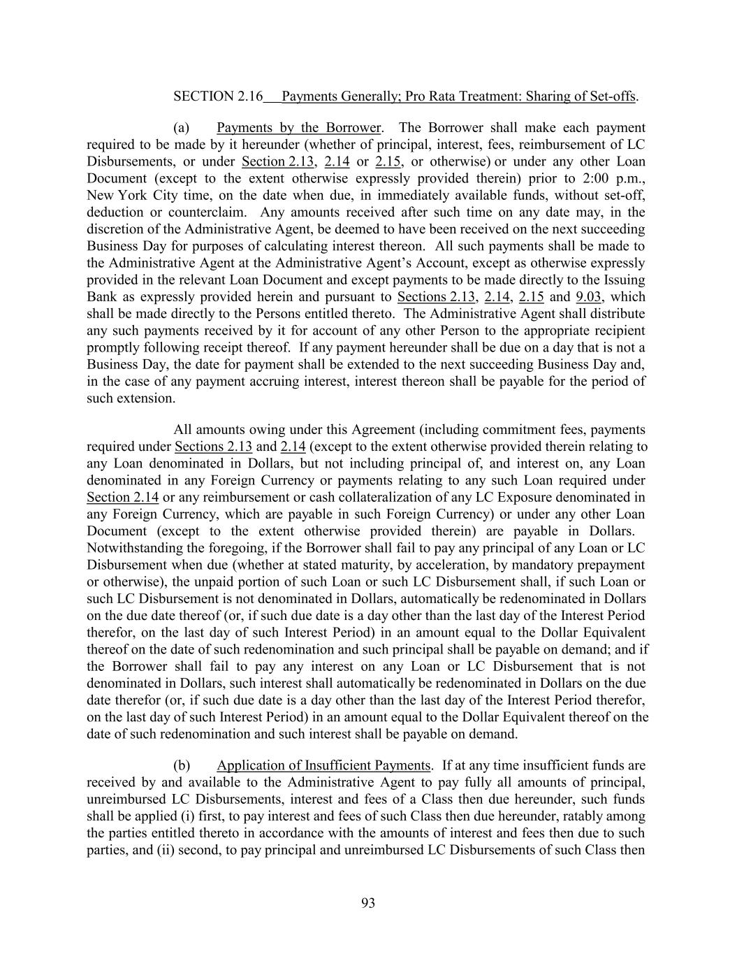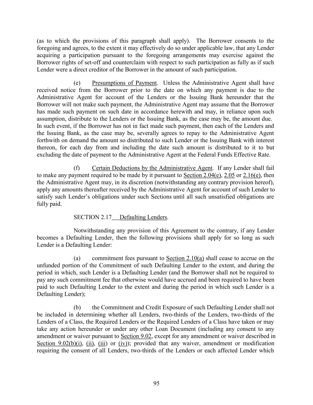 SECTION 9.07 Severability. Any provision of this Agreement held to be invalid, illegal or unenforceable in any jurisdiction shall, as to such jurisdiction, be ineffective to the extent of such invalidity, illegality or unenforceability without affecting the validity, legality and enforceability of the remaining provisions hereof; and the invalidity of a particular provision in a particular jurisdiction shall not invalidate such provision in any other jurisdiction. SECTION 9.08 Right of Setoff. If an Event of Default shall have occurred and be continuing, each Lender and each of its Affiliates is hereby authorized at any time and from time to time, to the fullest extent permitted by law, to set off and apply any and all deposits (general or special, time or demand, provisional or final, in whatever Currency) at any time held and other obligations at any time owing by such Lender, the Issuing Bank or any such Affiliate to or for the credit or the account of any Obligor against any of and all the obligations of any Obligor now or hereafter existing under this Agreement or any other Loan Document held by such Lender or Issuing Bank, irrespective of whether or not such Lender or Issuing Bank shall have made any demand under this Agreement and although such obligations may be contingent and unmatured, or are owed to a branch, office or Affiliate of such Lender or Issuing Bank different from the branch, office or Affiliate holding such deposit or obligated on such Indebtedness. The rights of each Lender, Issuing Bank and their respective Affiliates under this Section are in addition to other rights and remedies (including other rights of setoff) which such Lender, Issuing Bank or Affiliate may have; provided that in the event that any Defaulting Lender exercises any such right of setoff, (a) all amounts so set off will be paid over immediately to the Administrative Agent for further application in accordance with the provisions of Section 2.17 and, pending such payment, will be segregated by such Defaulting Lender from its other funds and deemed held in trust for the benefit of the Administrative Agent, the Issuing Bank and the Lenders and (b) the Defaulting Lender will provide promptly to the Administrative Agent a statement describing in reasonable detail the obligations owing to such Defaulting Lender as to which it exercised such right of setoff. Each Lender agrees promptly to notify the Borrower and the Administrative Agent after any such set-off and application made by such Lender; provided that the failure to give such notice shall not affect the validity of such set-off and application. SECTION 9.09 Governing Law; Jurisdiction; Etc. (a) Governing Law. This Agreement and the other Loan Documents shall be construed in accordance with and governed by the law of the State of New York. (b) Submission to Jurisdiction. The Borrower hereby irrevocably and unconditionally submits, for itself and its property, to the exclusive jurisdiction of the Supreme Court of the State of New York sitting in New York County and of the United States District Court of the Southern District of New York, and any appellate court from any thereof, in any action or proceeding arising out of or relating to this Agreement or the other Loan Documents, or for recognition or enforcement of any judgment, and each of the parties hereto hereby irrevocably and unconditionally agrees that all claims in respect of any such action or proceeding may be heard and determined in such New York State or, to the extent permitted by law, in such Federal court. Each of the parties hereto agrees that a final judgment in any such action or proceeding shall be conclusive and may be enforced in other jurisdictions by suit on the judgment or in any other manner provided by law. Nothing in this Agreement shall affect any 174