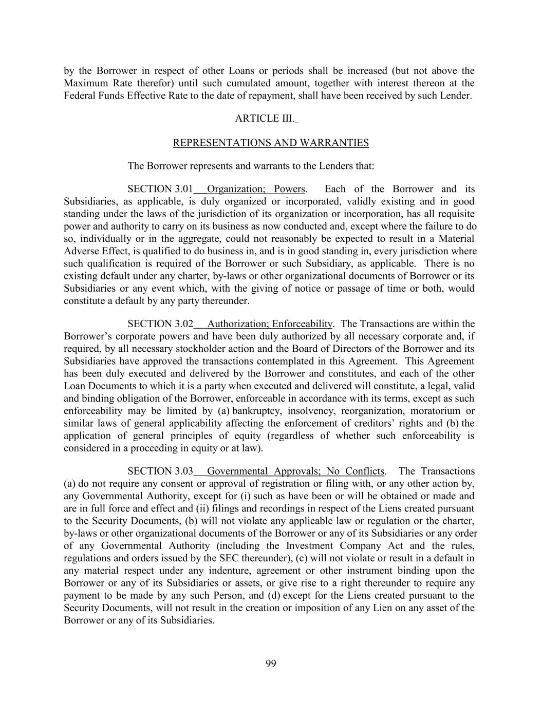 the types of fees and expenses that are customarily paid in connection with such Indebtedness (it being understood that (w) the conversion features into Permitted Equity Interests under convertible notes, (x) the triggering of such conversion and/or settlement thereof solely with Permitted Equity Interests, and (y) any cash payment on account of interest or expenses on such convertible notes made by the Borrower in respect of such triggering and/or settlement thereof, shall be permitted under this clause (a)) or (b) for payments and prepayments of Secured Longer-Term Indebtedness required to comply with requirements of Section 2.09(b). SECTION 6.13 Modification of Investment and Valuation Policies. Other than with respect to Permitted Policy Amendments, the Borrower will not amend, supplement, waive or otherwise modify in any material respect the Investment Policies or its Valuation Policies as in effect on the Effective Date. SECTION 6.14 SBIC Guarantees. The Borrower will not, nor will it permit any of its Subsidiaries to, cause or permit the occurrence of any event or condition that would result in any recourse to any Obligor under any Permitted SBIC Guarantee. SECTION 6.15 Derivative Transactions. The Borrower will not, nor will it permit any of its Subsidiaries (other than any Financing Subsidiary) to, enter into any swap or derivative transactions (including any total return swap) or other similar transactions or agreements except for Hedging Agreements to the extent permitted pursuant to Section 6.01(h) and Section 6.04(c). ARTICLE VII. EVENTS OF DEFAULT If any of the following events (“Events of Default”) shall occur and be continuing: (a) (i) the Borrower shall fail to pay any principal of any Loan (including, without limitation, any principal payable under Section 2.09(b) or (c)) or any reimbursement obligation in respect of any LC Disbursement when and as the same shall become due and payable, whether at the due date thereof or at a date fixed for prepayment thereof or otherwise or (ii) fail to Cash Collateralize any LC Exposure as and when required by Section 2.04(k); (b) the Borrower shall fail to pay any interest on any Loan or any fee or any other amount (other than an amount referred to in clause (a) of this Article) payable under this Agreement or under any other Loan Document, when and as the same shall become due and payable, and such failure shall continue unremedied for a period of five (5) or more Business Days; (c) any representation or warranty made or deemed made by or on behalf of the Borrower or any of its Subsidiaries in or in connection with this Agreement or any other Loan Document or any amendment or modification hereof or thereof, or in any report, certificate, financial statement or other document furnished pursuant to or in connection with this Agreement or any other Loan Document or any amendment or modification hereof or thereof, shall prove to have been incorrect when made or deemed made in any material respect (except 146