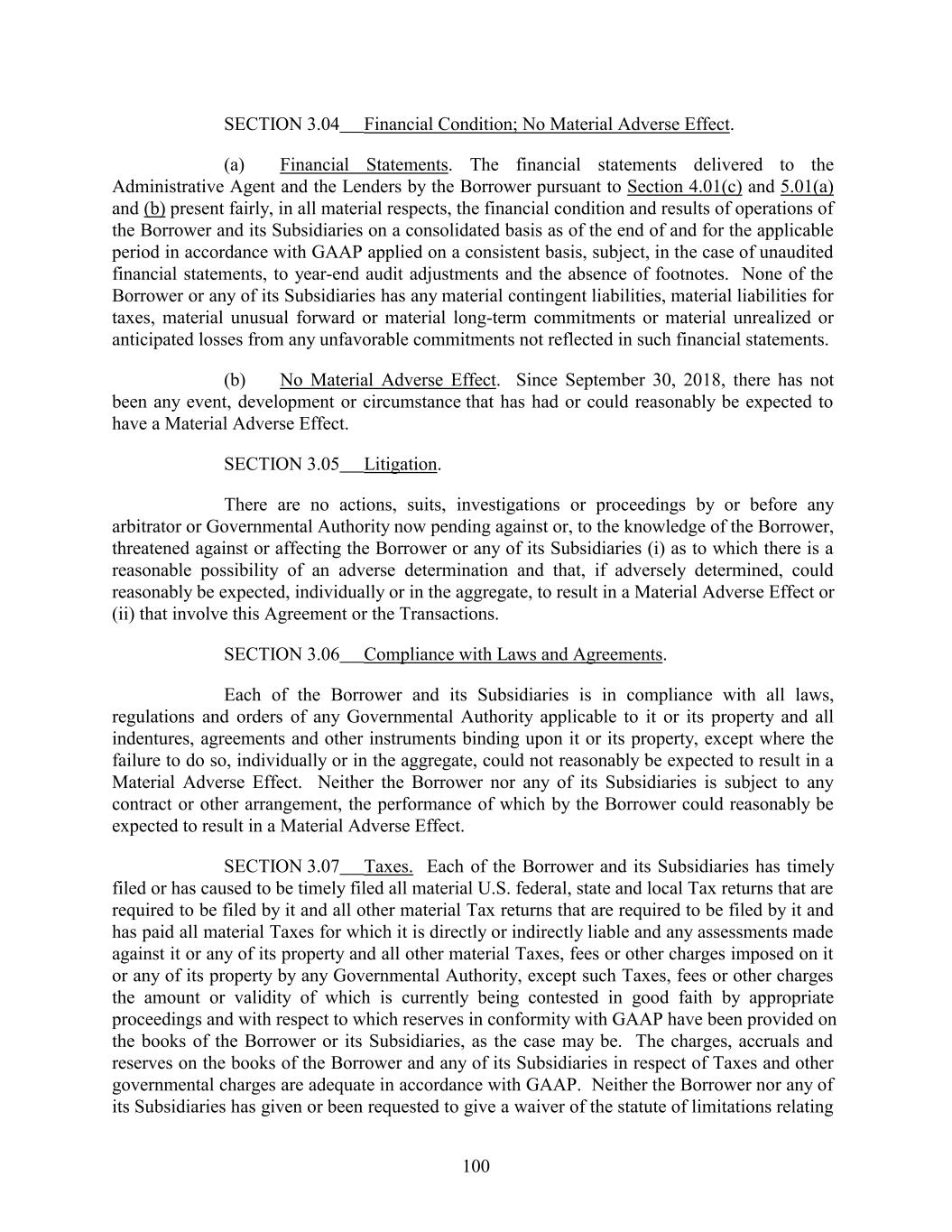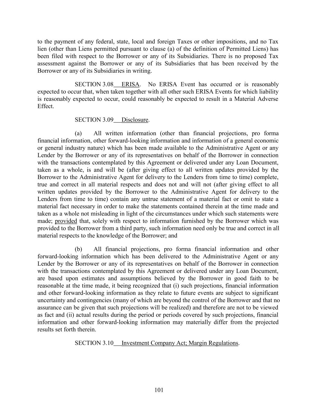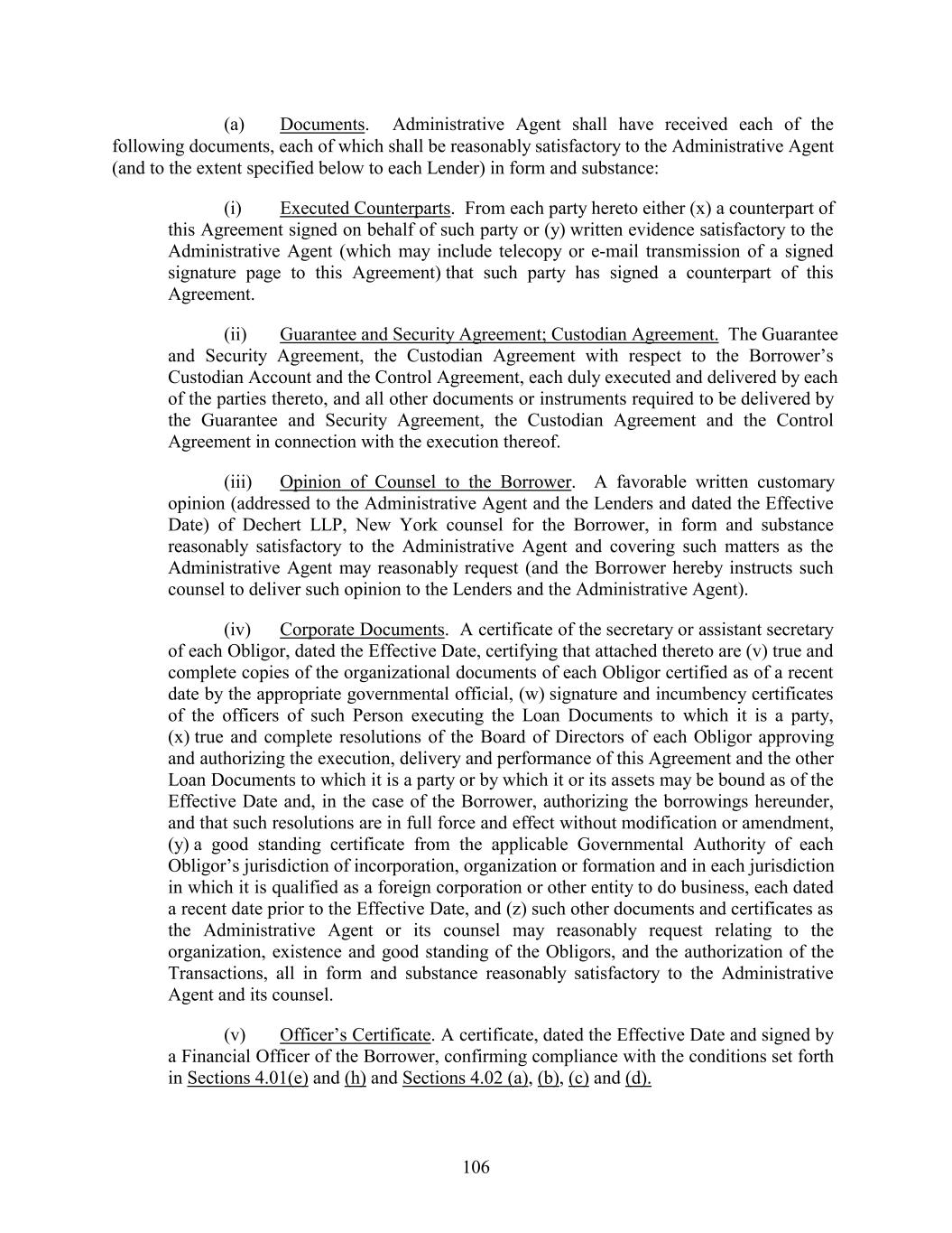 rights and powers expressly contemplated hereby or by the other Loan Documents that the Administrative Agent is required to exercise in writing by the Required Lenders, and (c) except as expressly set forth herein and in the other Loan Documents, the Administrative Agent shall not have any duty to disclose, and shall not be liable for the failure to disclose, any information relating to the Borrower or any of its Subsidiaries that is communicated to or obtained by the bank serving as Administrative Agent or any of its Affiliates in any capacity. The Administrative Agent shall not be liable for any action taken or not taken by it with the consent or at the request of the Required Lenders (or such other number or percentage of the Lenders as shall be expressly provided for herein or in the other Loan Documents) or in the absence of its own gross negligence or willful misconduct as determined by a court of competent jurisdiction by final and non-appealable judgment. The Administrative Agent shall be deemed not to have knowledge of any Default or Event of Default unless and until written notice thereof is given to the Administrative Agent by the Borrower or a Lender, and the Administrative Agent shall not be responsible for or have any duty to ascertain or inquire into (i) any statement, warranty or representation made in or in connection with this Agreement or any other Loan Document, (ii) the contents of any certificate, report or other document delivered hereunder or thereunder or in connection herewith or therewith, (iii) the performance or observance of any of the covenants, agreements or other terms or conditions set forth herein or therein, (iv) the validity, enforceability, effectiveness or genuineness of this Agreement, any other Loan Document or any other agreement, instrument or document, or (v) the creation, perfection or priority of any Lien purported to be created by the Loan Documents or the value or the sufficiency of any Collateral or (vi) the satisfaction of any condition set forth in Article IV or elsewhere herein or therein, other than to confirm receipt of items expressly required to be delivered to the Administrative Agent. Notwithstanding anything to the contrary contained herein, in no event shall the Administrative Agent be liable or responsible in any way or manner for the failure to obtain or receive an Agent External Value for any asset or for the failure to send any notice required under Section 5.12(b)(iii)(A). SECTION 8.04 Reliance. The Administrative Agent shall be entitled to rely upon, and shall not incur any liability for relying upon, any notice, request, certificate, consent, statement, instrument, document or other writing (including any electronic message, Internet or intranet website posting or other distribution) believed by it to be genuine and to have been signed or sent by the proper Person. The Administrative Agent also may rely upon any statement made to it orally or by telephone and believed by it to be made by or on behalf of the proper Person or Persons, and shall not incur any liability for relying thereon. The Administrative Agent may consult with legal counsel (who may be counsel for the Borrower), independent accountants and other experts selected by it, and shall not be liable for any action taken or not taken by it in accordance with the advice of any such counsel, accountants or experts. SECTION 8.05 Sub-Agents. The Administrative Agent may perform any and all its duties and exercise its rights and powers by or through any one or more sub-agents appointed by the Administrative Agent. The Administrative Agent and any such sub-agent may perform any and all its duties and exercise its rights and powers through their respective Related Parties. The exculpatory provisions of the preceding paragraphs shall apply to any such sub-agent and to the Related Parties of the Administrative Agent and any such sub-agent, and 151