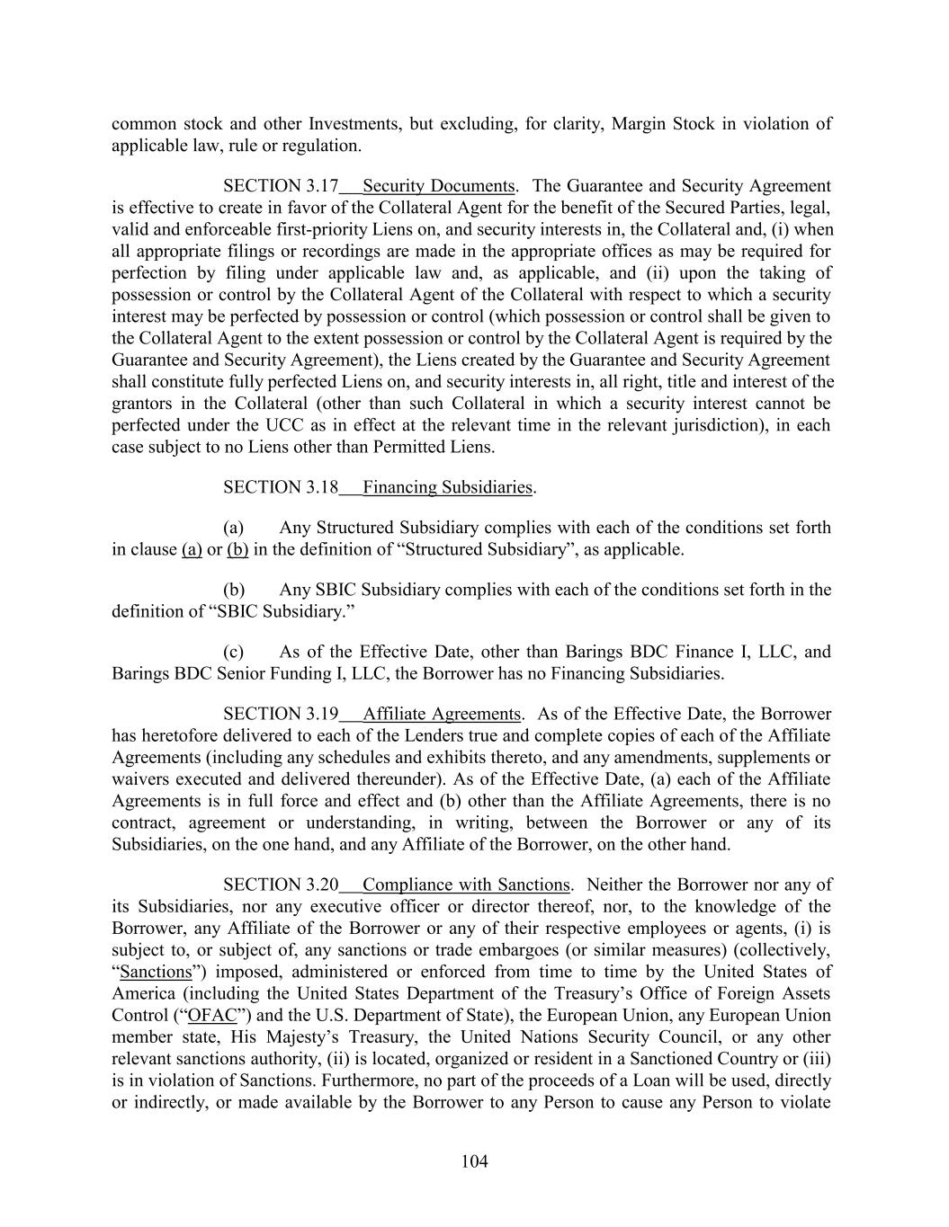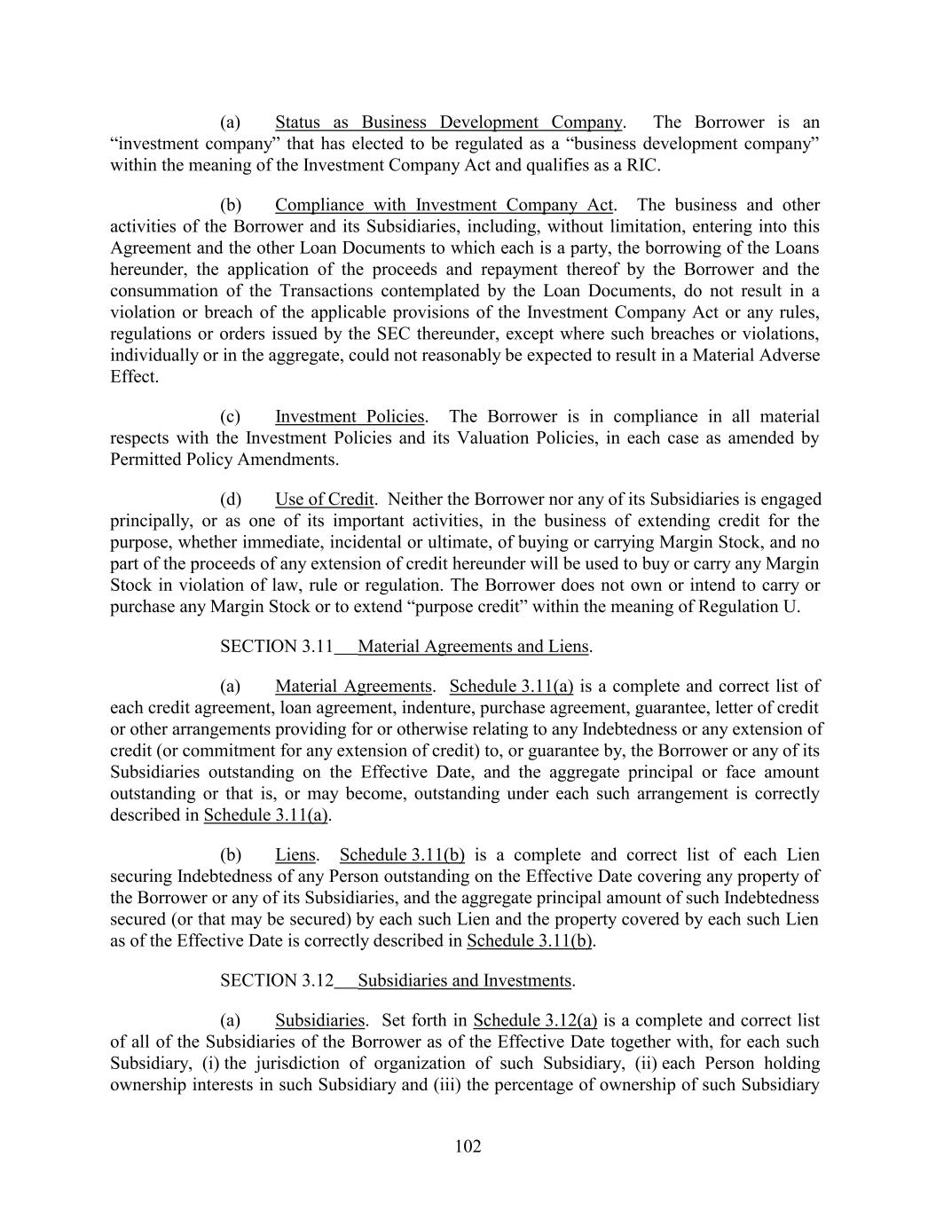 Obligor shall use commercially reasonable efforts to obtain permission to make such distribution and shall make such distribution as soon as legally permitted to do so); and (vi) in the case of any Portfolio Investment held by any Financing Subsidiary, including any cash collection related thereto, ensure that such Portfolio Investment shall not be held in any Custodian Account, or any other account of any Obligor. SECTION 5.09 Use of Proceeds. The Borrower will use the proceeds of the Loans and the issuances of Letters of Credit only for general corporate purposes of the Borrower and its Subsidiaries in the ordinary course of business, including making distributions not prohibited by this Agreement and the acquisition and funding (either directly or indirectly as permitted hereunder) of leveraged loans, mezzanine loans, high-yield securities, convertible securities, preferred stock, common stock and other Investments in each case to the extent otherwise permitted hereunder; provided that neither the Administrative Agent nor any Lender shall have any responsibility as to the use of any of such proceeds. No part of the proceeds of any Loan will be used in violation of applicable law, rule or regulation or, directly or indirectly, for the purpose, whether immediate, incidental or ultimate, of buying or carrying any Margin Stock. On the Effective Date, the first day (if any) an Obligor acquires any Margin Stock and at any other time requested by the Administrative Agent or any Lender, the Borrower shall furnish to the Administrative Agent and each Lender a statement to the foregoing effect in conformity with the requirements of FR Form G-3 or FR Form U-1, as applicable, referred to in Regulation U. Margin Stock shall be purchased by the Obligors only with the proceeds of Indebtedness not directly or indirectly secured by Margin Stock (within the meaning of Regulation U), or with the proceeds of equity capital of the Borrower. No Obligor will (and each Obligor will procure that its Subsidiaries and its or their respective directors, officers, employees and agents shall not) directly or indirectly use the proceeds of the Loans or otherwise make available such proceeds (I) to any Person for the purpose of financing the activities or business of or with any Person, or in any country or territory, that, at the time of such funding, is, or whose government is, the subject of any Sanctions or in any other manner that would result in a violation of Sanctions by any Person or (II) in violation of Anti-Corruption Laws or for any payments to any governmental official or employee, political party, official of a political party, candidate for political office, or anyone else acting in an official capacity, in order to obtain, retain or direct business or obtain any improper advantage, in violation of any Anti-Corruption Laws. For the avoidance of doubt, Letters of Credit may be issued to support obligations of any Portfolio Company; provided that the underlying obligations of such Portfolio Company to the applicable Obligors in respect of such Letters of Credit shall not be included in the Borrowing Base. SECTION 5.10 Status of RIC and BDC. The Borrower shall at all times maintain its status as a “business development company” under the Investment Company Act and as a RIC under the Code. SECTION 5.11 Investment Policies; Valuation Policy. The Borrower shall at all times be in compliance in all material respects with its Investment Policies and its Valuation Policy, in each case as amended by Permitted Policy Amendments. 119