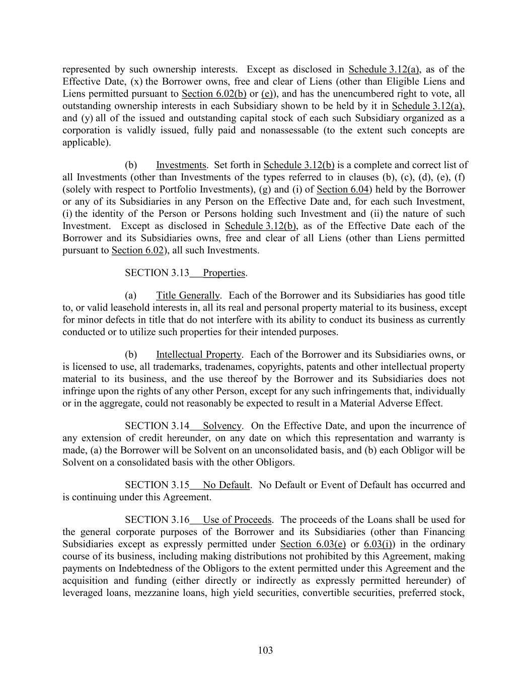 to applicable law with respect to any corporation, limited liability company, partnership or other entity). Notwithstanding the foregoing provisions of this Section: (a) any Subsidiary of the Borrower may be merged or consolidated with or into the Borrower or any other Subsidiary Guarantor; provided that if any such transaction shall be between a Subsidiary and a wholly owned Subsidiary Guarantor, the wholly owned Subsidiary Guarantor shall be the continuing or surviving corporation; (b) any Subsidiary of the Borrower may sell, lease, transfer or otherwise dispose of any or all of its assets (upon voluntary liquidation or otherwise) to the Borrower or any wholly owned Subsidiary Guarantor of the Borrower; (c) the capital stock of any Subsidiary of the Borrower may be sold, transferred or otherwise disposed of to the Borrower or any wholly owned Subsidiary Guarantor of the Borrower; (d) the Obligors may sell, transfer or otherwise dispose of Portfolio Investments (other than to a Financing Subsidiary) so long as prior to and after giving effect to such sale, transfer or other disposition (and any concurrent acquisitions of Portfolio Investments or payment of outstanding Loans or Other Covered Indebtedness) the Covered Debt Amount does not exceed the Borrowing Base; (e) the Obligors may sell, transfer or otherwise dispose of Portfolio Investments (other than ownership interests in Financing Subsidiaries), Cash and Cash Equivalents to a Financing Subsidiary (including, for clarity, as investments (debt or equity) or capital contributions) so long as (i) prior to and immediately after giving effect to such sale, transfer or other disposition (and any concurrent acquisitions of Portfolio Investments or payment of outstanding Loans or Other Covered Indebtedness) the Covered Debt Amount does not exceed the Borrowing Base and no Default or Event of Default exists, and the Borrower delivers to the Administrative Agent a certificate of a Financial Officer to such effect, (ii) after giving effect to such sale, transfer or other disposition (and any concurrent acquisitions of Portfolio Investments or payment of outstanding Loans or Other Covered Indebtedness), either (x) the amount by which the Borrowing Base exceeds the Covered Debt Amount immediately prior to such sale, transfer or other disposition is not diminished as a result of such sale, transfer or other disposition or (y) the Covered Debt Amount does not exceed 90% of the Borrowing Base immediately after giving effect to such sale, transfer or other disposition (and any concurrent acquisitions of Portfolio Investments or payment of outstanding Loans or Other Covered Indebtedness) and (iii) the Consolidated Asset Coverage Ratio calculated on a pro forma basis after giving effect to such sale, transfer or other disposition (and any concurrent acquisitions of Portfolio Investments or payment of outstanding Loans or Other Covered Indebtedness) is not less than 160%; provided that, notwithstanding anything to the contrary herein or in any other Loan Document, no Portfolio Investments, Cash or Cash Equivalents may be transferred, directly or indirectly, to any Specified CLO following the Specified CLO Effective Date. 139