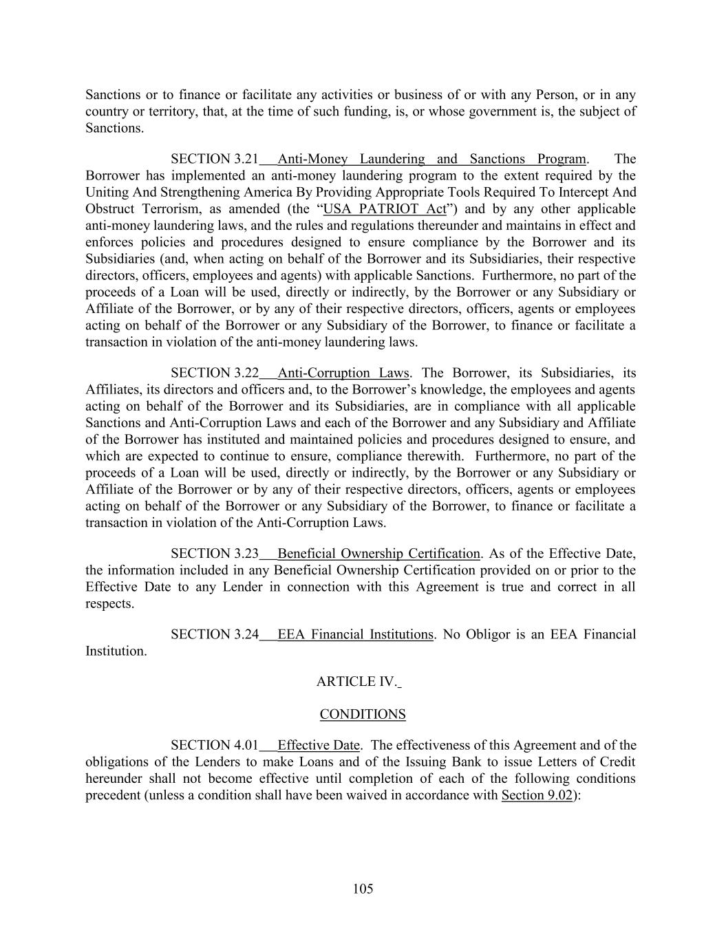 Disqualified Lender. The list of Disqualified Lenders will be made available by the Administrative Agent to any Lender, participant or potential Lender or participant upon request. SECTION 9.05 Survival. All covenants, agreements, representations and warranties made by the Borrower herein and in the certificates or other instruments delivered in connection with or pursuant to this Agreement shall be considered to have been relied upon by the other parties hereto and shall survive the execution and delivery of this Agreement and the making of any Loans and issuance of any Letters of Credit, regardless of any investigation made by any such other party or on its behalf and notwithstanding that the Administrative Agent, the Issuing Bank or any Lender may have had notice or knowledge of any Default or Event of Default or incorrect representation or warranty at the time any credit is extended hereunder, and shall continue in full force and effect as long as the principal of or any accrued interest on any Loan or any fee or any other amount payable under this Agreement is outstanding and unpaid or any Letter of Credit is outstanding and so long as the Commitments have not expired or terminated. The provisions of Sections 2.13, 2.14, 2.15 and 9.03 and Article VIII shall survive and remain in full force and effect regardless of the consummation of the transactions contemplated hereby, the repayment of the Loans, the expiration or termination of the Letters of Credit and the Commitments or the termination of this Agreement or any provision hereof. SECTION 9.06 Counterparts; Integration; Effectiveness; Electronic Execution. (a) Counterparts; Integration; Effectiveness. This Agreement may be executed in counterparts (and by different parties hereto on different counterparts), each of which shall constitute an original, but all of which when taken together shall constitute a single contract. This Agreement, the other Loan Documents and any separate letter agreements with respect to fees payable to the Administrative Agent constitute the entire contract between and among the parties relating to the subject matter hereof and supersede any and all previous agreements and understandings, oral or written, relating to the subject matter hereof. Except as provided in Section 4.01, this Agreement shall become effective when it shall have been executed by the Administrative Agent and when the Administrative Agent shall have received counterparts hereof which, when taken together, bear the signatures of each of the other parties hereto, and thereafter shall be binding upon and inure to the benefit of the parties hereto and their respective successors and assigns. Delivery of an executed counterpart of a signature page to this Agreement by telecopy or electronic mail shall be effective as delivery of a manually executed counterpart of this Agreement. (b) Electronic Execution of Assignments. The words “execution,” “signed,” “signature,” and words of like import in this Agreement, any other Loan Document or any Assignment and Assumption shall be deemed to include electronic signatures or the keeping of records in electronic form, each of which shall be of the same legal effect validity or enforceability as a manually executed signature or the use of a paper-based recordkeeping system, as the case may be, to the extent and as provided for in any applicable law, including the Federal Electronic Signatures in Global and National Commerce Act, the New York State Electronic Signatures and Records Act, or any other similar state laws based on the Uniform Electronic Transactions Act. 173
