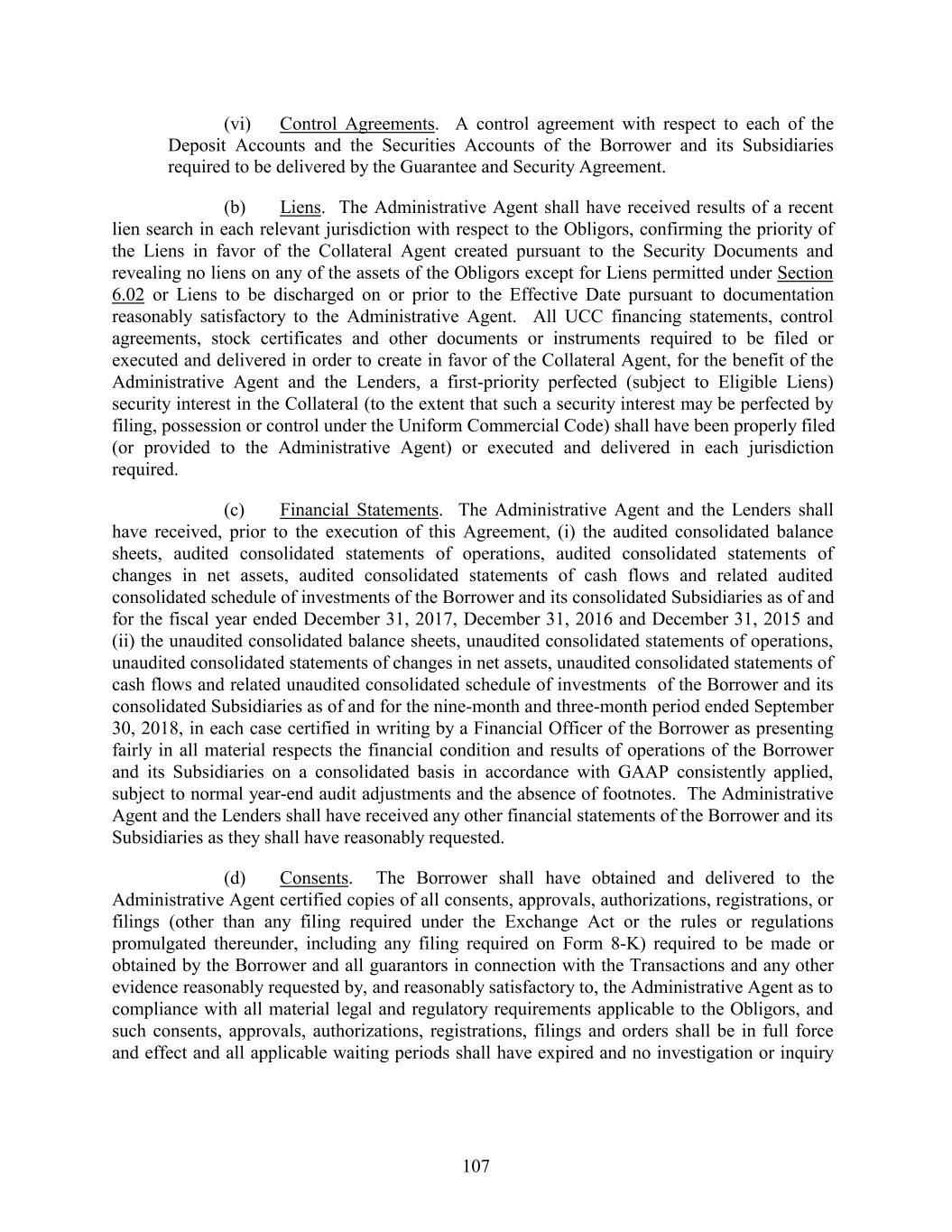 Subsidiary”, as applicable, for any purpose of this Agreement or any other Loan Document. (b) Ownership of Subsidiaries. The Borrower will, and will cause each of its Subsidiaries to, take such action from time to time as shall be necessary to ensure that each of its Subsidiaries is a direct or indirect wholly owned Subsidiary; provided that the foregoing shall not prohibit any transaction permitted under Section 6.03 or 6.04, so long as after giving effect to such permitted transaction each of the remaining Subsidiaries is a direct or indirect wholly owned Subsidiary. (c) Further Assurances. The Borrower will, and will cause each of the Subsidiary Guarantors to, take such action from time to time as shall reasonably be requested by the Administrative Agent to effectuate the purposes and objectives of this Agreement. Without limiting the generality of the foregoing, the Borrower will, and will cause each of the Subsidiary Guarantors, to: (i) take such action from time to time (including filing appropriate Uniform Commercial Code financing statements and executing and delivering such assignments, security agreements and other instruments) as shall be reasonably requested by the Administrative Agent to create, in favor of the Collateral Agent for the benefit of the Lenders (and any affiliate thereof that is a party to any Hedging Agreement entered into with the Borrower) and the holders of any Secured Longer-Term Indebtedness, perfected first-priority security interests and Liens in the Collateral; provided that any such security interest or Lien shall be subject to the relevant requirements of the Security Documents; (ii) with respect to each deposit account or securities account of the Obligors (other than (A) any such account that is maintained by the Borrower in its capacity as “servicer” for a Financing Subsidiary or any Agency Account, (B) any such accounts which hold solely money or financial assets of a Financing Subsidiary, (C) any payroll account so long as such payroll account is coded as such, (D) withholding tax and fiduciary accounts or any trust account maintained solely on behalf of a Portfolio Investment, (E) any checking account of the Obligors in which the aggregate value of deposits therein, together with all other such accounts under this clause (E), does not at any time exceed $1,000,000, provided that the Borrower will, and will cause each of its Subsidiary Guarantors to, use commercially reasonable efforts to obtain control agreements governing any such account in this clause (E), and (F) any account in which the aggregate value of deposits therein, together with all other such accounts under this clause (F), does not at any time exceed $75,000; provided that in the case of each of the foregoing clauses (A) through (F), no other Person (other than the depository institution at which such account is maintained) shall have “control” (within the meaning of the Uniform Commercial Code) over such account, cause each bank or securities intermediary (within the meaning of the Uniform Commercial Code)) to enter into such arrangements with the Collateral Agent as shall be appropriate in order that the Collateral Agent has “control” (within the meaning of the Uniform Commercial Code) over each such deposit account or securities account (each, a “Control Account”) and in that connection, the Borrower agrees, subject to Sections 5.08(c)(iv) and (v) below, to cause all cash and other proceeds of Portfolio Investments received by any Obligor to be 117