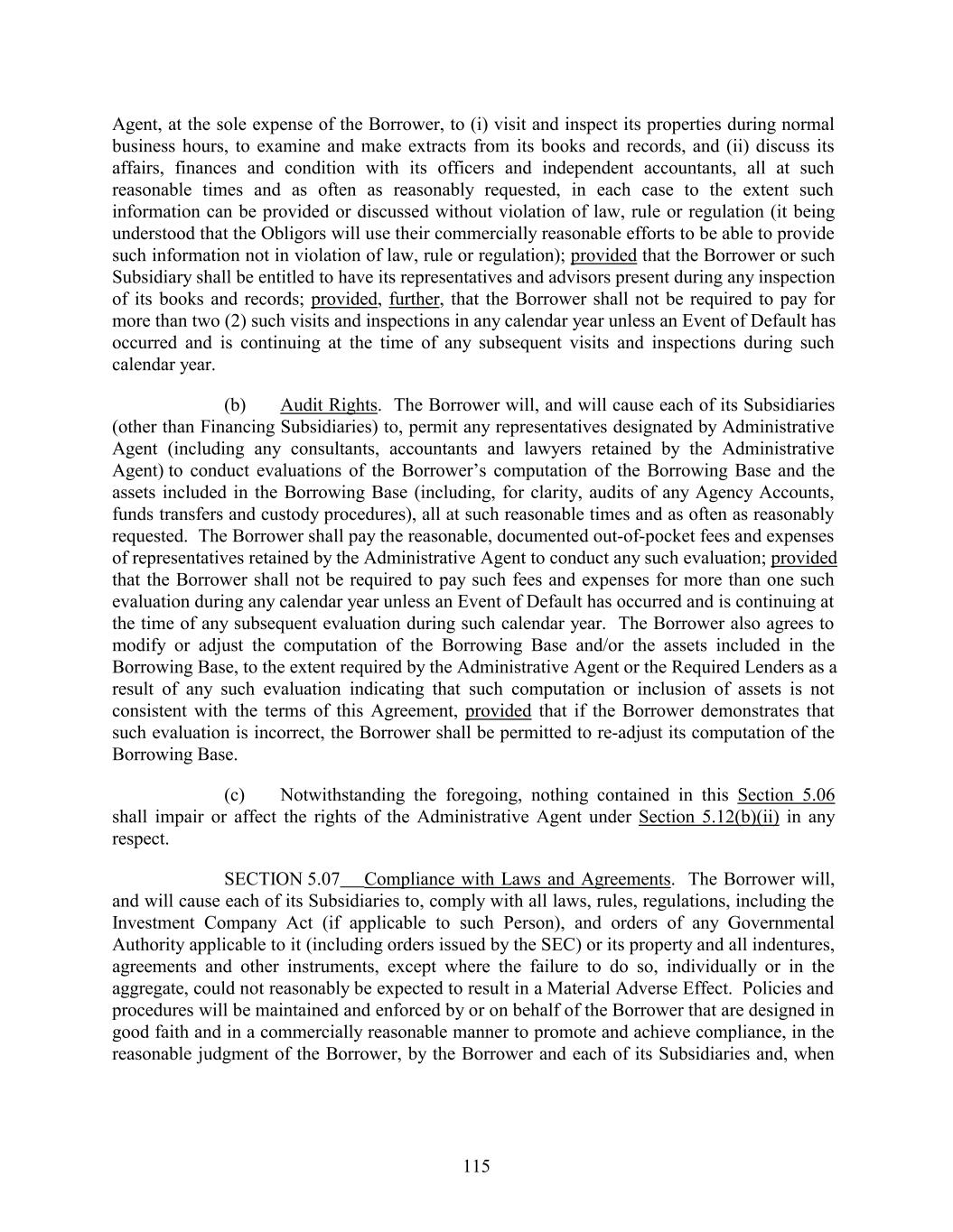 immediately deposited into a Control Account (or otherwise delivered to, or registered in the name of, the Collateral Agent) and, both prior to and following such deposit, delivery or registration such cash and other proceeds shall be held in trust by the Borrower for the benefit and as the property of the Collateral Agent and shall not be commingled with any other funds or property of such Obligor or any other Person (including with any money or financial assets of the Borrower in its capacity as “servicer” for a Structured Subsidiary, or any money or financial assets of a Structured Subsidiary, or any money or financial assets of the Borrower in its capacity as an “agent” or “administrative agent” for any other Bank Loans subject to Section 5.08(c)(v) below); (iii) cause the Financing Subsidiaries to execute and deliver to the Administrative Agent such certificates and agreements, in form and substance reasonably satisfactory to the Administrative Agent, as it shall determine are necessary to confirm that such Financing Subsidiary qualifies or continues to qualify as a “Structured Subsidiary” or an “SBIC Subsidiary”, as applicable, pursuant to the definitions thereof; (iv) in the case of any Portfolio Investment consisting of a Bank Loan that does not constitute all of the credit extended to the underlying borrower under the relevant underlying loan documents and a Financing Subsidiary holds any interest in the loans or other extensions of credit under such loan documents, (x) cause such Financing Subsidiary to be party to such underlying loan documents as a “lender” having a direct interest (or a participation interest not acquired from such Borrower or other Obligor) in such underlying loan documents and extensions of credit thereunder; and (y) ensure that, subject to Section 5.08(c)(v) below, all amounts owing to any Obligor by the underlying borrower or other obligated party are remitted by the borrower or obligated party (or the applicable administrative agents, collateral agents or equivalent Person) directly to the Custodian Account and no other amounts owing by such underlying borrower or obligated party are remitted to the Custodian Account; (v) in the event that any Obligor is acting as an agent or administrative agent under any loan documents with respect to any Bank Loan (or is acting in an analogous agency capacity under any agreement related to any Portfolio Investment) and such Obligor does not hold all of the credit extended to the underlying borrower or issuer under the relevant underlying loan documents or other agreements, ensure that (1) all funds held by such Obligor in such capacity as agent or administrative agent are segregated from all other funds of such Obligor and clearly identified as being held in an agency capacity (an “Agency Account”); (2) all amounts owing on account of such Bank Loan or Portfolio Investment by the underlying borrower or other obligated party are remitted by such borrower or obligated party to either (A) such Agency Account or (B) directly to an account in the name of the underlying lender to whom such amounts are owed (for the avoidance of doubt, no funds representing amounts owing to more than one underlying lender may be remitted to any single account other than the Agency Account); and (3) within two (2) Business Days after receipt of such funds, such Obligor acting in its capacity as agent or administrative agent shall distribute any such funds belonging to any Obligor to the Custodian Account (provided that if any distribution referred to in this clause (v) is not permitted by applicable bankruptcy law to be made within such two (2) Business Day period as a result of the bankruptcy of the underlying borrower, such 118