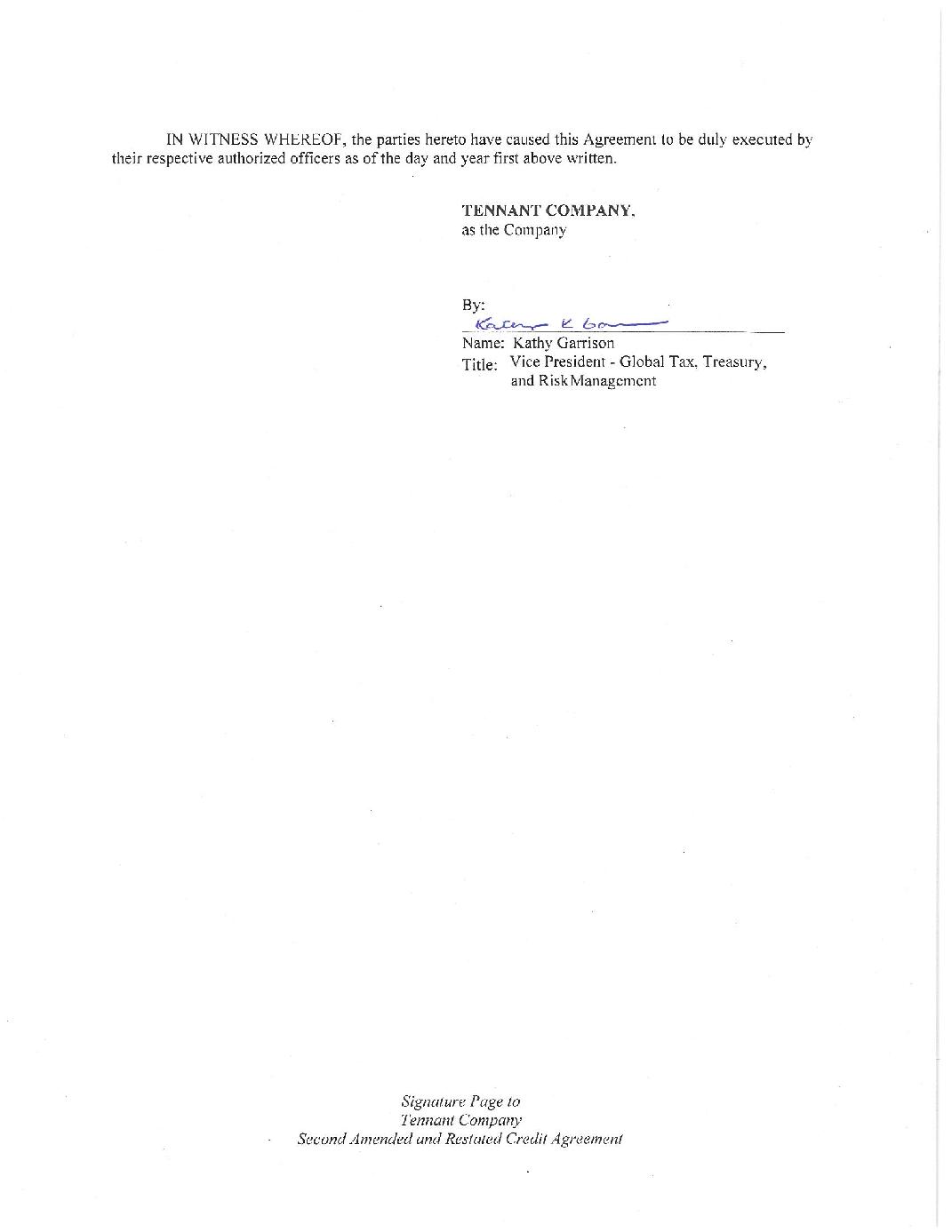 On August 7, 2024, Tennant Company (the “Company”) and the Foreign Subsidiary Borrowers from time to time party thereto entered into a Second Amended and Restated Credit Agreement (the “2024 Credit Agreement”) with JPMorgan Chase Bank, N. A. (“JPMorgan”), as administrative agent, U.S. Bank National Association and HSBC Bank USA, National Association, as co-syndication agents and BMO Bank N.A., The Huntington National Bank, PNC Bank, National Association and Wells Fargo Bank, National Association, as co-documentation agents. The 2024 Credit Agreement provides the Company and certain of its foreign subsidiaries access to a senior secured credit facility until August 7, 2029, consisting of a revolving facility in an amount up to $650 million, with an option to expand the revolving facility or obtain incremental term loans by up to $325 million, with the consent of the Lenders willing to provide additional borrowings in the form of increases to their revolving facility commitment or funding of incremental term loans. Borrowings may be denominated in U.S. dollars or certain other currencies.