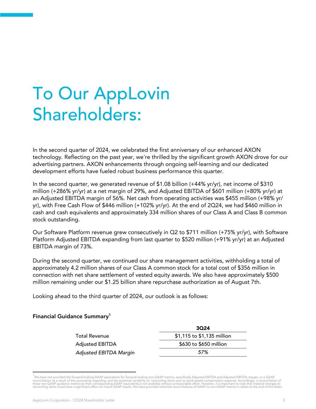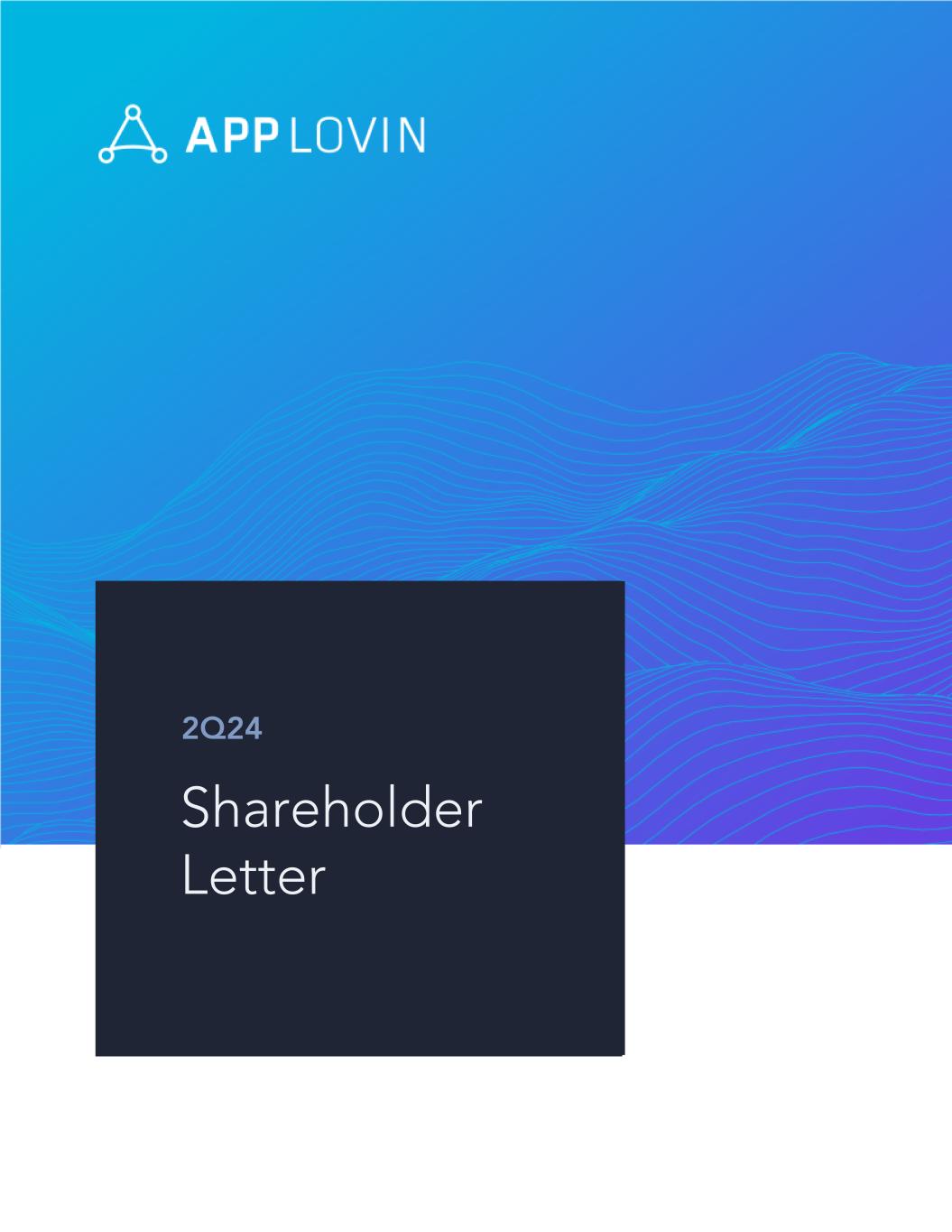 To Our AppLovin Shareholders: In the second quarter of 2024, we celebrated the first anniversary of our enhanced AXON technology. Reflecting on the past year, we're thrilled by the significant growth AXON drove for our advertising partners. AXON enhancements through ongoing self-learning and our dedicated development efforts have fueled robust business performance this quarter. In the second quarter, we generated revenue of $1.08 billion (+44% yr/yr), net income of $310 million (+286% yr/yr) at a net margin of 29%, and Adjusted EBITDA of $601 million (+80% yr/yr) at an Adjusted EBITDA margin of 56%. Net cash from operating activities was $455 million (+98% yr/ yr), with Free Cash Flow of $446 million (+102% yr/yr). At the end of 2Q24, we had $460 million in cash and cash equivalents and approximately 334 million shares of our Class A and Class B common stock outstanding. Our Software Platform revenue grew consecutively in Q2 to $711 million (+75% yr/yr), with Software Platform Adjusted EBITDA expanding from last quarter to $520 million (+91% yr/yr) at an Adjusted EBITDA margin of 73%. During the second quarter, we continued our share management activities, withholding a total of approximately 4.2 million shares of our Class A common stock for a total cost of $356 million in connection with net share settlement of vested equity awards. We also have approximately $500 million remaining under our $1.25 billion share repurchase authorization as of August 7th. Looking ahead to the third quarter of 2024, our outlook is as follows: Financial Guidance Summary1 3Q24 Total Revenue $1,115 to $1,135 million Adjusted EBITDA $630 to $650 million Adjusted EBITDA Margin 57% AppLovin Corporation / 2Q24 Shareholder Letter 2 1We have not provided the forward-looking GAAP equivalents for forward-looking non-GAAP metrics, specifically Adjusted EBITDA and Adjusted EBITDA margin, or a GAAP reconciliation as a result of the uncertainty regarding, and the potential variability of, reconciling items such as stock-based compensation expense. Accordingly, a reconciliation of these non-GAAP guidance metrics to their corresponding GAAP equivalents is not available without unreasonable effort. However, it is important to note that material changes to reconciling items could have a significant effect on future GAAP results. We have provided historical reconciliations of GAAP to non-GAAP metrics in tables at the end of this letter.