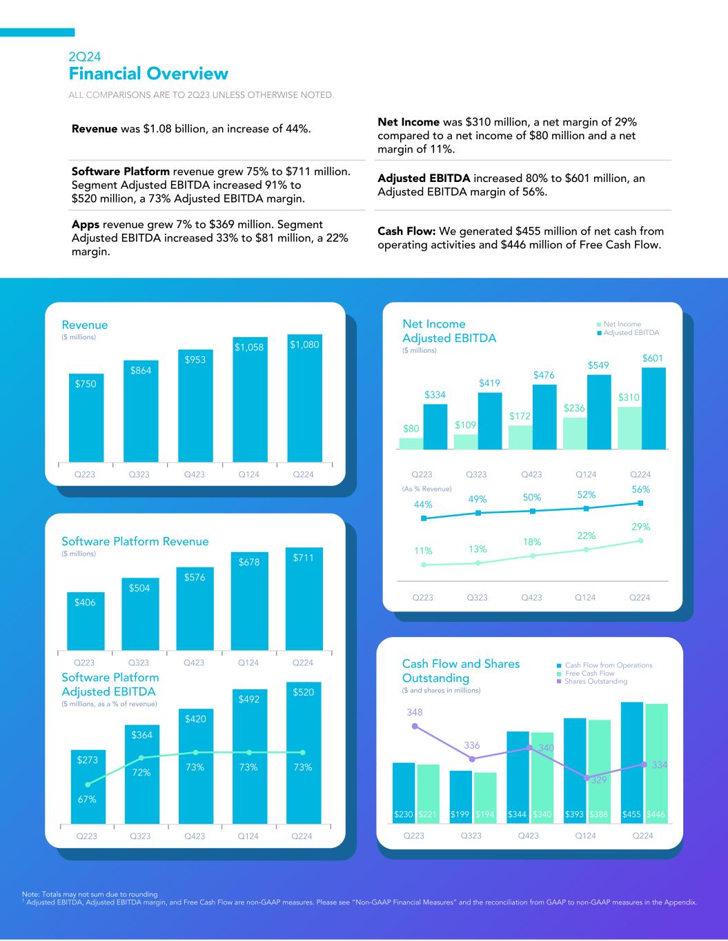 $750 $864 $953 $1,058 $1,080 Q223 Q323 Q423 Q124 Q224 Revenue ($ millions) $406 $504 $576 $678 $711 Q223 Q323 Q423 Q124 Q224 Software Platform Revenue ($ millions) $273 $364 $420 $492 $520 67% 72% 73% 73% 73% Q223 Q323 Q423 Q124 Q224 Software Platform Adjusted EBITDA ($ millions, as a % of revenue) $80 $109 $172 $236 $310$334 $419 $476 $549 $601 Q223 Q323 Q423 Q124 Q224 Net Income Adjusted EBITDA ($ millions) $230 $199 $344 $393 $455$221 $194 $340 $388 $446 348 336 340 329 334 Q223 Q323 Q423 Q124 Q224 Cash Flow and Shares Outstanding ($ and shares in millions) 2Q24 Financial Overview ALL COMPARISONS ARE TO 2Q23 UNLESS OTHERWISE NOTED. Note: Totals may not sum due to rounding 1 Adjusted EBITDA, Adjusted EBITDA margin, and Free Cash Flow are non-GAAP measures. Please see “Non-GAAP Financial Measures” and the reconciliation from GAAP to non-GAAP measures in the Appendix. Cash Flow from Operations Free Cash Flow Net Income Shares Outstanding Adjusted EBITDA 44% 49% 50% 52% 56% 11% 13% 18% 22% 29% Q223 Q323 Q423 Q124 Q224 Revenue was $1.08 billion, an increase of 44%. Net Income was $310 million, a net margin of 29% compared to a net income of $80 million and a net margin of 11%. Software Platform revenue grew 75% to $711 million. Segment Adjusted EBITDA increased 91% to $520 million, a 73% Adjusted EBITDA margin. Adjusted EBITDA increased 80% to $601 million, an Adjusted EBITDA margin of 56%. Apps revenue grew 7% to $369 million. Segment Adjusted EBITDA increased 33% to $81 million, a 22% margin. Cash Flow: We generated $455 million of net cash from operating activities and $446 million of Free Cash Flow. (As % Revenue) 329