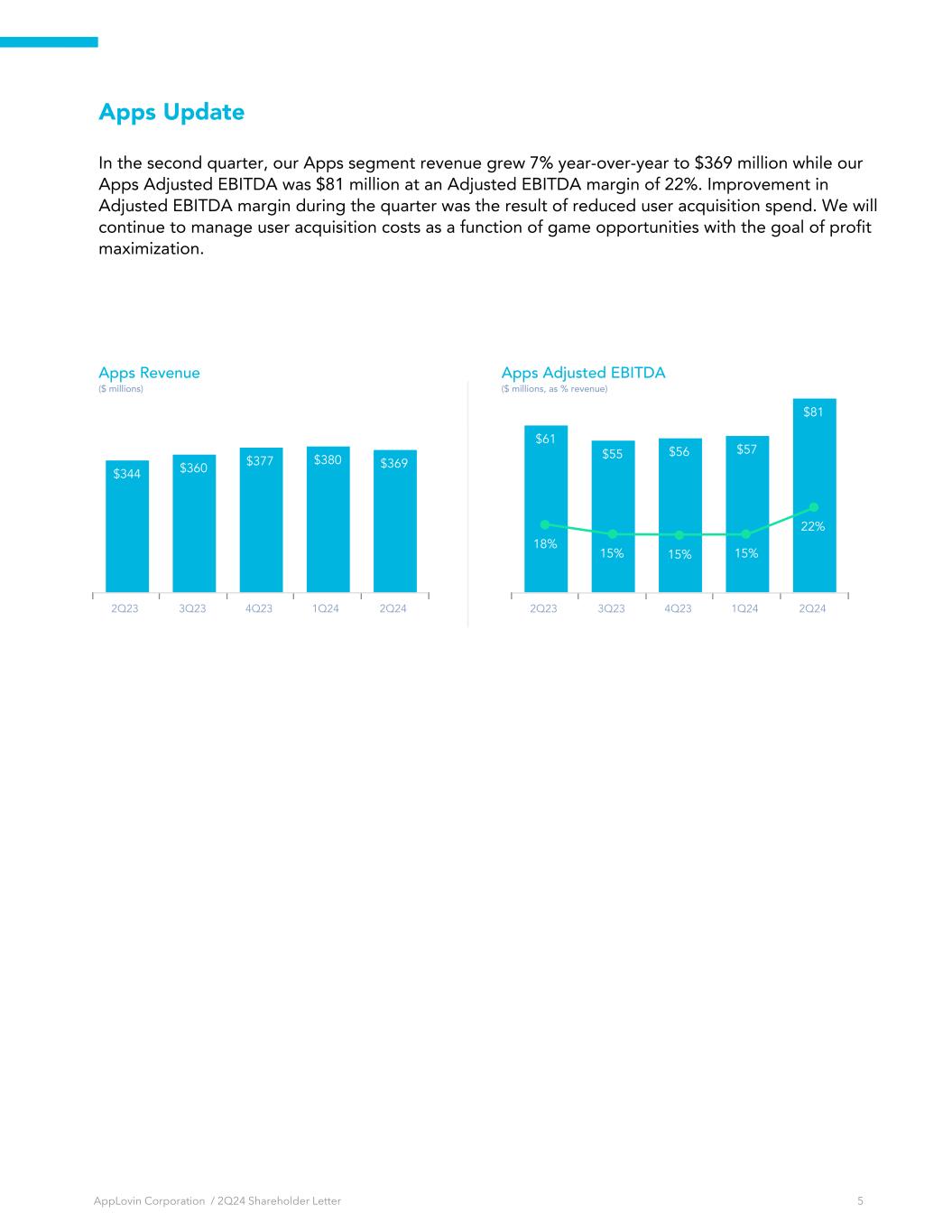 Apps Update In the second quarter, our Apps segment revenue grew 7% year-over-year to $369 million while our Apps Adjusted EBITDA was $81 million at an Adjusted EBITDA margin of 22%. Improvement in Adjusted EBITDA margin during the quarter was the result of reduced user acquisition spend. We will continue to manage user acquisition costs as a function of game opportunities with the goal of profit maximization. $344 $360 $377 $380 $369 2Q23 3Q23 4Q23 1Q24 2Q24 Apps Revenue ($ millions) $61 $55 $56 $57 $81 18% 15% 15% 15% 22% 2Q23 3Q23 4Q23 1Q24 2Q24 Apps Adjusted EBITDA ($ millions, as % revenue) AppLovin Corporation / 2Q24 Shareholder Letter 5