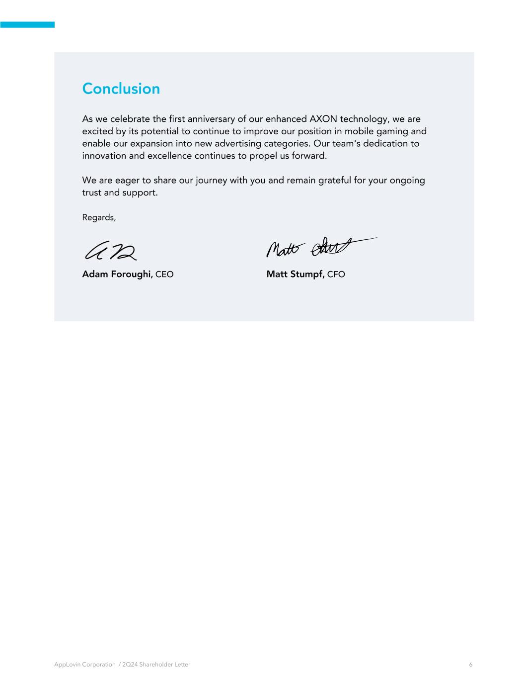 Conclusion As we celebrate the first anniversary of our enhanced AXON technology, we are excited by its potential to continue to improve our position in mobile gaming and enable our expansion into new advertising categories. Our team's dedication to innovation and excellence continues to propel us forward. We are eager to share our journey with you and remain grateful for your ongoing trust and support. Regards, Adam Foroughi, CEO Matt Stumpf, CFO AppLovin Corporation / 2Q24 Shareholder Letter 6