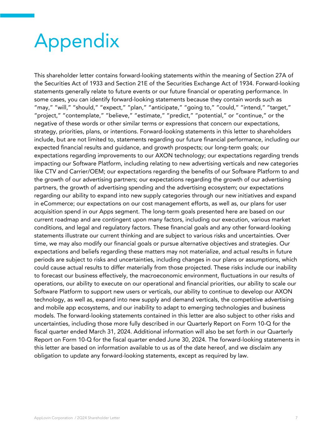 Appendix This shareholder letter contains forward-looking statements within the meaning of Section 27A of the Securities Act of 1933 and Section 21E of the Securities Exchange Act of 1934. Forward-looking statements generally relate to future events or our future financial or operating performance. In some cases, you can identify forward-looking statements because they contain words such as “may,” “will,” “should,” “expect,” “plan,” “anticipate,” “going to,” “could,” “intend,” “target,” “project,” “contemplate,” “believe,” “estimate,” “predict,” “potential,” or “continue,” or the negative of these words or other similar terms or expressions that concern our expectations, strategy, priorities, plans, or intentions. Forward-looking statements in this letter to shareholders include, but are not limited to, statements regarding our future financial performance, including our expected financial results and guidance, and growth prospects; our long-term goals; our expectations regarding improvements to our AXON technology; our expectations regarding trends impacting our Software Platform, including relating to new advertising verticals and new categories like CTV and Carrier/OEM; our expectations regarding the benefits of our Software Platform to and the growth of our advertising partners; our expectations regarding the growth of our advertising partners, the growth of advertising spending and the advertising ecosystem; our expectations regarding our ability to expand into new supply categories through our new initiatives and expand in eCommerce; our expectations on our cost management efforts, as well as, our plans for user acquisition spend in our Apps segment. The long-term goals presented here are based on our current roadmap and are contingent upon many factors, including our execution, various market conditions, and legal and regulatory factors. These financial goals and any other forward-looking statements illustrate our current thinking and are subject to various risks and uncertainties. Over time, we may also modify our financial goals or pursue alternative objectives and strategies. Our expectations and beliefs regarding these matters may not materialize, and actual results in future periods are subject to risks and uncertainties, including changes in our plans or assumptions, which could cause actual results to differ materially from those projected. These risks include our inability to forecast our business effectively, the macroeconomic environment, fluctuations in our results of operations, our ability to execute on our operational and financial priorities, our ability to scale our Software Platform to support new users or verticals, our ability to continue to develop our AXON technology, as well as, expand into new supply and demand verticals, the competitive advertising and mobile app ecosystems, and our inability to adapt to emerging technologies and business models. The forward-looking statements contained in this letter are also subject to other risks and uncertainties, including those more fully described in our Quarterly Report on Form 10-Q for the fiscal quarter ended March 31, 2024. Additional information will also be set forth in our Quarterly Report on Form 10-Q for the fiscal quarter ended June 30, 2024. The forward-looking statements in this letter are based on information available to us as of the date hereof, and we disclaim any obligation to update any forward-looking statements, except as required by law. AppLovin Corporation / 2Q24 Shareholder Letter 7