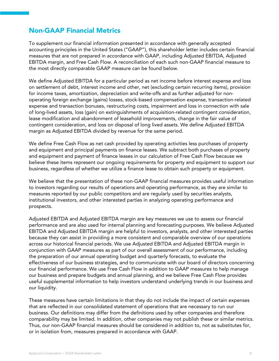 Non-GAAP Financial Metrics To supplement our financial information presented in accordance with generally accepted accounting principles in the United States (“GAAP”), this shareholder letter includes certain financial measures that are not prepared in accordance with GAAP, including Adjusted EBITDA, Adjusted EBITDA margin, and Free Cash Flow. A reconciliation of each such non-GAAP financial measure to the most directly comparable GAAP measure can be found below. We define Adjusted EBITDA for a particular period as net income before interest expense and loss on settlement of debt, interest income and other, net (excluding certain recurring items), provision for income taxes, amortization, depreciation and write-offs and as further adjusted for non- operating foreign exchange (gains) losses, stock-based compensation expense, transaction-related expense and transaction bonuses, restructuring costs, impairment and loss in connection with sale of long-lived assets, loss (gain) on extinguishments of acquisition-related contingent consideration, lease modification and abandonment of leasehold improvements, change in the fair value of contingent consideration, and loss on disposal of long lived assets. We define Adjusted EBITDA margin as Adjusted EBITDA divided by revenue for the same period. We define Free Cash Flow as net cash provided by operating activities less purchases of property and equipment and principal payments on finance leases. We subtract both purchases of property and equipment and payment of finance leases in our calculation of Free Cash Flow because we believe these items represent our ongoing requirements for property and equipment to support our business, regardless of whether we utilize a finance lease to obtain such property or equipment. We believe that the presentation of these non-GAAP financial measures provides useful information to investors regarding our results of operations and operating performance, as they are similar to measures reported by our public competitors and are regularly used by securities analysts, institutional investors, and other interested parties in analyzing operating performance and prospects. Adjusted EBITDA and Adjusted EBITDA margin are key measures we use to assess our financial performance and are also used for internal planning and forecasting purposes. We believe Adjusted EBITDA and Adjusted EBITDA margin are helpful to investors, analysts, and other interested parties because they can assist in providing a more consistent and comparable overview of our operations across our historical financial periods. We use Adjusted EBITDA and Adjusted EBITDA margin in conjunction with GAAP measures as part of our overall assessment of our performance, including the preparation of our annual operating budget and quarterly forecasts, to evaluate the effectiveness of our business strategies, and to communicate with our board of directors concerning our financial performance. We use Free Cash Flow in addition to GAAP measures to help manage our business and prepare budgets and annual planning, and we believe Free Cash Flow provides useful supplemental information to help investors understand underlying trends in our business and our liquidity. These measures have certain limitations in that they do not include the impact of certain expenses that are reflected in our consolidated statement of operations that are necessary to run our business. Our definitions may differ from the definitions used by other companies and therefore comparability may be limited. In addition, other companies may not publish these or similar metrics. Thus, our non-GAAP financial measures should be considered in addition to, not as substitutes for, or in isolation from, measures prepared in accordance with GAAP. AppLovin Corporation / 2Q24 Shareholder Letter 8