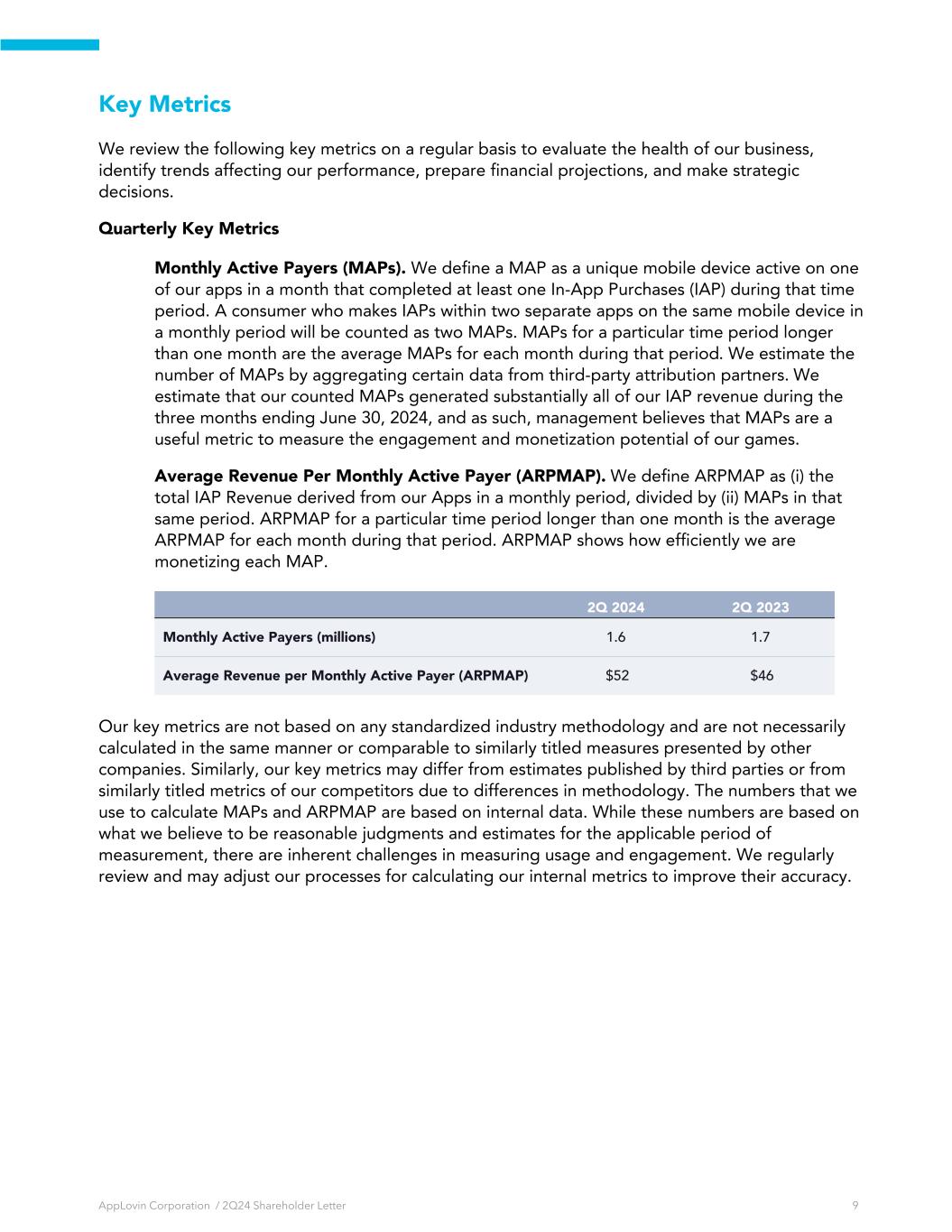 Key Metrics We review the following key metrics on a regular basis to evaluate the health of our business, identify trends affecting our performance, prepare financial projections, and make strategic decisions. Quarterly Key Metrics Monthly Active Payers (MAPs). We define a MAP as a unique mobile device active on one of our apps in a month that completed at least one In-App Purchases (IAP) during that time period. A consumer who makes IAPs within two separate apps on the same mobile device in a monthly period will be counted as two MAPs. MAPs for a particular time period longer than one month are the average MAPs for each month during that period. We estimate the number of MAPs by aggregating certain data from third-party attribution partners. We estimate that our counted MAPs generated substantially all of our IAP revenue during the three months ending June 30, 2024, and as such, management believes that MAPs are a useful metric to measure the engagement and monetization potential of our games. Average Revenue Per Monthly Active Payer (ARPMAP). We define ARPMAP as (i) the total IAP Revenue derived from our Apps in a monthly period, divided by (ii) MAPs in that same period. ARPMAP for a particular time period longer than one month is the average ARPMAP for each month during that period. ARPMAP shows how efficiently we are monetizing each MAP. 2Q 2024 2Q 2023 Monthly Active Payers (millions) 1.6 1.7 Average Revenue per Monthly Active Payer (ARPMAP) $52 $46 Our key metrics are not based on any standardized industry methodology and are not necessarily calculated in the same manner or comparable to similarly titled measures presented by other companies. Similarly, our key metrics may differ from estimates published by third parties or from similarly titled metrics of our competitors due to differences in methodology. The numbers that we use to calculate MAPs and ARPMAP are based on internal data. While these numbers are based on what we believe to be reasonable judgments and estimates for the applicable period of measurement, there are inherent challenges in measuring usage and engagement. We regularly review and may adjust our processes for calculating our internal metrics to improve their accuracy. AppLovin Corporation / 2Q24 Shareholder Letter 9