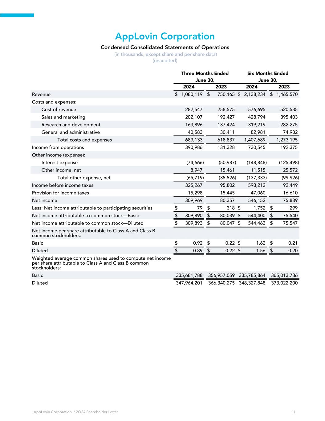 AppLovin Corporation Condensed Consolidated Statements of Operations (in thousands, except share and per share data) (unaudited) Three Months Ended Six Months Ended June 30, June 30, 2024 2023 2024 2023 Revenue $ 1,080,119 $ 750,165 $ 2,138,234 $ 1,465,570 Costs and expenses: Cost of revenue 282,547 258,575 576,695 520,535 Sales and marketing 202,107 192,427 428,794 395,403 Research and development 163,896 137,424 319,219 282,275 General and administrative 40,583 30,411 82,981 74,982 Total costs and expenses 689,133 618,837 1,407,689 1,273,195 Income from operations 390,986 131,328 730,545 192,375 Other income (expense): Interest expense (74,666) (50,987) (148,848) (125,498) Other income, net 8,947 15,461 11,515 25,572 Total other expense, net (65,719) (35,526) (137,333) (99,926) Income before income taxes 325,267 95,802 593,212 92,449 Provision for income taxes 15,298 15,445 47,060 16,610 Net income 309,969 80,357 546,152 75,839 Less: Net income attributable to participating securities $ 79 $ 318 $ 1,752 $ 299 Net income attributable to common stock—Basic $ 309,890 $ 80,039 $ 544,400 $ 75,540 Net income attributable to common stock—Diluted $ 309,893 $ 80,047 $ 544,463 $ 75,547 Net income per share attributable to Class A and Class B common stockholders: Basic $ 0.92 $ 0.22 $ 1.62 $ 0.21 Diluted $ 0.89 $ 0.22 $ 1.56 $ 0.20 Weighted average common shares used to compute net income per share attributable to Class A and Class B common stockholders: Basic 335,681,788 356,957,059 335,785,864 365,013,736 Diluted 347,964,201 366,340,275 348,327,848 373,022,200 AppLovin Corporation / 2Q24 Shareholder Letter 11