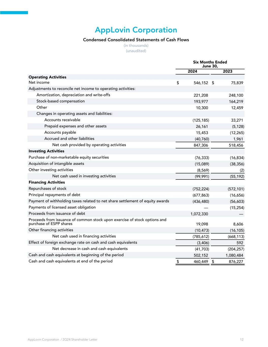 AppLovin Corporation Condensed Consolidated Statements of Cash Flows (in thousands) (unaudited) Six Months Ended June 30, 2024 2023 Operating Activities Net income $ 546,152 $ 75,839 Adjustments to reconcile net income to operating activities: Amortization, depreciation and write-offs 221,208 248,100 Stock-based compensation 193,977 164,219 Other 10,300 12,459 Changes in operating assets and liabilities: Accounts receivable (125,185) 33,271 Prepaid expenses and other assets 26,161 (5,128) Accounts payable 15,453 (12,265) Accrued and other liabilities (40,760) 1,961 Net cash provided by operating activities 847,306 518,456 Investing Activities Purchase of non-marketable equity securities (76,333) (16,834) Acquisition of intangible assets (15,089) (38,356) Other investing activities (8,569) (2) Net cash used in investing activities (99,991) (55,192) Financing Activities Repurchases of stock (752,224) (572,101) Principal repayments of debt (677,863) (16,656) Payment of withholding taxes related to net share settlement of equity awards (436,480) (56,603) Payments of licensed asset obligation — (15,254) Proceeds from issuance of debt 1,072,330 — Proceeds from issuance of common stock upon exercise of stock options and purchase of ESPP shares 19,098 8,606 Other financing activities (10,473) (16,105) Net cash used in financing activities (785,612) (668,113) Effect of foreign exchange rate on cash and cash equivalents (3,406) 592 Net decrease in cash and cash equivalents (41,703) (204,257) Cash and cash equivalents at beginning of the period 502,152 1,080,484 Cash and cash equivalents at end of the period $ 460,449 $ 876,227 AppLovin Corporation / 2Q24 Shareholder Letter 12