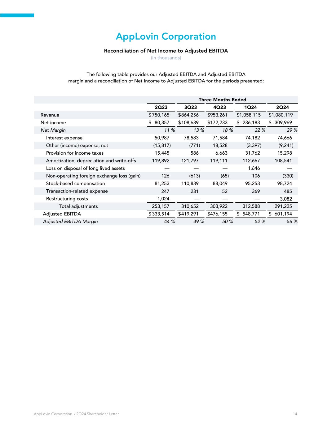 AppLovin Corporation Reconciliation of Net Income to Adjusted EBITDA (in thousands) The following table provides our Adjusted EBITDA and Adjusted EBITDA margin and a reconciliation of Net Income to Adjusted EBITDA for the periods presented: Three Months Ended 2Q23 3Q23 4Q23 1Q24 2Q24 Revenue $ 750,165 $ 864,256 $ 953,261 $ 1,058,115 $ 1,080,119 Net income $ 80,357 $ 108,639 $ 172,233 $ 236,183 $ 309,969 Net Margin 11 % 13 % 18 % 22 % 29 % Interest expense 50,987 78,583 71,584 74,182 74,666 Other (income) expense, net (15,817) (771) 18,528 (3,397) (9,241) Provision for income taxes 15,445 586 6,663 31,762 15,298 Amortization, depreciation and write-offs 119,892 121,797 119,111 112,667 108,541 Loss on disposal of long lived assets — — — 1,646 — Non-operating foreign exchange loss (gain) 126 (613) (65) 106 (330) Stock-based compensation 81,253 110,839 88,049 95,253 98,724 Transaction-related expense 247 231 52 369 485 Restructuring costs 1,024 — — — 3,082 Total adjustments 253,157 310,652 303,922 312,588 291,225 Adjusted EBITDA $ 333,514 $ 419,291 $ 476,155 $ 548,771 $ 601,194 Adjusted EBITDA Margin 44 % 49 % 50 % 52 % 56 % AppLovin Corporation / 2Q24 Shareholder Letter 14