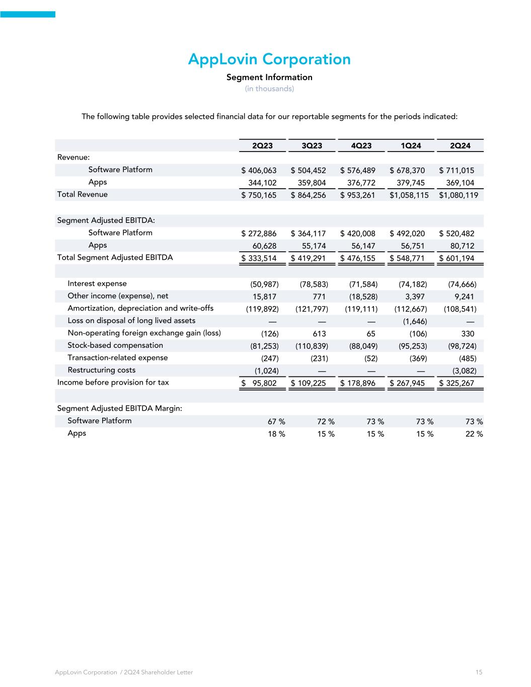 AppLovin Corporation Segment Information (in thousands) The following table provides selected financial data for our reportable segments for the periods indicated: 2Q23 3Q23 4Q23 1Q24 2Q24 Revenue: Software Platform $ 406,063 $ 504,452 $ 576,489 $ 678,370 $ 711,015 Apps 344,102 359,804 376,772 379,745 369,104 Total Revenue $ 750,165 $ 864,256 $ 953,261 $ 1,058,115 $ 1,080,119 Segment Adjusted EBITDA: Software Platform $ 272,886 $ 364,117 $ 420,008 $ 492,020 $ 520,482 Apps 60,628 55,174 56,147 56,751 80,712 Total Segment Adjusted EBITDA $ 333,514 $ 419,291 $ 476,155 $ 548,771 $ 601,194 Interest expense (50,987) (78,583) (71,584) (74,182) (74,666) Other income (expense), net 15,817 771 (18,528) 3,397 9,241 Amortization, depreciation and write-offs (119,892) (121,797) (119,111) (112,667) (108,541) Loss on disposal of long lived assets — — — (1,646) — Non-operating foreign exchange gain (loss) (126) 613 65 (106) 330 Stock-based compensation (81,253) (110,839) (88,049) (95,253) (98,724) Transaction-related expense (247) (231) (52) (369) (485) Restructuring costs (1,024) — — — (3,082) Income before provision for tax $ 95,802 $ 109,225 $ 178,896 $ 267,945 $ 325,267 Segment Adjusted EBITDA Margin: Software Platform 67 % 72 % 73 % 73 % 73 % Apps 18 % 15 % 15 % 15 % 22 % AppLovin Corporation / 2Q24 Shareholder Letter 15