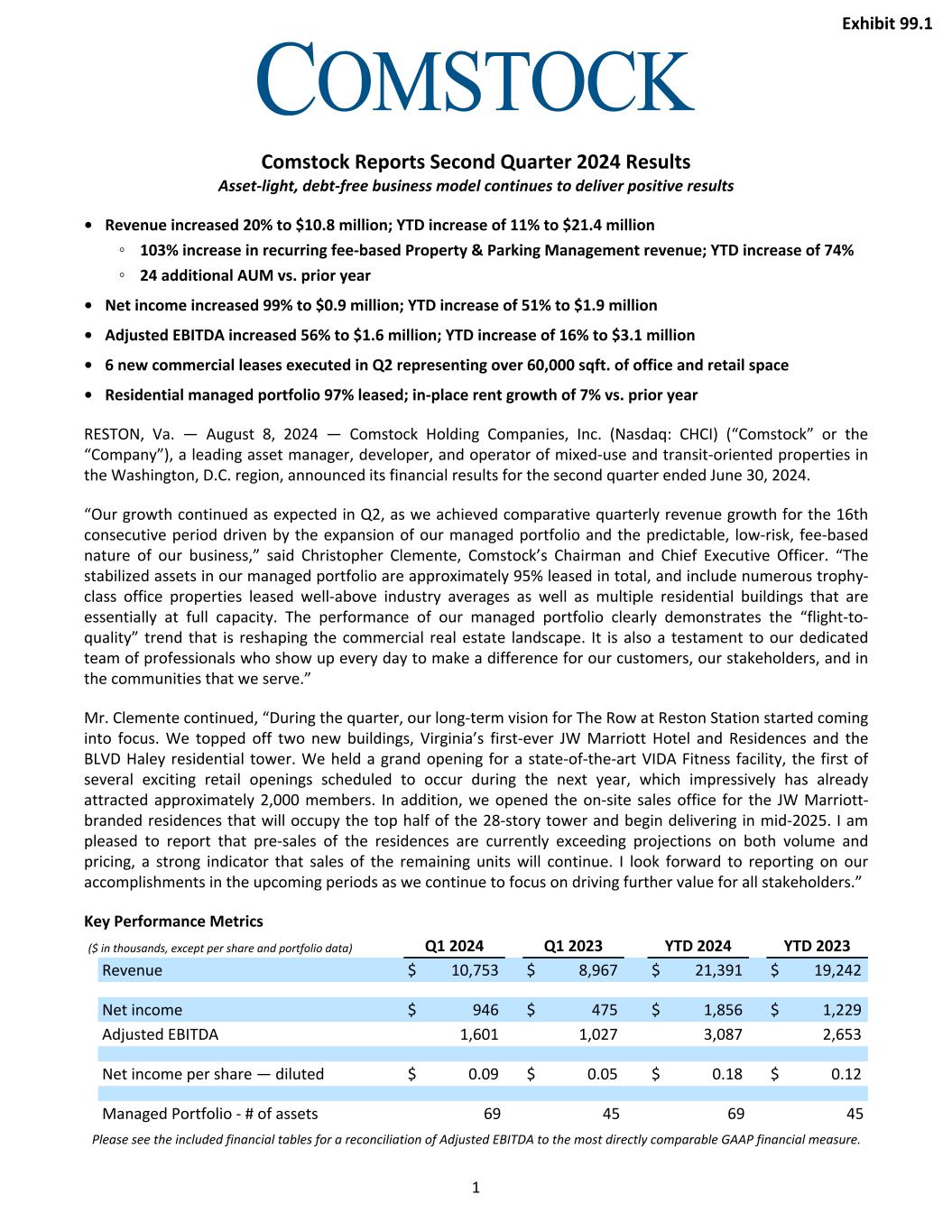 Comstock Reports Second Quarter 2024 Results Asset-light, debt-free business model continues to deliver positive results • Revenue increased 20% to $10.8 million; YTD increase of 11% to $21.4 million ◦ 103% increase in recurring fee-based Property & Parking Management revenue; YTD increase of 74% ◦ 24 additional AUM vs. prior year • Net income increased 99% to $0.9 million; YTD increase of 51% to $1.9 million • Adjusted EBITDA increased 56% to $1.6 million; YTD increase of 16% to $3.1 million • 6 new commercial leases executed in Q2 representing over 60,000 sqft. of office and retail space • Residential managed portfolio 97% leased; in-place rent growth of 7% vs. prior year RESTON, Va. — August 8, 2024 — Comstock Holding Companies, Inc. (Nasdaq: CHCI) (“Comstock” or the “Company”), a leading asset manager, developer, and operator of mixed-use and transit-oriented properties in the Washington, D.C. region, announced its financial results for the second quarter ended June 30, 2024. “Our growth continued as expected in Q2, as we achieved comparative quarterly revenue growth for the 16th consecutive period driven by the expansion of our managed portfolio and the predictable, low-risk, fee-based nature of our business,” said Christopher Clemente, Comstock’s Chairman and Chief Executive Officer. “The stabilized assets in our managed portfolio are approximately 95% leased in total, and include numerous trophy- class office properties leased well-above industry averages as well as multiple residential buildings that are essentially at full capacity. The performance of our managed portfolio clearly demonstrates the “flight-to- quality” trend that is reshaping the commercial real estate landscape. It is also a testament to our dedicated team of professionals who show up every day to make a difference for our customers, our stakeholders, and in the communities that we serve.” Mr. Clemente continued, “During the quarter, our long-term vision for The Row at Reston Station started coming into focus. We topped off two new buildings, Virginia’s first-ever JW Marriott Hotel and Residences and the BLVD Haley residential tower. We held a grand opening for a state-of-the-art VIDA Fitness facility, the first of several exciting retail openings scheduled to occur during the next year, which impressively has already attracted approximately 2,000 members. In addition, we opened the on-site sales office for the JW Marriott- branded residences that will occupy the top half of the 28-story tower and begin delivering in mid-2025. I am pleased to report that pre-sales of the residences are currently exceeding projections on both volume and pricing, a strong indicator that sales of the remaining units will continue. I look forward to reporting on our accomplishments in the upcoming periods as we continue to focus on driving further value for all stakeholders.” Key Performance Metrics ($ in thousands, except per share and portfolio data) Q1 2024 Q1 2023 YTD 2024 YTD 2023 Revenue $ 10,753 $ 8,967 $ 21,391 $ 19,242 Net income $ 946 $ 475 $ 1,856 $ 1,229 Adjusted EBITDA 1,601 1,027 3,087 2,653 Net income per share — diluted $ 0.09 $ 0.05 $ 0.18 $ 0.12 Managed Portfolio - # of assets 69 45 69 45 Please see the included financial tables for a reconciliation of Adjusted EBITDA to the most directly comparable GAAP financial measure. 1 Exhibit 99.1