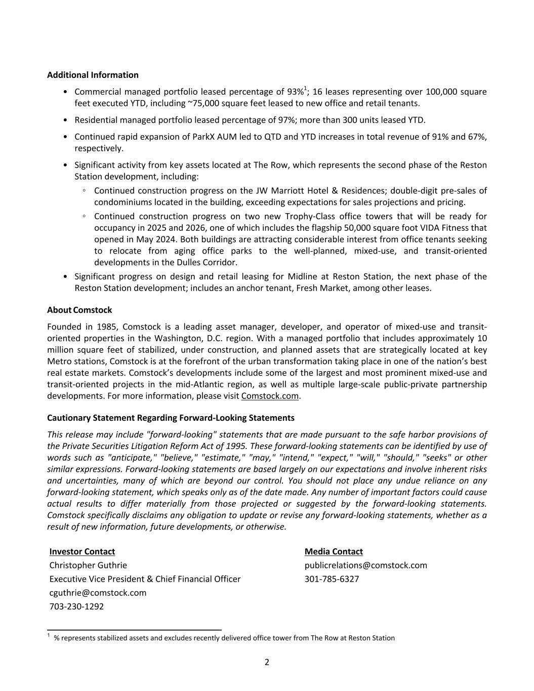 Additional Information • Commercial managed portfolio leased percentage of 93%1; 16 leases representing over 100,000 square feet executed YTD, including ~75,000 square feet leased to new office and retail tenants. • Residential managed portfolio leased percentage of 97%; more than 300 units leased YTD. • Continued rapid expansion of ParkX AUM led to QTD and YTD increases in total revenue of 91% and 67%, respectively. • Significant activity from key assets located at The Row, which represents the second phase of the Reston Station development, including: ◦ Continued construction progress on the JW Marriott Hotel & Residences; double-digit pre-sales of condominiums located in the building, exceeding expectations for sales projections and pricing. ◦ Continued construction progress on two new Trophy-Class office towers that will be ready for occupancy in 2025 and 2026, one of which includes the flagship 50,000 square foot VIDA Fitness that opened in May 2024. Both buildings are attracting considerable interest from office tenants seeking to relocate from aging office parks to the well-planned, mixed-use, and transit-oriented developments in the Dulles Corridor. • Significant progress on design and retail leasing for Midline at Reston Station, the next phase of the Reston Station development; includes an anchor tenant, Fresh Market, among other leases. About Comstock Founded in 1985, Comstock is a leading asset manager, developer, and operator of mixed-use and transit- oriented properties in the Washington, D.C. region. With a managed portfolio that includes approximately 10 million square feet of stabilized, under construction, and planned assets that are strategically located at key Metro stations, Comstock is at the forefront of the urban transformation taking place in one of the nation’s best real estate markets. Comstock’s developments include some of the largest and most prominent mixed-use and transit-oriented projects in the mid-Atlantic region, as well as multiple large-scale public-private partnership developments. For more information, please visit Comstock.com. Cautionary Statement Regarding Forward-Looking Statements This release may include "forward-looking" statements that are made pursuant to the safe harbor provisions of the Private Securities Litigation Reform Act of 1995. These forward-looking statements can be identified by use of words such as "anticipate," "believe," "estimate," "may," "intend," "expect," "will," "should," "seeks" or other similar expressions. Forward-looking statements are based largely on our expectations and involve inherent risks and uncertainties, many of which are beyond our control. You should not place any undue reliance on any forward-looking statement, which speaks only as of the date made. Any number of important factors could cause actual results to differ materially from those projected or suggested by the forward-looking statements. Comstock specifically disclaims any obligation to update or revise any forward-looking statements, whether as a result of new information, future developments, or otherwise. Investor Contact Media Contact Christopher Guthrie publicrelations@comstock.com Executive Vice President & Chief Financial Officer 301-785-6327 cguthrie@comstock.com 703-230-1292 2 1 % represents stabilized assets and excludes recently delivered office tower from The Row at Reston Station