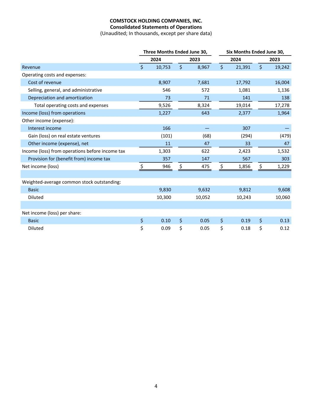 Three Months Ended June 30, Six Months Ended June 30, 2024 2023 2024 2023 Revenue $ 10,753 $ 8,967 $ 21,391 $ 19,242 Operating costs and expenses: Cost of revenue 8,907 7,681 17,792 16,004 Selling, general, and administrative 546 572 1,081 1,136 Depreciation and amortization 73 71 141 138 Total operating costs and expenses 9,526 8,324 19,014 17,278 Income (loss) from operations 1,227 643 2,377 1,964 Other income (expense): Interest income 166 — 307 — Gain (loss) on real estate ventures (101) (68) (294) (479) Other income (expense), net 11 47 33 47 Income (loss) from operations before income tax 1,303 622 2,423 1,532 Provision for (benefit from) income tax 357 147 567 303 Net income (loss) $ 946 $ 475 $ 1,856 $ 1,229 Weighted-average common stock outstanding: Basic 9,830 9,632 9,812 9,608 Diluted 10,300 10,052 10,243 10,060 Net income (loss) per share: Basic $ 0.10 $ 0.05 $ 0.19 $ 0.13 Diluted $ 0.09 $ 0.05 $ 0.18 $ 0.12 COMSTOCK HOLDING COMPANIES, INC. Consolidated Statements of Operations (Unaudited; In thousands, except per share data) 4