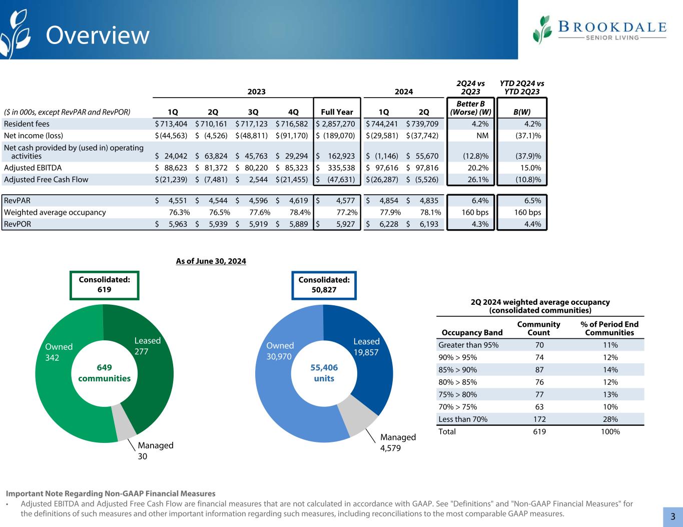 3 Managed 4,579 Owned 30,970 Leased 19,857 Managed 30 Owned 342 Leased 277 649 communities 55,406 units Important Note Regarding Non-GAAP Financial Measures • Adjusted EBITDA and Adjusted Free Cash Flow are financial measures that are not calculated in accordance with GAAP. See "Definitions" and "Non-GAAP Financial Measures" for the definitions of such measures and other important information regarding such measures, including reconciliations to the most comparable GAAP measures. 2023 2024 2Q24 vs 2Q23 YTD 2Q24 vs YTD 2Q23 ($ in 000s, except RevPAR and RevPOR) 1Q 2Q 3Q 4Q Full Year 1Q 2Q Better B (Worse) (W) B(W) Resident fees $ 713,404 $ 710,161 $ 717,123 $ 716,582 $ 2,857,270 $ 744,241 $ 739,709 $ 1,483,950 4.2 % 4.2 % Net income (loss) $ (44,563) $ (4,526) $ (48,811) $ (91,170) $ (189,070) $ (29,581) $ (37,742) NM (37.1) % Net cash provided by (used in) operating activities $ 24,042 $ 63,824 $ 45,763 $ 29,294 $ 162,923 $ (1,146) $ 55,670 (12.8) % (37.9) % Adjusted EBITDA $ 88,623 $ 81,372 $ 80,220 $ 85,323 $ 335,538 $ 97,616 $ 97,816 20.2 % 15.0 % Adjusted Free Cash Flow $ (21,239) $ (7,481) $ 2,544 $ (21,455) $ (47,631) $ (26,287) $ (5,526) 26.1 % (10.8) % RevPAR $ 4,551 $ 4,544 $ 4,596 $ 4,619 $ 4,577 $ 4,854 $ 4,835 6.4 % 6.5 % Weighted average occupancy 76.3% 76.5% 77.6% 78.4% 77.2% 77.9% 78.1% 160 bps 160 bps RevPOR $ 5,963 $ 5,939 $ 5,919 $ 5,889 $ 5,927 $ 6,228 $ 6,193 4.3 % 4.4 % 2Q 2024 weighted average occupancy (consolidated communities) Occupancy Band Community Count % of Period End Communities Greater than 95% 70 11% 90% > 95% 74 12% 85% > 90% 87 14% 80% > 85% 76 12% 75% > 80% 77 13% 70% > 75% 63 10% Less than 70% 172 28% Total 619 100% Overview As of June 30, 2024 Consolidated: 50,827 Consolidated: 619