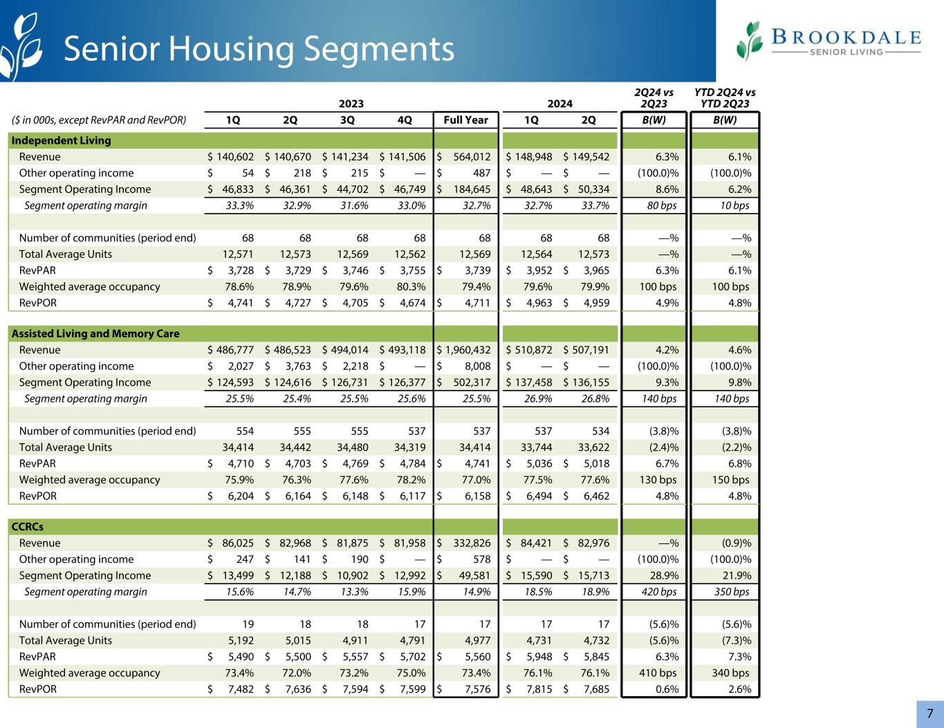 6 2023 2024 2Q24 vs 2Q23 YTD 2Q24 vs YTD 2Q23 ($ in 000s, except RevPAR and RevPOR) 1Q 2Q 3Q 4Q Full Year 1Q 2Q B(W) B(W) Total Senior Housing and All Other Revenue (1) $ 715,981 $ 712,671 $ 719,689 $ 719,090 $ 2,867,431 $ 746,859 $ 742,325 4.2 % 4.2 % Other operating income $ 2,328 $ 4,122 $ 2,623 $ — $ 9,073 $ — $ — (100.0) % (100.0) % Combined Segment Operating Income $ 187,502 $ 185,675 $ 184,901 $ 188,626 $ 746,704 $ 204,309 $ 204,818 10.3 % 9.6 % Combined segment operating margin 26.1 % 25.9 % 25.6 % 26.2 % 26.0 % 27.4 % 27.6 % 170 bps 150 bps Combined segment adjusted operating margin (2) 25.9 % 25.5 % 25.3 % 26.2 % 25.7 % 27.4 % 27.6 % 210 bps 180 bps Senior Housing Segments (see page 7) Revenue $ 713,404 $ 710,161 $ 717,123 $ 716,582 $ 2,857,270 $ 744,241 $ 739,709 4.2 % 4.2 % Other operating income $ 2,328 $ 4,122 $ 2,623 $ — $ 9,073 $ — $ — (100.0) % (100.0) % Senior Housing Operating Income $ 184,925 $ 183,165 $ 182,335 $ 186,118 $ 736,543 $ 201,691 $ 202,202 10.4 % 9.7 % Operating margin 25.8 % 25.6 % 25.3 % 26.0 % 25.7 % 27.1 % 27.3 % 170 bps 150 bps Adjusted operating margin (2) 25.6 % 25.2 % 25.1 % 26.0 % 25.5 % 27.1 % 27.3 % 210 bps 180 bps Number of communities (period end) 641 641 641 622 622 622 619 (3.4) % (3.4) % Total Average Units 52,177 52,030 51,960 51,672 51,960 51,039 50,927 (2.1) % (2.2) % RevPAR $ 4,551 $ 4,544 $ 4,596 $ 4,619 $ 4,577 $ 4,854 $ 4,835 6.4 % 6.5 % Weighted average occupancy 76.3 % 76.5 % 77.6 % 78.4 % 77.2 % 77.9 % 78.1 % 160 bps 160 bps RevPOR $ 5,963 $ 5,939 $ 5,919 $ 5,889 $ 5,927 $ 6,228 $ 6,193 4.3 % 4.4 % All Other All Other Segment Operating Income (comprised solely of management fees) $ 2,577 $ 2,510 $ 2,566 $ 2,508 $ 10,161 $ 2,618 $ 2,616 4.2 % 2.9 % Resident fee revenue under management (3) $ 54,820 $ 53,373 $ 54,246 $ 53,459 $ 215,898 $ 55,760 $ 55,524 4.0 % 2.9 % Segment Overview (1) Excludes reimbursed costs on behalf of managed communities. (2) Excludes other operating income. (3) Not included in consolidated reported amounts.
