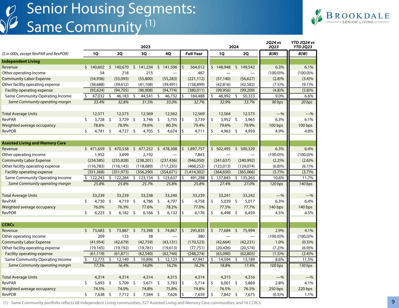 8 2023 2024 2Q24 vs 2Q23 YTD 2Q24 vs YTD 2Q23 ($ in 000s, except RevPAR and RevPOR) 1Q 2Q 3Q 4Q Full Year 1Q 2Q B(W) B(W) Revenue $ 685,944 $ 685,095 $ 691,884 $ 694,681 $ 2,757,604 $ 729,127 $ 725,865 6.0 % 6.1 % Other operating income 2,215 4,050 2,445 — 8,710 — — (100.0) % (100.0) % Community Labor Expense (331,475) (333,600) (336,760) (335,850) (1,337,685) (341,441) (339,850) (1.9) % (2.4) % % of revenue 48.3 % 48.7 % 48.7 % 48.3 % 48.5 % 46.8 % 46.8 % 190 bps 170 bps Other facility operating expense (174,636) (174,949) (178,978) (176,339) (704,902) (186,255) (187,230) (7.0) % (6.8) % % of revenue 25.5 % 25.5 % 25.8 % 25.4 % 25.6 % 25.6 % 25.8 % (30) bps (20) bps Facility operating expense (2) (506,111) (508,549) (515,738) (512,189) (2,042,587) (527,696) (527,080) (3.6) % (4.0) % Same Community Operating Income $ 182,048 $ 180,596 $ 178,591 $ 182,492 $ 723,727 $ 201,431 $ 198,785 10.1 % 10.4 % Same Community adjusted operating income (3) $ 179,833 $ 176,546 $ 176,146 $ 182,492 $ 715,017 $ 201,431 $ 198,785 12.6 % 12.3 % Same Community operating margin 26.5 % 26.2 % 25.7 % 26.3 % 26.2 % 27.6 % 27.4 % 120 bps 120 bps Same Community adjusted operating margin(3) 26.2 % 25.8 % 25.5 % 26.3 % 25.9 % 27.6 % 27.4 % 160 bps 150 bps Total Average Units 50,124 50,126 50,121 50,117 50,122 50,120 50,131 — % — % RevPAR $ 4,562 $ 4,556 $ 4,601 $ 4,620 $ 4,585 $ 4,849 $ 4,826 5.9 % 6.1 % Weighted average occupancy 76.5 % 76.8 % 77.9 % 78.5 % 77.4 % 78.0 % 78.1 % 130 bps 140 bps RevPOR $ 5,960 $ 5,934 $ 5,909 $ 5,883 $ 5,922 $ 6,218 $ 6,177 4.1 % 4.2 % Same Community Operating Income ($ in millions) $182.0 $180.6 $178.6 $182.5 $201.4 $198.8 1Q 2023 2Q 2023 3Q 2023 4Q 2023 1Q 2024 2Q 2024 Same Community RevPAR / Weighted Average Occupancy $4,562 $4,556 $4,601 $4,620 $4,849 $4,826 76.5% 76.8% 77.9% 78.5% 78.0% 78.1% RevPAR Weighted Average Occupancy 1Q 2023 2Q 2023 3Q 2023 4Q 2023 1Q 2024 2Q 2024 Senior Housing: Same Community (1) (1) Same Community portfolio reflects 611 communities which represents 98.7% of the Company's total consolidated communities. (2) Excludes natural disaster expense, consisting primarily of remediation of storm damage, net of related insurance recoveries, of $0.1 million and $2.8 million for the full year 2023 and the first half of 2024, respectively. (3) Excludes other operating income. (2)