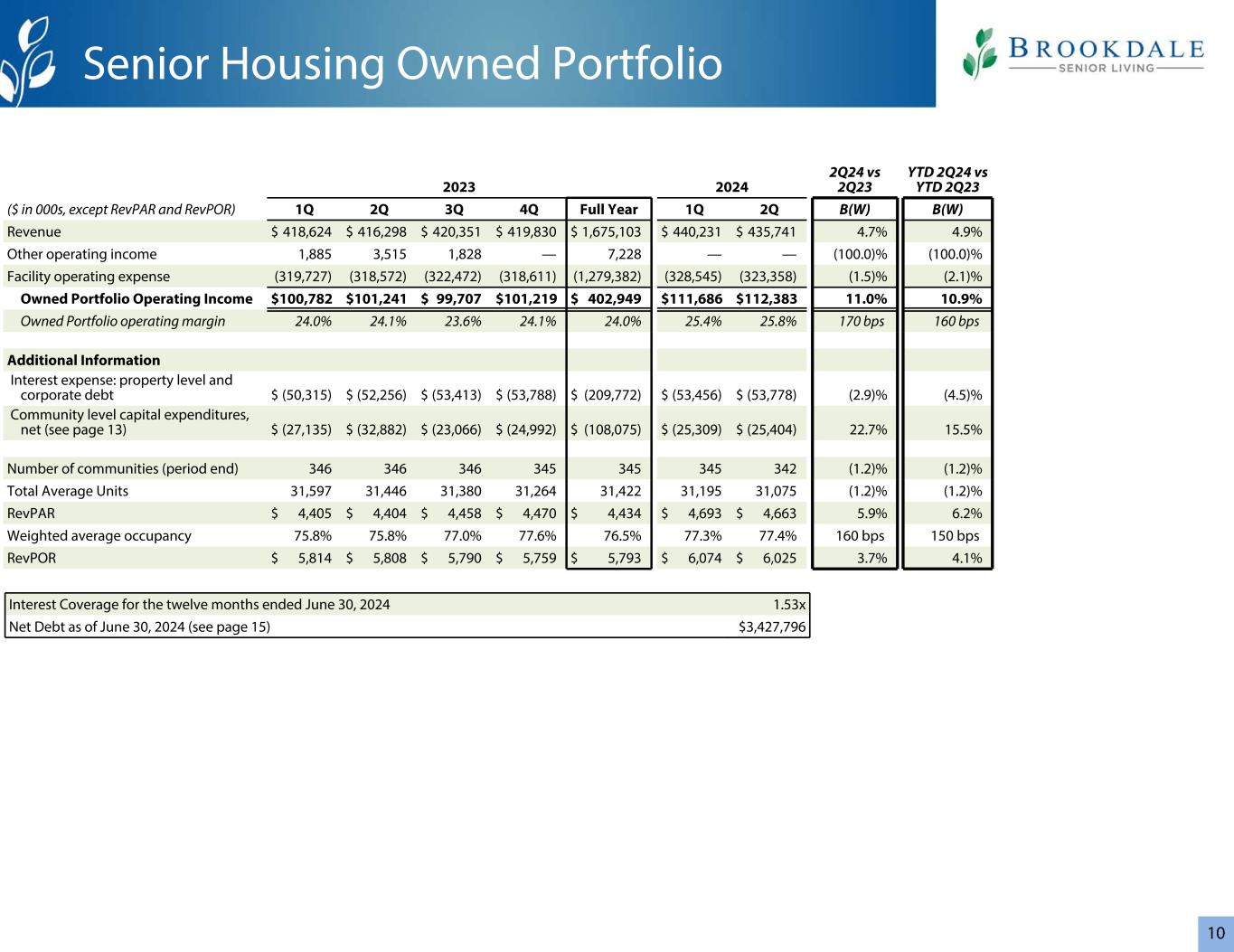 9 2023 2024 2Q24 vs 2Q23 YTD 2Q24 vs YTD 2Q23 ($ in 000s, except RevPAR and RevPOR) 1Q 2Q 3Q 4Q Full Year 1Q 2Q B(W) B(W) Independent Living Revenue $ 140,602 $ 140,670 $ 141,234 $ 141,506 $ 564,012 $ 148,948 $ 149,542 6.3 % 6.1 % Other operating income 54 218 215 — 487 — — (100.0) % (100.0) % Community Labor Expense (54,936) (55,093) (55,800) (55,283) (221,112) (57,140) (56,627) (2.8) % (3.4) % Other facility operating expense (38,688) (39,612) (41,108) (39,491) (158,899) (42,816) (42,582) (7.5) % (9.1) % Facility operating expense (93,624) (94,705) (96,908) (94,774) (380,011) (99,956) (99,209) (4.8) % (5.8) % Same Community Operating Income $ 47,032 $ 46,183 $ 44,541 $ 46,732 $ 184,488 $ 48,992 $ 50,333 9.0 % 6.6 % Same Community operating margin 33.4 % 32.8 % 31.5 % 33.0 % 32.7 % 32.9 % 33.7 % 90 bps 20 bps Total Average Units 12,571 12,573 12,569 12,562 12,569 12,564 12,573 — % — % RevPAR $ 3,728 $ 3,729 $ 3,746 $ 3,755 $ 3,739 $ 3,952 $ 3,965 6.3 % 6.1 % Weighted average occupancy 78.6 % 78.9 % 79.6 % 80.3 % 79.4 % 79.6 % 79.9 % 100 bps 100 bps RevPOR $ 4,741 $ 4,727 $ 4,705 $ 4,674 $ 4,711 $ 4,963 $ 4,959 4.9 % 4.8 % Assisted Living and Memory Care Revenue $ 471,659 $ 470,538 $ 477,252 $ 478,308 $ 1,897,757 $ 502,495 $ 500,329 6.3 % 6.4 % Other operating income 1,952 3,699 2,192 — 7,843 — — (100.0) % (100.0) % Community Labor Expense (234,585) (235,828) (238,201) (237,436) (946,050) (241,637) (240,992) (2.2) % (2.6) % Other facility operating expense (116,783) (116,145) (118,089) (117,235) (468,252) (123,013) (124,074) (6.8) % (6.1) % Facility operating expense (351,368) (351,973) (356,290) (354,671) (1,414,302) (364,650) (365,066) (3.7) % (3.7) % Same Community Operating Income $ 122,243 $ 122,264 $ 123,154 $ 123,637 $ 491,298 $ 137,845 $ 135,263 10.6 % 11.7 % Same Community operating margin 25.8 % 25.8 % 25.7 % 25.8 % 25.8 % 27.4 % 27.0 % 120 bps 140 bps Total Average Units 33,239 33,239 33,238 33,240 33,239 33,241 33,242 — % — % RevPAR $ 4,730 $ 4,719 $ 4,786 $ 4,797 $ 4,758 $ 5,039 $ 5,017 6.3 % 6.4 % Weighted average occupancy 76.0 % 76.3 % 77.6 % 78.2 % 77.0 % 77.5 % 77.7 % 140 bps 140 bps RevPOR $ 6,223 $ 6,182 $ 6,166 $ 6,132 $ 6,176 $ 6,498 $ 6,459 4.5 % 4.5 % CCRCs Revenue $ 73,683 $ 73,887 $ 73,398 $ 74,867 $ 295,835 $ 77,684 $ 75,994 2.9 % 4.1 % Other operating income 209 133 38 — 380 — — (100.0) % (100.0) % Community Labor Expense (41,954) (42,679) (42,759) (43,131) (170,523) (42,664) (42,231) 1.0 % (0.3) % Other facility operating expense (19,165) (19,192) (19,781) (19,613) (77,751) (20,426) (20,574) (7.2) % (6.9) % Facility operating expense (61,119) (61,871) (62,540) (62,744) (248,274) (63,090) (62,805) (1.5) % (2.4) % Same Community Operating Income $ 12,773 $ 12,149 $ 10,896 $ 12,123 $ 47,941 $ 14,594 $ 13,189 8.6 % 11.5 % Same Community operating margin 17.3 % 16.4 % 14.8 % 16.2 % 16.2 % 18.8 % 17.4 % 100 bps 130 bps Total Average Units 4,314 4,314 4,314 4,315 4,314 4,315 4,316 — % — % RevPAR $ 5,693 $ 5,709 $ 5,671 $ 5,783 $ 5,714 $ 6,001 $ 5,869 2.8 % 4.1 % Weighted average occupancy 74.5 % 74.0 % 74.8 % 75.8 % 74.8 % 76.5 % 76.5 % 250 bps 220 bps RevPOR $ 7,638 $ 7,712 $ 7,584 $ 7,626 $ 7,639 $ 7,842 $ 7,675 (0.5) % 1.1 % Senior Housing Segments: Same Community (1) (1) Same Community portfolio reflects 68 Independent Living communities, 527 Assisted Living and Memory Care communities, and 16 CCRCs.