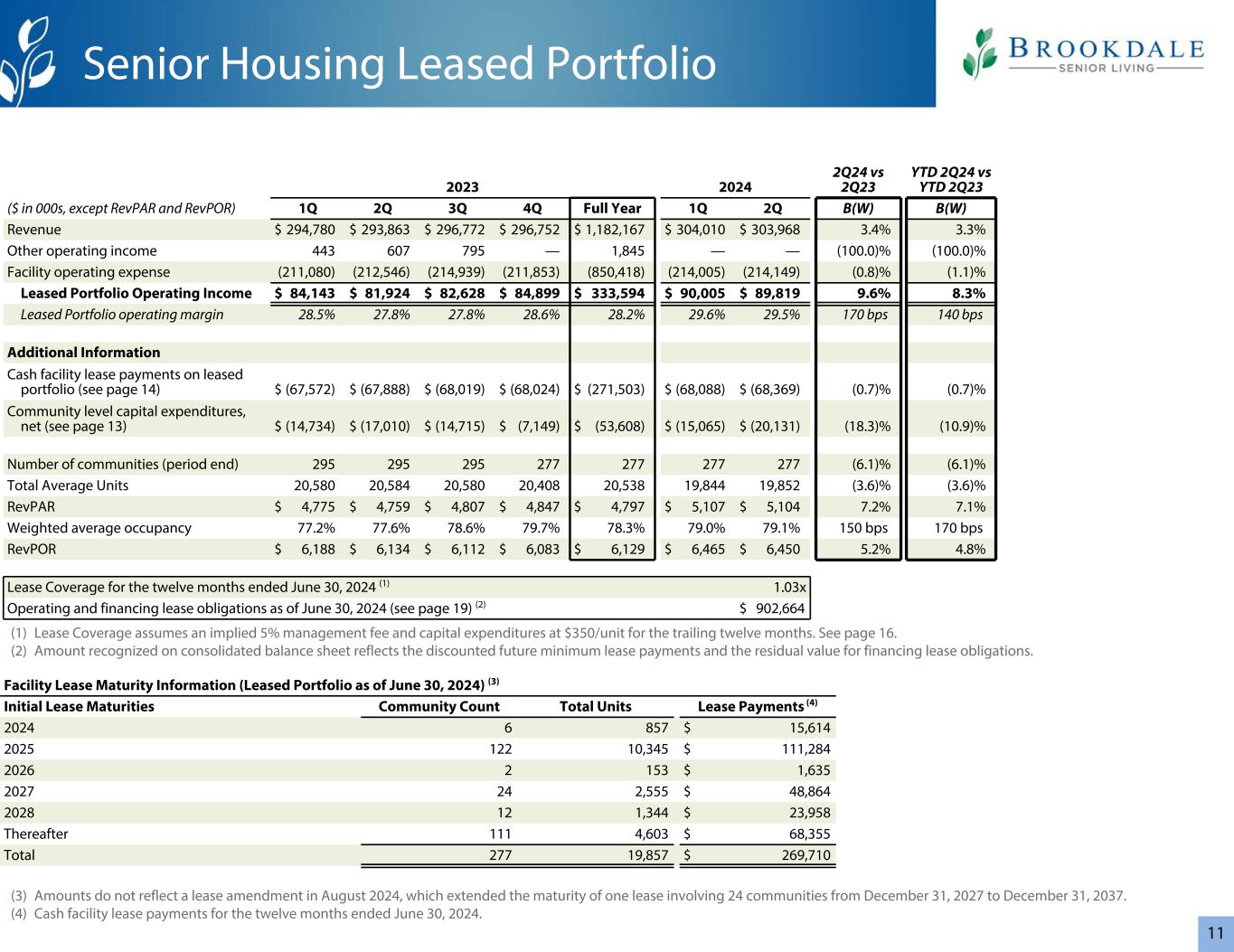 10 2023 2024 2Q24 vs 2Q23 YTD 2Q24 vs YTD 2Q23 ($ in 000s, except RevPAR and RevPOR) 1Q 2Q 3Q 4Q Full Year 1Q 2Q B(W) B(W) Revenue $ 418,624 $ 416,298 $ 420,351 $ 419,830 $ 1,675,103 $ 440,231 $ 435,741 4.7 % 4.9 % Other operating income 1,885 3,515 1,828 — 7,228 — — (100.0) % (100.0) % Facility operating expense (319,727) (318,572) (322,472) (318,611) (1,279,382) (328,545) (323,358) (1.5) % (2.1) % Owned Portfolio Operating Income $ 100,782 $ 101,241 $ 99,707 $ 101,219 $ 402,949 $ 111,686 $ 112,383 11.0 % 10.9 % Owned Portfolio operating margin 24.0 % 24.1 % 23.6 % 24.1 % 24.0 % 25.4 % 25.8 % 170 bps 160 bps Additional Information Interest expense: property level and corporate debt $ (50,315) $ (52,256) $ (53,413) $ (53,788) $ (209,772) $ (53,456) $ (53,778) (2.9) % (4.5) % Community level capital expenditures, net (see page 13) $ (27,135) $ (32,882) $ (23,066) $ (24,992) $ (108,075) $ (25,309) $ (25,404) 22.7 % 15.5 % Number of communities (period end) 346 346 346 345 345 345 342 (1.2) % (1.2) % Total Average Units 31,597 31,446 31,380 31,264 31,422 31,195 31,075 (1.2) % (1.2) % RevPAR $ 4,405 $ 4,404 $ 4,458 $ 4,470 $ 4,434 $ 4,693 $ 4,663 5.9 % 6.2 % Weighted average occupancy 75.8 % 75.8 % 77.0 % 77.6 % 76.5 % 77.3 % 77.4 % 160 bps 150 bps RevPOR $ 5,814 $ 5,808 $ 5,790 $ 5,759 $ 5,793 $ 6,074 $ 6,025 3.7 % 4.1 % Senior Housing Owned Portfolio Interest Coverage for the twelve months ended June 30, 2024 1.53x Net Debt as of June 30, 2024 (see page 15) $3,427,796