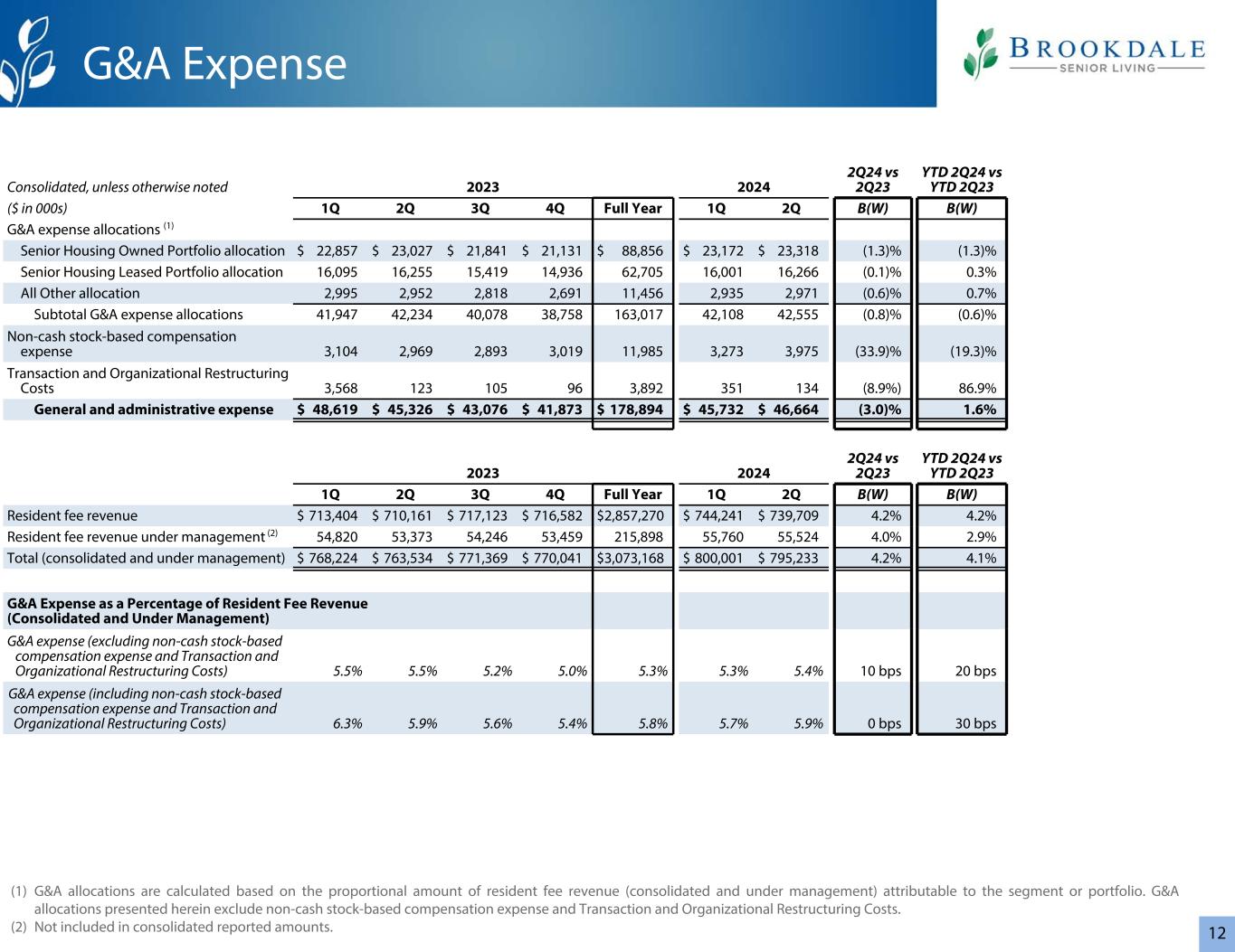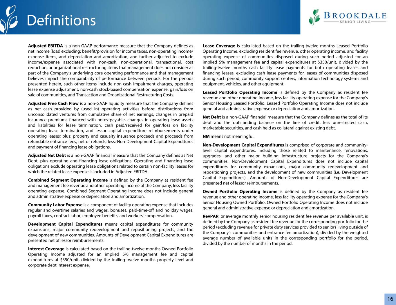 17 RevPOR, or average monthly senior housing resident fee revenue per occupied unit, is defined by the Company as resident fee revenue for the corresponding portfolio for the period (excluding revenue for private duty services provided to seniors living outside of the Company's communities and entrance fee amortization), divided by the weighted average number of occupied units in the corresponding portfolio for the period, divided by the number of months in the period. Same Community information reflects operating results and data of a consistent population of communities by excluding the impact of changes in the composition of the Company's portfolio of communities. The operating results exclude natural disaster expense and related insurance recoveries. The Company defines its same community portfolio as communities consolidated and operational for the full period in both comparison years. Consolidated communities excluded from the same community portfolio include communities acquired or disposed of since the beginning of the prior year, communities classified as assets held for sale, certain communities planned for disposition, certain communities that have undergone or are undergoing expansion, redevelopment, and repositioning projects, and certain communities that have experienced a casualty event that significantly impacts their operations. Same Community Operating Income is defined by the Company as resident fee revenue and other operating income, less facility operating expense (excluding natural disaster expense and related insurance recoveries) for the Company's Same Community portfolio. Same Community Operating Income does not include general and administrative expense or depreciation and amortization. Segment Operating Income is defined by the Company as segment revenue and other operating income less segment facility operating expense. Segment Operating Income does not include general and administrative expense or depreciation and amortization. All Other Segment Operating Income consists primarily of the previously reported Management Services segment and excludes revenue for reimbursements for which the Company is the primary obligor of costs incurred on behalf of managed communities, and there is no facility operating expense associated with the All Other category. See the Segment Information note to the Company’s consolidated financial statements for more information regarding the Company’s segments. Senior Housing Leased Portfolio represents Brookdale leased communities and does not include owned or managed communities. Senior Housing Operating Income is defined by the Company as segment revenue and other operating income less segment facility operating expense for the Company’s Independent Living, Assisted Living and Memory Care, and CCRCs segments on an aggregate basis. Senior Housing Operating Income does not include general and administrative expense or depreciation and amortization. Senior Housing Owned Portfolio represents Brookdale owned communities and does not include leased or managed communities. Total Average Units represents the average number of units operated during the period. Transaction and Organizational Restructuring Costs are general and administrative expenses. Transaction costs include those directly related to acquisition, disposition, financing, and leasing activity, and are primarily comprised of legal, finance, consulting, professional fees, and other third-party costs. Organizational restructuring costs include those related to the Company’s efforts to reduce general and administrative expense and its senior leadership changes, including severance. Definitions