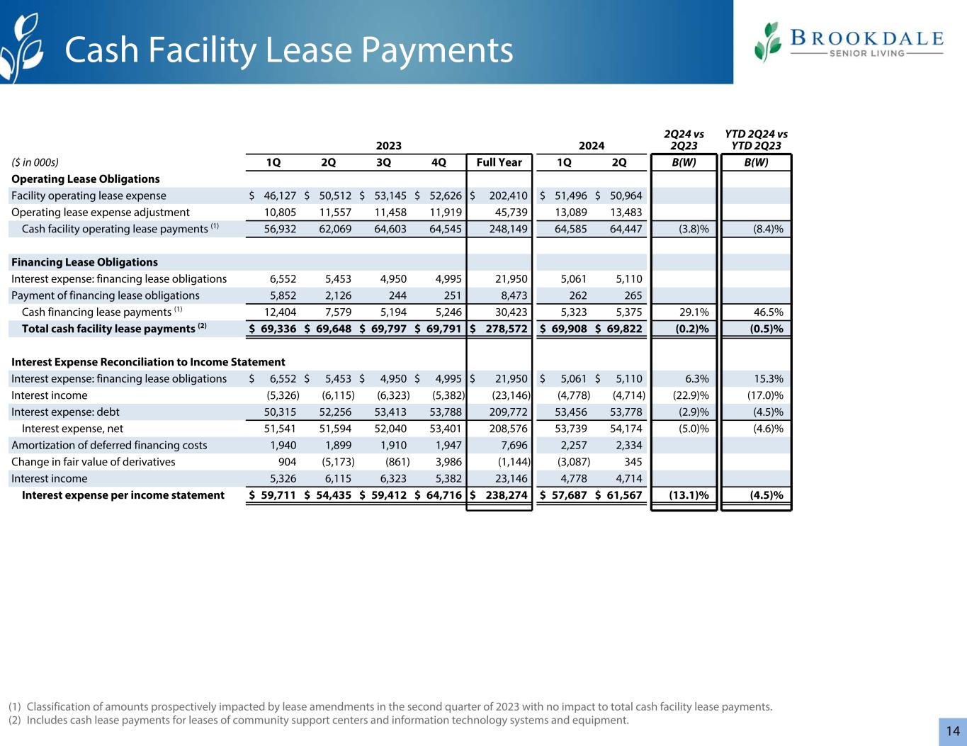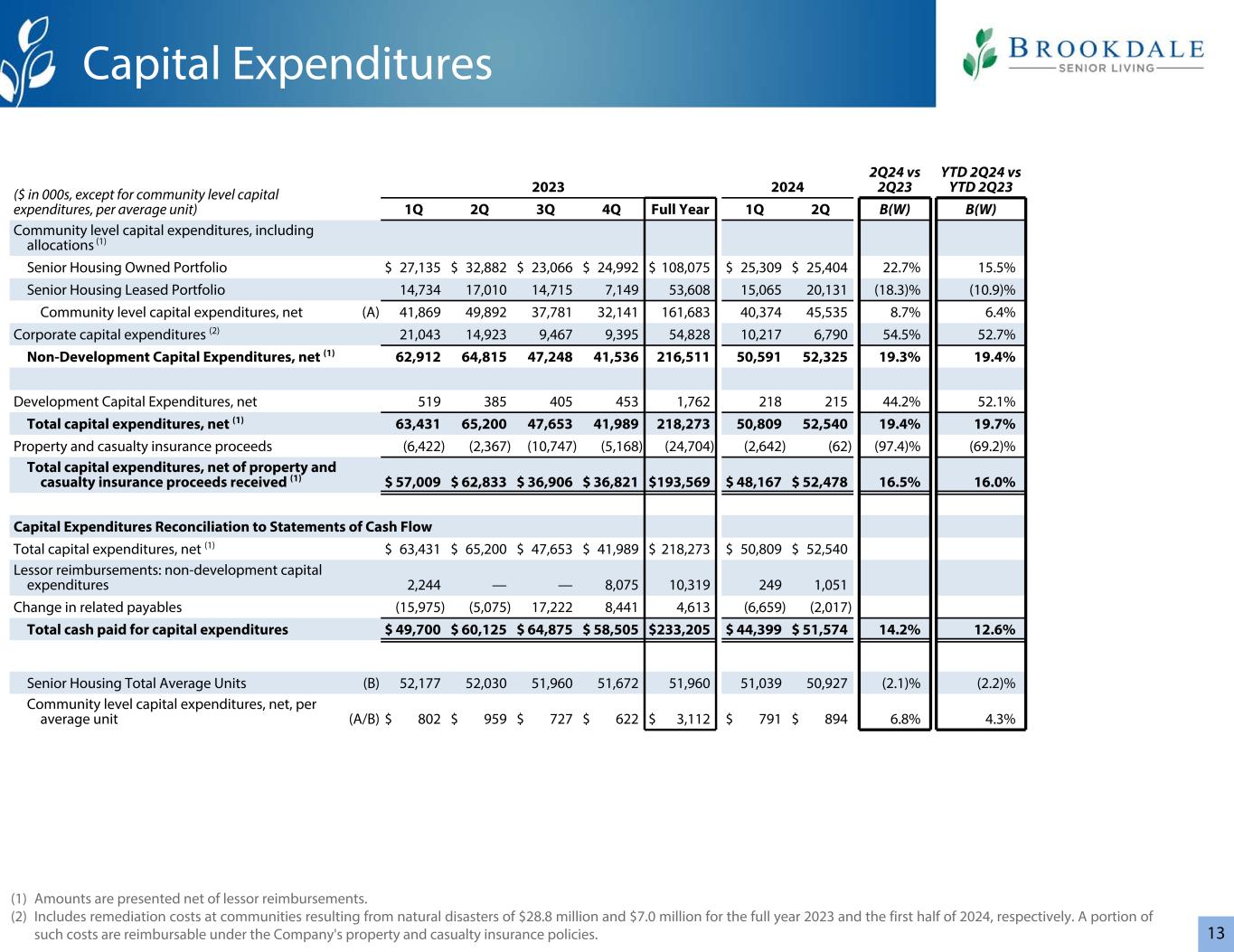 13 ($ in 000s, except for community level capital expenditures, per average unit) 2023 2024 2Q24 vs 2Q23 YTD 2Q24 vs YTD 2Q23 1Q 2Q 3Q 4Q Full Year 1Q 2Q B(W) B(W) Community level capital expenditures, including allocations (1) Senior Housing Owned Portfolio $ 27,135 $ 32,882 $ 23,066 $ 24,992 $ 108,075 $ 25,309 $ 25,404 22.7 % 15.5 % Senior Housing Leased Portfolio 14,734 17,010 14,715 7,149 53,608 15,065 20,131 (18.3) % (10.9) % Community level capital expenditures, net (A) 41,869 49,892 37,781 32,141 161,683 40,374 45,535 8.7 % 6.4 % Corporate capital expenditures (2) 21,043 14,923 9,467 9,395 54,828 10,217 6,790 54.5 % 52.7 % Non-Development Capital Expenditures, net (1) 62,912 64,815 47,248 41,536 216,511 50,591 52,325 19.3 % 19.4 % Development Capital Expenditures, net 519 385 405 453 1,762 218 215 44.2 % 52.1 % Total capital expenditures, net (1) 63,431 65,200 47,653 41,989 218,273 50,809 52,540 19.4 % 19.7 % Property and casualty insurance proceeds (6,422) (2,367) (10,747) (5,168) (24,704) (2,642) (62) (97.4) % (69.2) % Total capital expenditures, net of property and casualty insurance proceeds received (1) $ 57,009 $ 62,833 $ 36,906 $ 36,821 $ 193,569 $ 48,167 $ 52,478 16.5 % 16.0 % Capital Expenditures Reconciliation to Statements of Cash Flow Total capital expenditures, net (1) $ 63,431 $ 65,200 $ 47,653 $ 41,989 $ 218,273 $ 50,809 $ 52,540 Lessor reimbursements: non-development capital expenditures 2,244 — — 8,075 10,319 249 1,051 Change in related payables (15,975) (5,075) 17,222 8,441 4,613 (6,659) (2,017) Total cash paid for capital expenditures $ 49,700 $ 60,125 $ 64,875 $ 58,505 $ 233,205 $ 44,399 $ 51,574 14.2 % 12.6 % Senior Housing Total Average Units (B) 52,177 52,030 51,960 51,672 51,960 51,039 50,927 (2.1) % (2.2) % Community level capital expenditures, net, per average unit (A/B) $ 802 $ 959 $ 727 $ 622 $ 3,112 $ 791 $ 894 6.8 % 4.3 % Capital Expenditures (1) Amounts are presented net of lessor reimbursements. (2) Includes remediation costs at communities resulting from natural disasters of $28.8 million and $7.0 million for the full year 2023 and the first half of 2024, respectively. A portion of such costs are reimbursable under the Company's property and casualty insurance policies.
