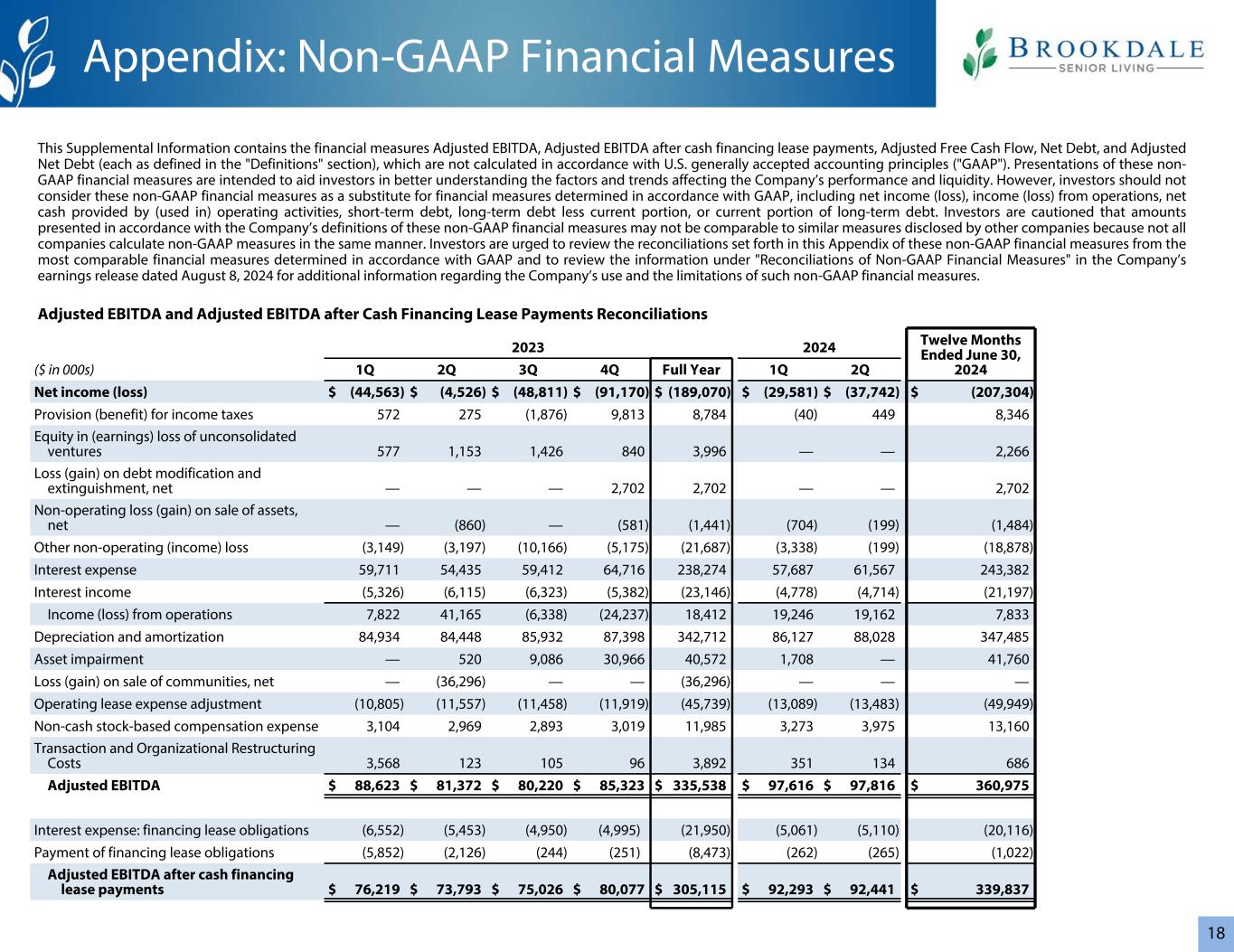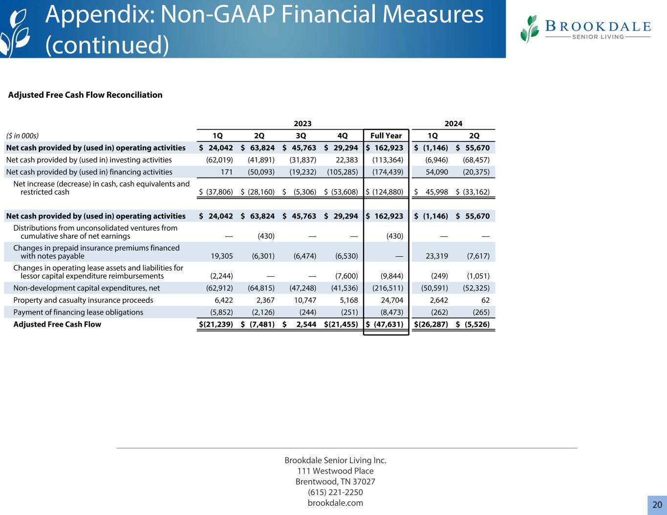 20 2023 2024 ($ in 000s) 1Q 2Q 3Q 4Q Full Year 1Q 2Q Net cash provided by (used in) operating activities $ 24,042 $ 63,824 $ 45,763 $ 29,294 $ 162,923 $ (1,146) $ 55,670 Net cash provided by (used in) investing activities (62,019) (41,891) (31,837) 22,383 (113,364) (6,946) (68,457) Net cash provided by (used in) financing activities 171 (50,093) (19,232) (105,285) (174,439) 54,090 (20,375) Net increase (decrease) in cash, cash equivalents and restricted cash $ (37,806) $ (28,160) $ (5,306) $ (53,608) $ (124,880) $ 45,998 $ (33,162) Net cash provided by (used in) operating activities $ 24,042 $ 63,824 $ 45,763 $ 29,294 $ 162,923 $ (1,146) $ 55,670 Distributions from unconsolidated ventures from cumulative share of net earnings — (430) — — (430) — — Changes in prepaid insurance premiums financed with notes payable 19,305 (6,301) (6,474) (6,530) — 23,319 (7,617) Changes in operating lease assets and liabilities for lessor capital expenditure reimbursements (2,244) — — (7,600) (9,844) (249) (1,051) Non-development capital expenditures, net (62,912) (64,815) (47,248) (41,536) (216,511) (50,591) (52,325) Property and casualty insurance proceeds 6,422 2,367 10,747 5,168 24,704 2,642 62 Payment of financing lease obligations (5,852) (2,126) (244) (251) (8,473) (262) (265) Adjusted Free Cash Flow $ (21,239) $ (7,481) $ 2,544 $ (21,455) $ (47,631) $ (26,287) $ (5,526) Adjusted Free Cash Flow Reconciliation Appendix: Non-GAAP Financial Measures (continued) Brookdale Senior Living Inc. 111 Westwood Place Brentwood, TN 37027 (615) 221-2250 brookdale.com
