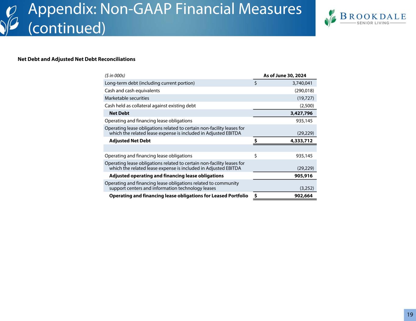 18 2023 2024 Twelve Months Ended June 30, 2024($ in 000s) 1Q 2Q 3Q 4Q Full Year 1Q 2Q Net income (loss) $ (44,563) $ (4,526) $ (48,811) $ (91,170) $ (189,070) $ (29,581) $ (37,742) $ (207,304) Provision (benefit) for income taxes 572 275 (1,876) 9,813 8,784 (40) 449 8,346 Equity in (earnings) loss of unconsolidated ventures 577 1,153 1,426 840 3,996 — — 2,266 Loss (gain) on debt modification and extinguishment, net — — — 2,702 2,702 — — 2,702 Non-operating loss (gain) on sale of assets, net — (860) — (581) (1,441) (704) (199) (1,484) Other non-operating (income) loss (3,149) (3,197) (10,166) (5,175) (21,687) (3,338) (199) (18,878) Interest expense 59,711 54,435 59,412 64,716 238,274 57,687 61,567 243,382 Interest income (5,326) (6,115) (6,323) (5,382) (23,146) (4,778) (4,714) (21,197) Income (loss) from operations 7,822 41,165 (6,338) (24,237) 18,412 19,246 19,162 7,833 Depreciation and amortization 84,934 84,448 85,932 87,398 342,712 86,127 88,028 347,485 Asset impairment — 520 9,086 30,966 40,572 1,708 — 41,760 Loss (gain) on sale of communities, net — (36,296) — — (36,296) — — — Operating lease expense adjustment (10,805) (11,557) (11,458) (11,919) (45,739) (13,089) (13,483) (49,949) Non-cash stock-based compensation expense 3,104 2,969 2,893 3,019 11,985 3,273 3,975 13,160 Transaction and Organizational Restructuring Costs 3,568 123 105 96 3,892 351 134 686 Adjusted EBITDA $ 88,623 $ 81,372 $ 80,220 $ 85,323 $ 335,538 $ 97,616 $ 97,816 $ 360,975 Interest expense: financing lease obligations (6,552) (5,453) (4,950) (4,995) (21,950) (5,061) (5,110) (20,116) Payment of financing lease obligations (5,852) (2,126) (244) (251) (8,473) (262) (265) (1,022) Adjusted EBITDA after cash financing lease payments $ 76,219 $ 73,793 $ 75,026 $ 80,077 $ 305,115 $ 92,293 $ 92,441 $ 339,837 Adjusted EBITDA and Adjusted EBITDA after Cash Financing Lease Payments Reconciliations Appendix: Non-GAAP Financial Measures This Supplemental Information contains the financial measures Adjusted EBITDA, Adjusted EBITDA after cash financing lease payments, Adjusted Free Cash Flow, Net Debt, and Adjusted Net Debt (each as defined in the "Definitions" section), which are not calculated in accordance with U.S. generally accepted accounting principles ("GAAP"). Presentations of these non- GAAP financial measures are intended to aid investors in better understanding the factors and trends affecting the Company’s performance and liquidity. However, investors should not consider these non-GAAP financial measures as a substitute for financial measures determined in accordance with GAAP, including net income (loss), income (loss) from operations, net cash provided by (used in) operating activities, short-term debt, long-term debt less current portion, or current portion of long-term debt. Investors are cautioned that amounts presented in accordance with the Company’s definitions of these non-GAAP financial measures may not be comparable to similar measures disclosed by other companies because not all companies calculate non-GAAP measures in the same manner. Investors are urged to review the reconciliations set forth in this Appendix of these non-GAAP financial measures from the most comparable financial measures determined in accordance with GAAP and to review the information under "Reconciliations of Non-GAAP Financial Measures" in the Company’s earnings release dated August 8, 2024 for additional information regarding the Company’s use and the limitations of such non-GAAP financial measures.