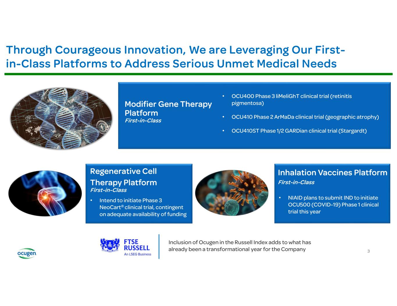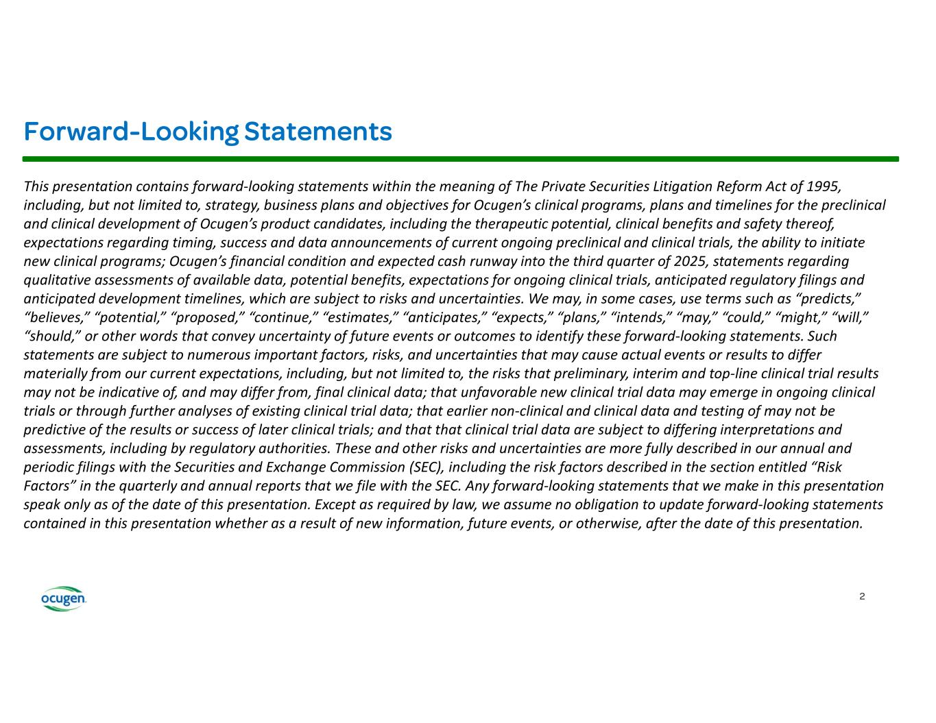 This presentation contains forward-looking statements within the meaning of The Private Securities Litigation Reform Act of 1995, including, but not limited to, strategy, business plans and objectives for Ocugen’s clinical programs, plans and timelines for the preclinical and clinical development of Ocugen’s product candidates, including the therapeutic potential, clinical benefits and safety thereof, expectations regarding timing, success and data announcements of current ongoing preclinical and clinical trials, the ability to initiate new clinical programs; Ocugen’s financial condition and expected cash runway into the third quarter of 2025, statements regarding qualitative assessments of available data, potential benefits, expectations for ongoing clinical trials, anticipated regulatory filings and anticipated development timelines, which are subject to risks and uncertainties. We may, in some cases, use terms such as “predicts,” “believes,” “potential,” “proposed,” “continue,” “estimates,” “anticipates,” “expects,” “plans,” “intends,” “may,” “could,” “might,” “will,” “should,” or other words that convey uncertainty of future events or outcomes to identify these forward-looking statements. Such statements are subject to numerous important factors, risks, and uncertainties that may cause actual events or results to differ materially from our current expectations, including, but not limited to, the risks that preliminary, interim and top-line clinical trial results may not be indicative of, and may differ from, final clinical data; that unfavorable new clinical trial data may emerge in ongoing clinical trials or through further analyses of existing clinical trial data; that earlier non-clinical and clinical data and testing of may not be predictive of the results or success of later clinical trials; and that that clinical trial data are subject to differing interpretations and assessments, including by regulatory authorities. These and other risks and uncertainties are more fully described in our annual and periodic filings with the Securities and Exchange Commission (SEC), including the risk factors described in the section entitled “Risk Factors” in the quarterly and annual reports that we file with the SEC. Any forward-looking statements that we make in this presentation speak only as of the date of this presentation. Except as required by law, we assume no obligation to update forward-looking statements contained in this presentation whether as a result of new information, future events, or otherwise, after the date of this presentation.