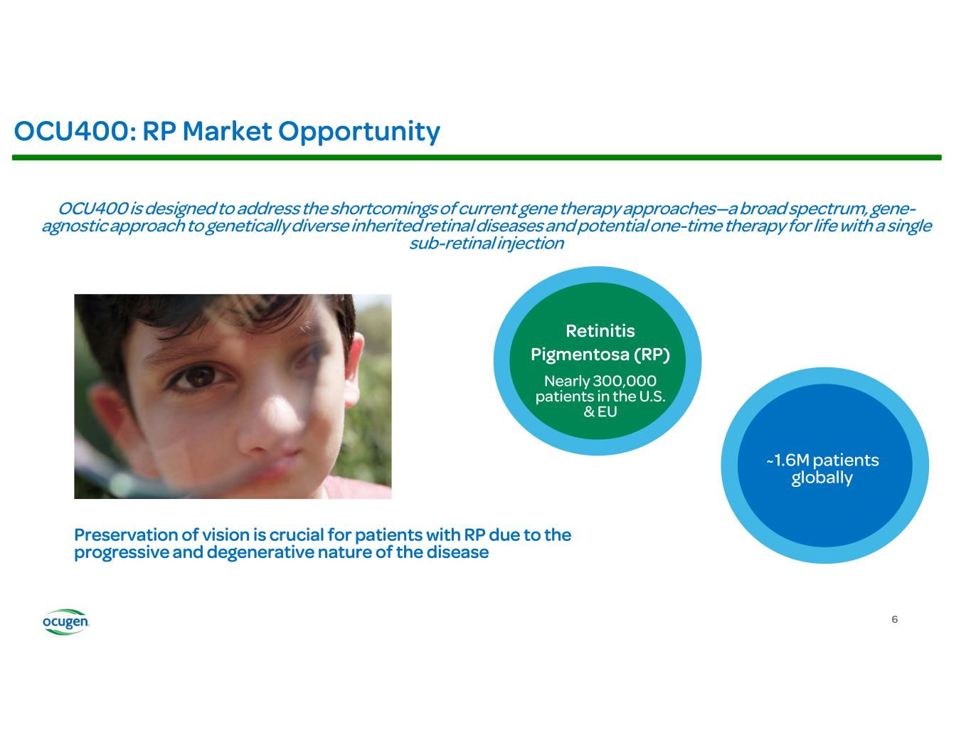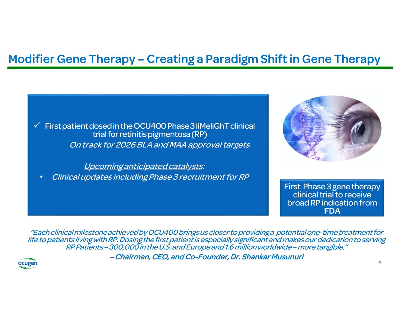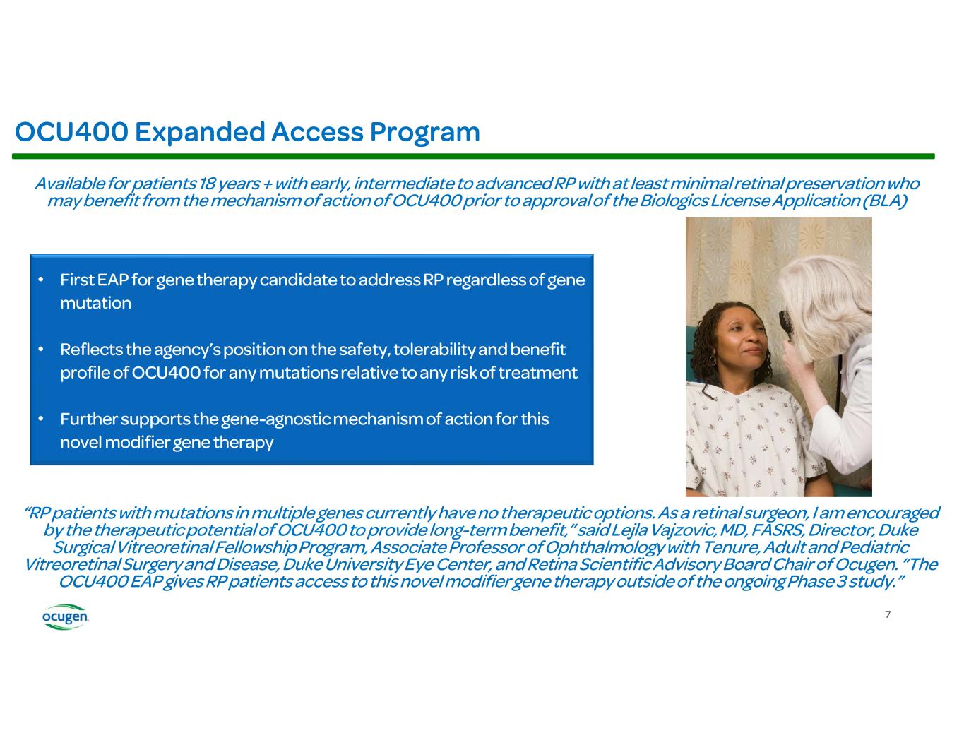 Recently, the FDA approved the OCU400 expanded access program (EAP) for the treatment of adult patients, aged 18 and older, with RP. This is the first ever gene therapy candidate to treat patients with RP, regardless of mutation, approved for an EAP and the EAP further supports the gene-agnostic mechanism of action for this novel modifier gene therapy.