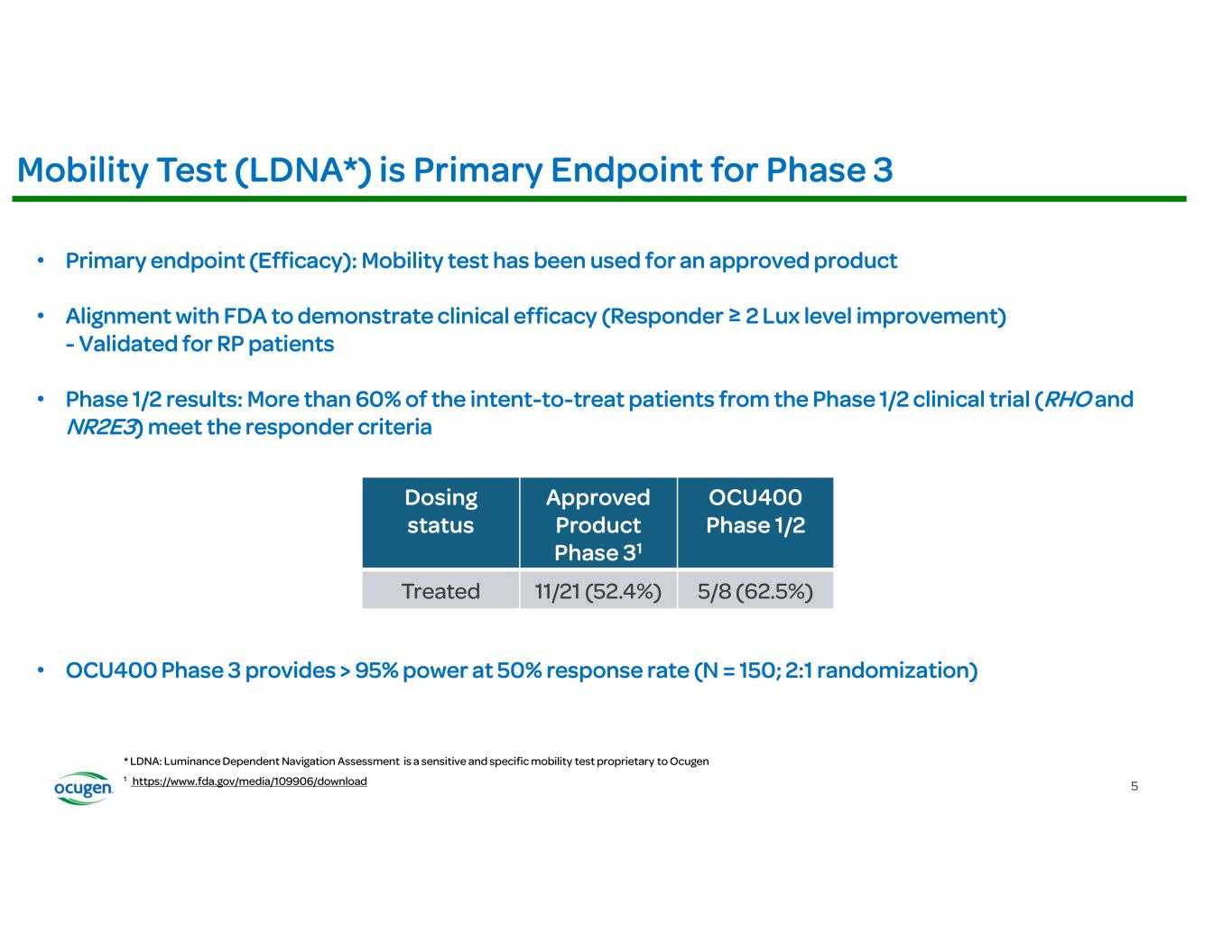 The OCU400 Phase 3 trial has a sample size of 150 participants: one arm has 75 participants with RHO gene mutations, and the other arm has 75 participants with mutations in any of several other genes associated with RP. The Luminance Dependent Navigation Assessment (LDNA) is the primary endpoint for the study. In this assessment, a participant navigates an obstacle course that constitutes a more sensitive and specific measurement of visual function than the mobility measurement used in previous Phase 3 clinical trials. The Phase 3 liMeliGhT trial will focus on the proportion of responders, in treated and untreated groups, who achieve an improvement of at least 2 Lux (light) levels from baseline in the study eyes. More than 60% of the intent-to-treat patients from the Phase 1/2 clinical trial, including patients with the RHO mutation, meet the responder criteria established for Phase 3. The Phase 3 mobility test responder rate for the only FDA-approved product to treat one mutation in RP was 52%. The Phase 3 trial is powered greater than 95% assuming a 50% responder rate.