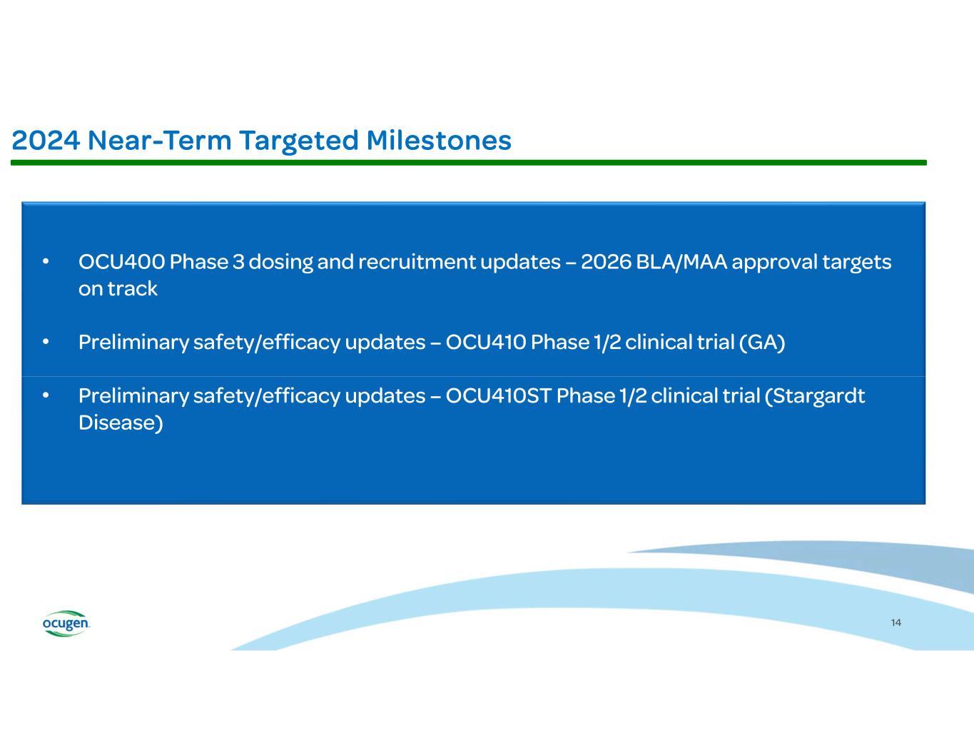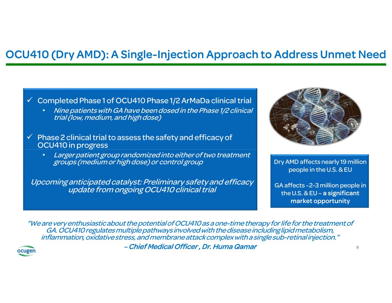 •OCU410 preliminary safety and efficacy data expected later this year