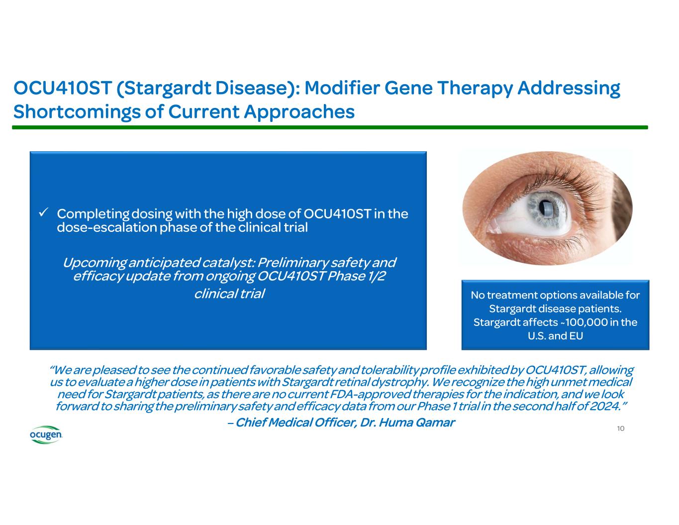 OCU410ST has received an Orphan Drug Designation from the FDA for the treatment of Stargardt disease, which has no approved treatment and affects approximately 100,000 people in the U.S. and Europe combined. The third cohort of the clinical trial is currently receiving the high dose. OCU410ST has the potential to be the first one-time gene therapy for Stargardt disease.