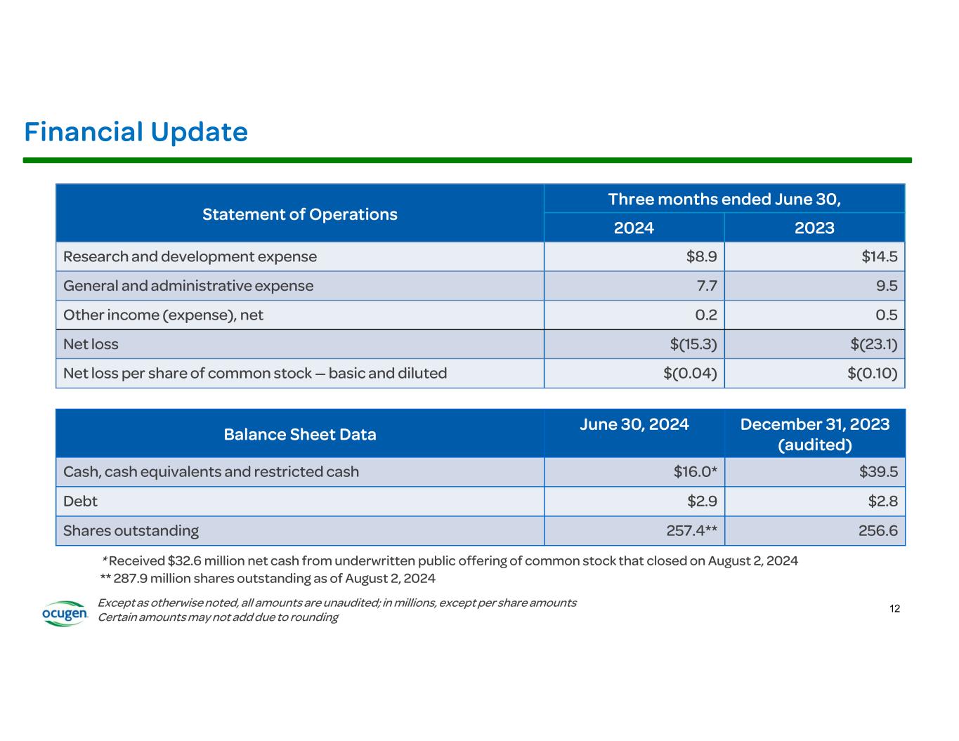 •Received $32.6 million net cash from underwritten public offering of common stock that closed on August 2, 2024.