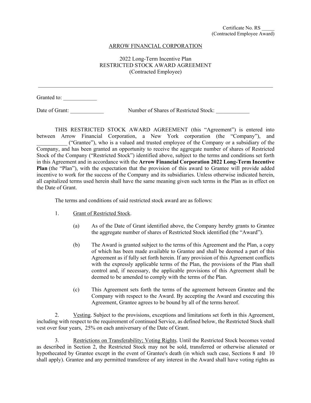 Certificate No. RS _____ (Contracted Employee Award) ARROW FINANCIAL CORPORATION 2022 Long-Term Incentive Plan RESTRICTED STOCK AWARD AGREEMENT (Contracted Employee) ____________________________________________________________________________________ Granted to: ____________ Date of Grant: ____________ Number of Shares of Restricted Stock: ____________ THIS RESTRICTED STOCK AWARD AGREEMENT (this “Agreement”) is entered into between Arrow Financial Corporation, a New York corporation (the “Company”), and ___________ (“Grantee”), who is a valued and trusted employee of the Company or a subsidiary of the Company, and has been granted an opportunity to receive the aggregate number of shares of Restricted Stock of the Company (“Restricted Stock”) identified above, subject to the terms and conditions set forth in this Agreement and in accordance with the Arrow Financial Corporation 2022 Long-Term Incentive Plan (the “Plan”), with the expectation that the provision of this award to Grantee will provide added incentive to work for the success of the Company and its subsidiaries. Unless otherwise indicated herein, all capitalized terms used herein shall have the same meaning given such terms in the Plan as in effect on the Date of Grant. The terms and conditions of said restricted stock award are as follows: 1. Grant of Restricted Stock. (a) As of the Date of Grant identified above, the Company hereby grants to Grantee the aggregate number of shares of Restricted Stock identified (the “Award”). (b) The Award is granted subject to the terms of this Agreement and the Plan, a copy of which has been made available to Grantee and shall be deemed a part of this Agreement as if fully set forth herein. If any provision of this Agreement conflicts with the expressly applicable terms of the Plan, the provisions of the Plan shall control and, if necessary, the applicable provisions of this Agreement shall be deemed to be amended to comply with the terms of the Plan. (c) This Agreement sets forth the terms of the agreement between Grantee and the Company with respect to the Award. By accepting the Award and executing this Agreement, Grantee agrees to be bound by all of the terms hereof. 2. Vesting. Subject to the provisions, exceptions and limitations set forth in this Agreement, including with respect to the requirement of continued Service, as defined below, the Restricted Stock shall vest over four years, 25% on each anniversary of the Date of Grant. 3. Restrictions on Transferability; Voting Rights. Until the Restricted Stock becomes vested as described in Section 2, the Restricted Stock may not be sold, transferred or otherwise alienated or hypothecated by Grantee except in the event of Grantee's death (in which such case, Sections 8 and 10 shall apply). Grantee and any permitted transferee of any interest in the Award shall have voting rights as