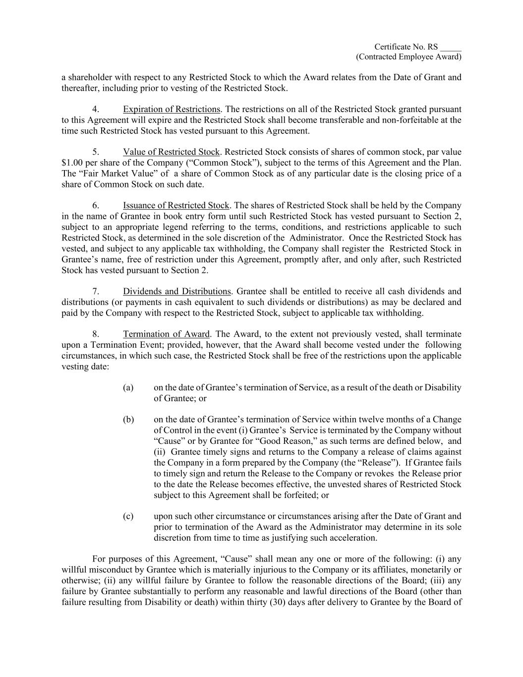 Certificate No. RS _____ (Contracted Employee Award) a shareholder with respect to any Restricted Stock to which the Award relates from the Date of Grant and thereafter, including prior to vesting of the Restricted Stock. 4. Expiration of Restrictions. The restrictions on all of the Restricted Stock granted pursuant to this Agreement will expire and the Restricted Stock shall become transferable and non-forfeitable at the time such Restricted Stock has vested pursuant to this Agreement. 5. Value of Restricted Stock. Restricted Stock consists of shares of common stock, par value $1.00 per share of the Company (“Common Stock”), subject to the terms of this Agreement and the Plan. The “Fair Market Value” of a share of Common Stock as of any particular date is the closing price of a share of Common Stock on such date. 6. Issuance of Restricted Stock. The shares of Restricted Stock shall be held by the Company in the name of Grantee in book entry form until such Restricted Stock has vested pursuant to Section 2, subject to an appropriate legend referring to the terms, conditions, and restrictions applicable to such Restricted Stock, as determined in the sole discretion of the Administrator. Once the Restricted Stock has vested, and subject to any applicable tax withholding, the Company shall register the Restricted Stock in Grantee’s name, free of restriction under this Agreement, promptly after, and only after, such Restricted Stock has vested pursuant to Section 2. 7. Dividends and Distributions. Grantee shall be entitled to receive all cash dividends and distributions (or payments in cash equivalent to such dividends or distributions) as may be declared and paid by the Company with respect to the Restricted Stock, subject to applicable tax withholding. 8. Termination of Award. The Award, to the extent not previously vested, shall terminate upon a Termination Event; provided, however, that the Award shall become vested under the following circumstances, in which such case, the Restricted Stock shall be free of the restrictions upon the applicable vesting date: (a) on the date of Grantee’s termination of Service, as a result of the death or Disability of Grantee; or (b) on the date of Grantee’s termination of Service within twelve months of a Change of Control in the event (i) Grantee’s Service is terminated by the Company without “Cause” or by Grantee for “Good Reason,” as such terms are defined below, and (ii) Grantee timely signs and returns to the Company a release of claims against the Company in a form prepared by the Company (the “Release”). If Grantee fails to timely sign and return the Release to the Company or revokes the Release prior to the date the Release becomes effective, the unvested shares of Restricted Stock subject to this Agreement shall be forfeited; or (c) upon such other circumstance or circumstances arising after the Date of Grant and prior to termination of the Award as the Administrator may determine in its sole discretion from time to time as justifying such acceleration. For purposes of this Agreement, “Cause” shall mean any one or more of the following: (i) any willful misconduct by Grantee which is materially injurious to the Company or its affiliates, monetarily or otherwise; (ii) any willful failure by Grantee to follow the reasonable directions of the Board; (iii) any failure by Grantee substantially to perform any reasonable and lawful directions of the Board (other than failure resulting from Disability or death) within thirty (30) days after delivery to Grantee by the Board of