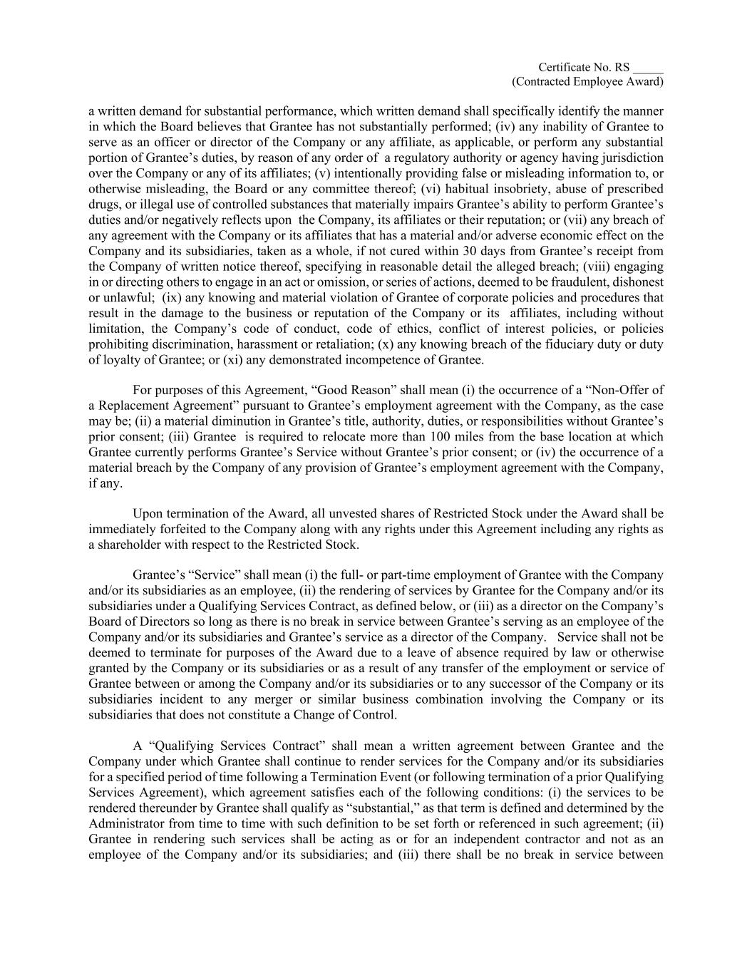 Certificate No. RS _____ (Contracted Employee Award) a written demand for substantial performance, which written demand shall specifically identify the manner in which the Board believes that Grantee has not substantially performed; (iv) any inability of Grantee to serve as an officer or director of the Company or any affiliate, as applicable, or perform any substantial portion of Grantee’s duties, by reason of any order of a regulatory authority or agency having jurisdiction over the Company or any of its affiliates; (v) intentionally providing false or misleading information to, or otherwise misleading, the Board or any committee thereof; (vi) habitual insobriety, abuse of prescribed drugs, or illegal use of controlled substances that materially impairs Grantee’s ability to perform Grantee’s duties and/or negatively reflects upon the Company, its affiliates or their reputation; or (vii) any breach of any agreement with the Company or its affiliates that has a material and/or adverse economic effect on the Company and its subsidiaries, taken as a whole, if not cured within 30 days from Grantee’s receipt from the Company of written notice thereof, specifying in reasonable detail the alleged breach; (viii) engaging in or directing others to engage in an act or omission, or series of actions, deemed to be fraudulent, dishonest or unlawful; (ix) any knowing and material violation of Grantee of corporate policies and procedures that result in the damage to the business or reputation of the Company or its affiliates, including without limitation, the Company’s code of conduct, code of ethics, conflict of interest policies, or policies prohibiting discrimination, harassment or retaliation; (x) any knowing breach of the fiduciary duty or duty of loyalty of Grantee; or (xi) any demonstrated incompetence of Grantee. For purposes of this Agreement, “Good Reason” shall mean (i) the occurrence of a “Non-Offer of a Replacement Agreement” pursuant to Grantee’s employment agreement with the Company, as the case may be; (ii) a material diminution in Grantee’s title, authority, duties, or responsibilities without Grantee’s prior consent; (iii) Grantee is required to relocate more than 100 miles from the base location at which Grantee currently performs Grantee’s Service without Grantee’s prior consent; or (iv) the occurrence of a material breach by the Company of any provision of Grantee’s employment agreement with the Company, if any. Upon termination of the Award, all unvested shares of Restricted Stock under the Award shall be immediately forfeited to the Company along with any rights under this Agreement including any rights as a shareholder with respect to the Restricted Stock. Grantee’s “Service” shall mean (i) the full- or part-time employment of Grantee with the Company and/or its subsidiaries as an employee, (ii) the rendering of services by Grantee for the Company and/or its subsidiaries under a Qualifying Services Contract, as defined below, or (iii) as a director on the Company’s Board of Directors so long as there is no break in service between Grantee’s serving as an employee of the Company and/or its subsidiaries and Grantee’s service as a director of the Company. Service shall not be deemed to terminate for purposes of the Award due to a leave of absence required by law or otherwise granted by the Company or its subsidiaries or as a result of any transfer of the employment or service of Grantee between or among the Company and/or its subsidiaries or to any successor of the Company or its subsidiaries incident to any merger or similar business combination involving the Company or its subsidiaries that does not constitute a Change of Control. A “Qualifying Services Contract” shall mean a written agreement between Grantee and the Company under which Grantee shall continue to render services for the Company and/or its subsidiaries for a specified period of time following a Termination Event (or following termination of a prior Qualifying Services Agreement), which agreement satisfies each of the following conditions: (i) the services to be rendered thereunder by Grantee shall qualify as “substantial,” as that term is defined and determined by the Administrator from time to time with such definition to be set forth or referenced in such agreement; (ii) Grantee in rendering such services shall be acting as or for an independent contractor and not as an employee of the Company and/or its subsidiaries; and (iii) there shall be no break in service between