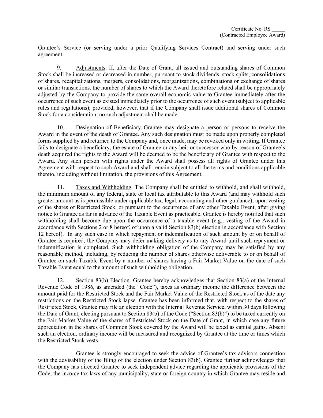 Certificate No. RS _____ (Contracted Employee Award) Grantee’s Service (or serving under a prior Qualifying Services Contract) and serving under such agreement. 9. Adjustments. If, after the Date of Grant, all issued and outstanding shares of Common Stock shall be increased or decreased in number, pursuant to stock dividends, stock splits, consolidations of shares, recapitalizations, mergers, consolidations, reorganizations, combinations or exchange of shares or similar transactions, the number of shares to which the Award theretofore related shall be appropriately adjusted by the Company to provide the same overall economic value to Grantee immediately after the occurrence of such event as existed immediately prior to the occurrence of such event (subject to applicable rules and regulations); provided, however, that if the Company shall issue additional shares of Common Stock for a consideration, no such adjustment shall be made. 10. Designation of Beneficiary. Grantee may designate a person or persons to receive the Award in the event of the death of Grantee. Any such designation must be made upon properly completed forms supplied by and returned to the Company and, once made, may be revoked only in writing. If Grantee fails to designate a beneficiary, the estate of Grantee or any heir or successor who by reason of Grantee’s death acquired the rights to the Award will be deemed to be the beneficiary of Grantee with respect to the Award. Any such person with rights under the Award shall possess all rights of Grantee under this Agreement with respect to such Award and shall remain subject to all the terms and conditions applicable thereto, including without limitation, the provisions of this Agreement. 11. Taxes and Withholding. The Company shall be entitled to withhold, and shall withhold, the minimum amount of any federal, state or local tax attributable to this Award (and may withhold such greater amount as is permissible under applicable tax, legal, accounting and other guidance), upon vesting of the shares of Restricted Stock, or pursuant to the occurrence of any other Taxable Event, after giving notice to Grantee as far in advance of the Taxable Event as practicable. Grantee is hereby notified that such withholding shall become due upon the occurrence of a taxable event (e.g., vesting of the Award in accordance with Sections 2 or 8 hereof, of upon a valid Section 83(b) election in accordance with Section 12 hereof). In any such case in which repayment or indemnification of such amount by or on behalf of Grantee is required, the Company may defer making delivery as to any Award until such repayment or indemnification is completed. Such withholding obligation of the Company may be satisfied by any reasonable method, including, by reducing the number of shares otherwise deliverable to or on behalf of Grantee on such Taxable Event by a number of shares having a Fair Market Value on the date of such Taxable Event equal to the amount of such withholding obligation. 12. Section 83(b) Election. Grantee hereby acknowledges that Section 83(a) of the Internal Revenue Code of 1986, as amended (the “Code”), taxes as ordinary income the difference between the amount paid for the Restricted Stock and the Fair Market Value of the Restricted Stock as of the date any restrictions on the Restricted Stock lapse. Grantee has been informed that, with respect to the shares of Restricted Stock, Grantee may file an election with the Internal Revenue Service, within 30 days following the Date of Grant, electing pursuant to Section 83(b) of the Code (“Section 83(b)”) to be taxed currently on the Fair Market Value of the shares of Restricted Stock on the Date of Grant, in which case any future appreciation in the shares of Common Stock covered by the Award will be taxed as capital gains. Absent such an election, ordinary income will be measured and recognized by Grantee at the time or times which the Restricted Stock vests. Grantee is strongly encouraged to seek the advice of Grantee’s tax advisors connection with the advisability of the filing of the election under Section 83(b). Grantee further acknowledges that the Company has directed Grantee to seek independent advice regarding the applicable provisions of the Code, the income tax laws of any municipality, state or foreign country in which Grantee may reside and