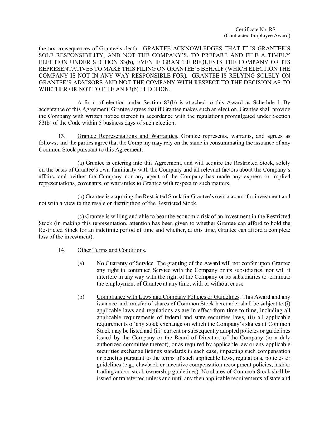 Certificate No. RS _____ (Contracted Employee Award) the tax consequences of Grantee’s death. GRANTEE ACKNOWLEDGES THAT IT IS GRANTEE’S SOLE RESPONSIBILITY, AND NOT THE COMPANY’S, TO PREPARE AND FILE A TIMELY ELECTION UNDER SECTION 83(b), EVEN IF GRANTEE REQUESTS THE COMPANY OR ITS REPRESENTATIVES TO MAKE THIS FILING ON GRANTEE’S BEHALF (WHICH ELECTION THE COMPANY IS NOT IN ANY WAY RESPONSIBLE FOR). GRANTEE IS RELYING SOLELY ON GRANTEE’S ADVISORS AND NOT THE COMPANY WITH RESPECT TO THE DECISION AS TO WHETHER OR NOT TO FILE AN 83(b) ELECTION. A form of election under Section 83(b) is attached to this Award as Schedule I. By acceptance of this Agreement, Grantee agrees that if Grantee makes such an election, Grantee shall provide the Company with written notice thereof in accordance with the regulations promulgated under Section 83(b) of the Code within 5 business days of such election. 13. Grantee Representations and Warranties. Grantee represents, warrants, and agrees as follows, and the parties agree that the Company may rely on the same in consummating the issuance of any Common Stock pursuant to this Agreement: (a) Grantee is entering into this Agreement, and will acquire the Restricted Stock, solely on the basis of Grantee’s own familiarity with the Company and all relevant factors about the Company’s affairs, and neither the Company nor any agent of the Company has made any express or implied representations, covenants, or warranties to Grantee with respect to such matters. (b) Grantee is acquiring the Restricted Stock for Grantee’s own account for investment and not with a view to the resale or distribution of the Restricted Stock. (c) Grantee is willing and able to bear the economic risk of an investment in the Restricted Stock (in making this representation, attention has been given to whether Grantee can afford to hold the Restricted Stock for an indefinite period of time and whether, at this time, Grantee can afford a complete loss of the investment). 14. Other Terms and Conditions. (a) No Guaranty of Service. The granting of the Award will not confer upon Grantee any right to continued Service with the Company or its subsidiaries, nor will it interfere in any way with the right of the Company or its subsidiaries to terminate the employment of Grantee at any time, with or without cause. (b) Compliance with Laws and Company Policies or Guidelines. This Award and any issuance and transfer of shares of Common Stock hereunder shall be subject to (i) applicable laws and regulations as are in effect from time to time, including all applicable requirements of federal and state securities laws, (ii) all applicable requirements of any stock exchange on which the Company’s shares of Common Stock may be listed and (iii) current or subsequently adopted policies or guidelines issued by the Company or the Board of Directors of the Company (or a duly authorized committee thereof), or as required by applicable law or any applicable securities exchange listings standards in each case, impacting such compensation or benefits pursuant to the terms of such applicable laws, regulations, policies or guidelines (e.g., clawback or incentive compensation recoupment policies, insider trading and/or stock ownership guidelines). No shares of Common Stock shall be issued or transferred unless and until any then applicable requirements of state and